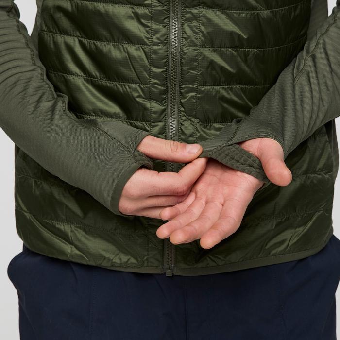 This jacket simplifies layering during brisk adventures. Its synthetic PrimaLoft® Gold P.U.R.E. (Produced Using Reduced Emissions) Insulation helps regulate your temperature, while stretch paneling in the sleeves and knit side panels make quick movements easy.DescriptionRun, hike, and seek adventure in this movement-ready, hybrid layerHow it fitsSlim FitFeaturesRecycled PrimaLoft® Gold P.U.R.E. InsulationKnit side panels & sleevesThumbholes for extra coverageElastic binding at cuffs, and hemPacks inside its own interior chest pocket2 zippered hand pocketsMaterialsShell & lining: 100% recycled 20D ripstop nylon with C0 DWR finish (40gsm) Side panels & sleeves: 97% recycled polyester, 3% spandex (200gsm)Insulation: Recycled synthetic PrimaLoft® Gold P.U.R.E. (40gsm)