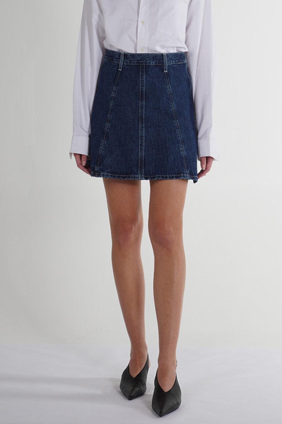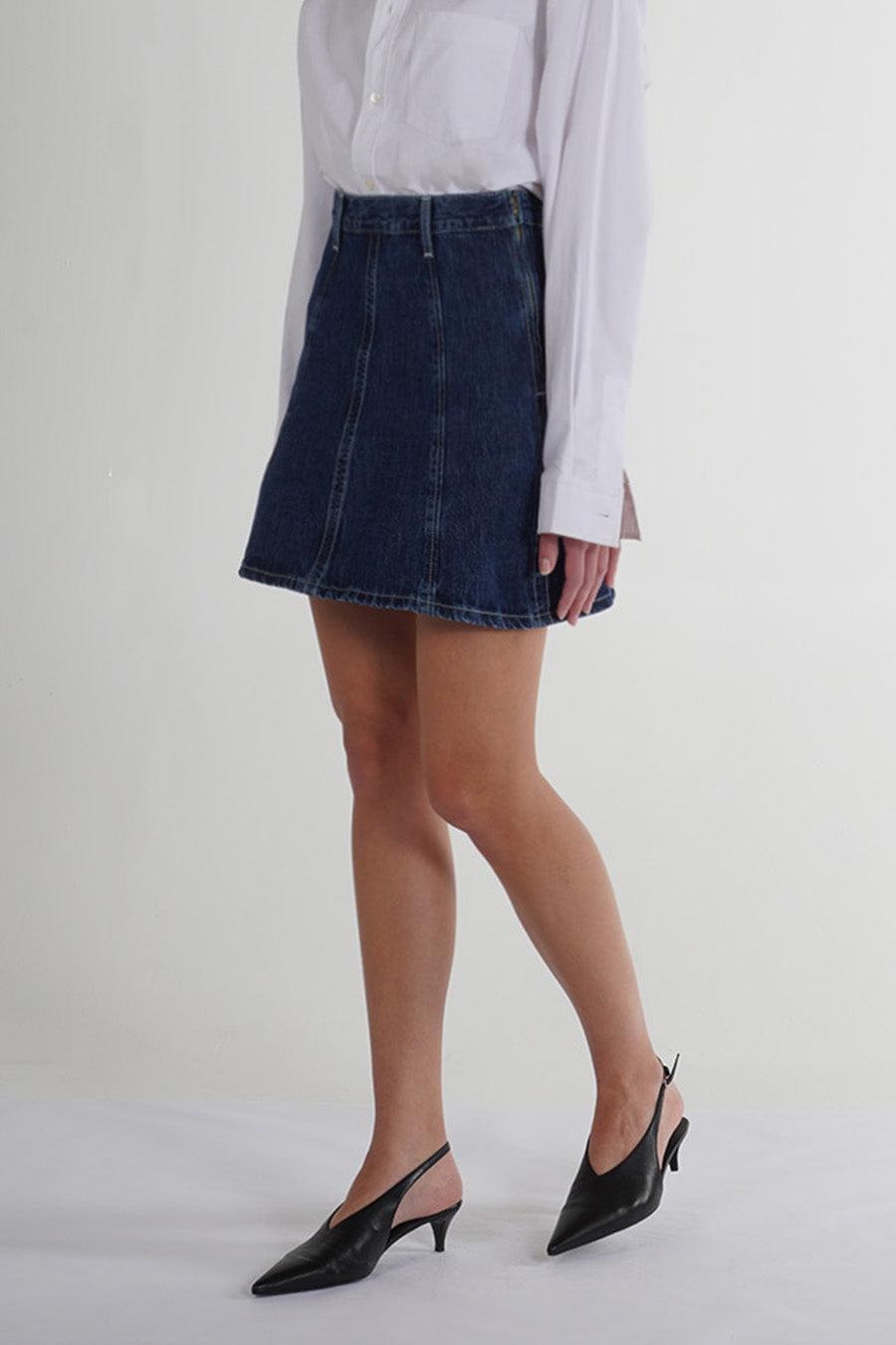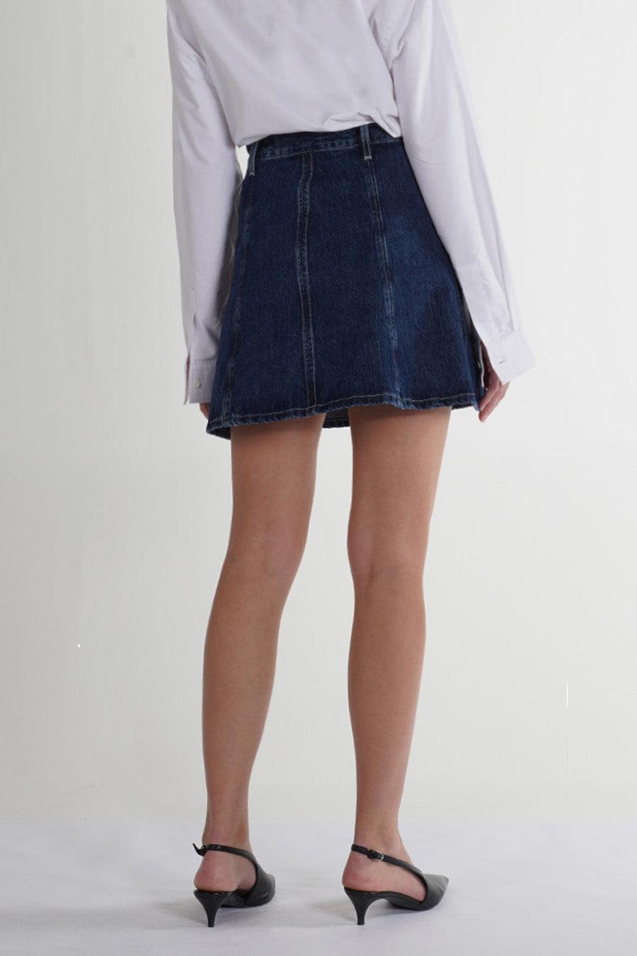 The Caprice Mini Skirt features a high-waisted, A-line silhouette with subtle pleats.