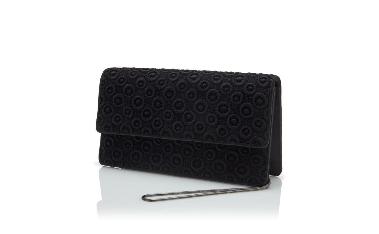 Black lace rectangular clutch bag featuring embroidered circular design and flap over detail with magnetic closure. Contains internal compartment, mirror and removable chains with two length options.