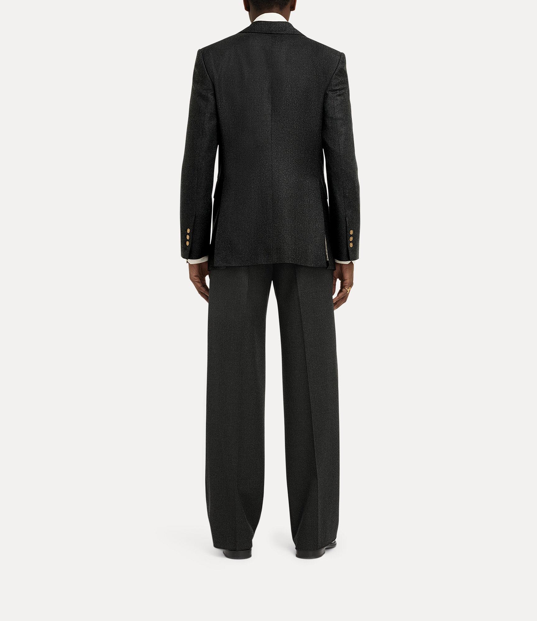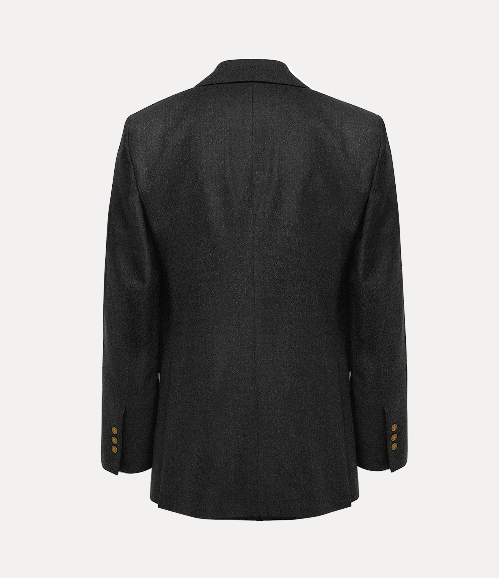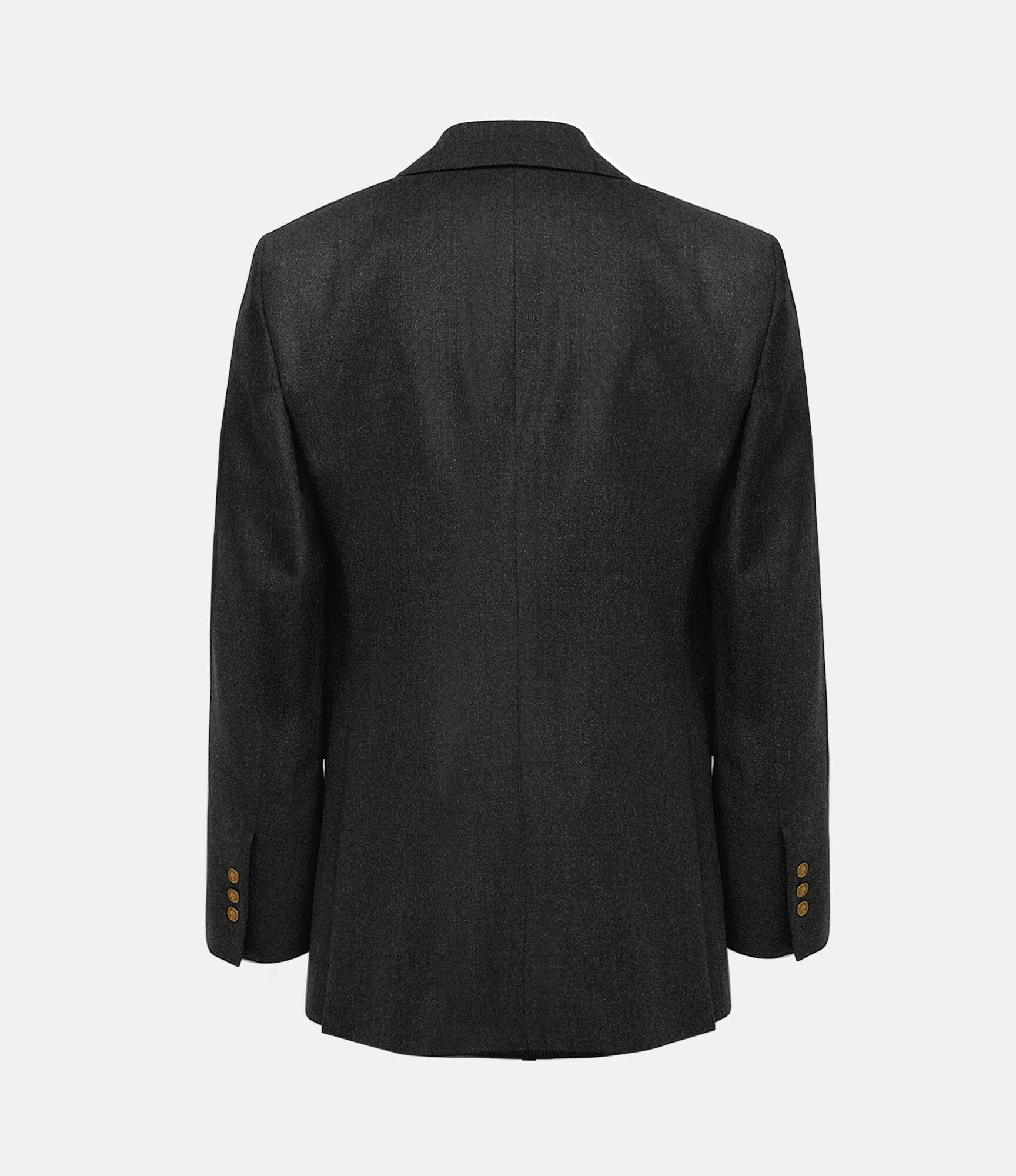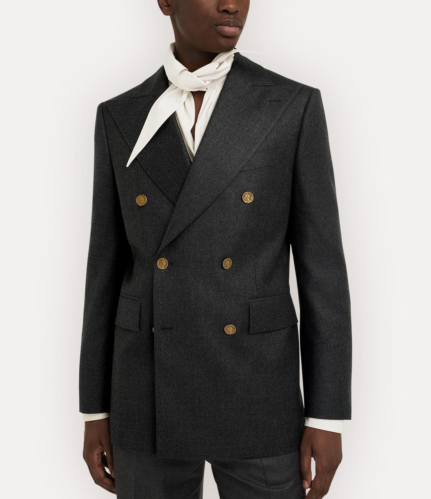 Our Captain jacket features a wool profile, delicately woven with a metallic brushed finish. Framed by sharp peak lapels, the silhouette falls to a clean hemline with rear vents, complete with our 'Tossed Orb' interior lining - synonymous with Vivienne's vision of launching tradition into the future.