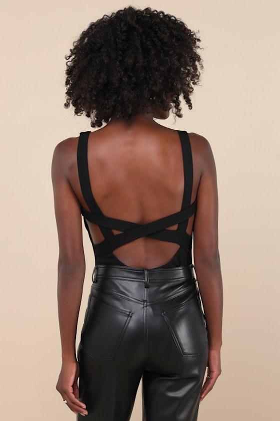 Add a subtly sexy element to any look with the Lulus Captivating Mood Black Sleeveless Strappy Back Bodysuit! Stretchy ponte knit shapes this flirty bodysuit with a flattering V-neckline and a seamed bodice, all supported by tank straps that flow into a crisscrossing, strappy design across the open-back design. Attached thong bottoms secure with snap closures.