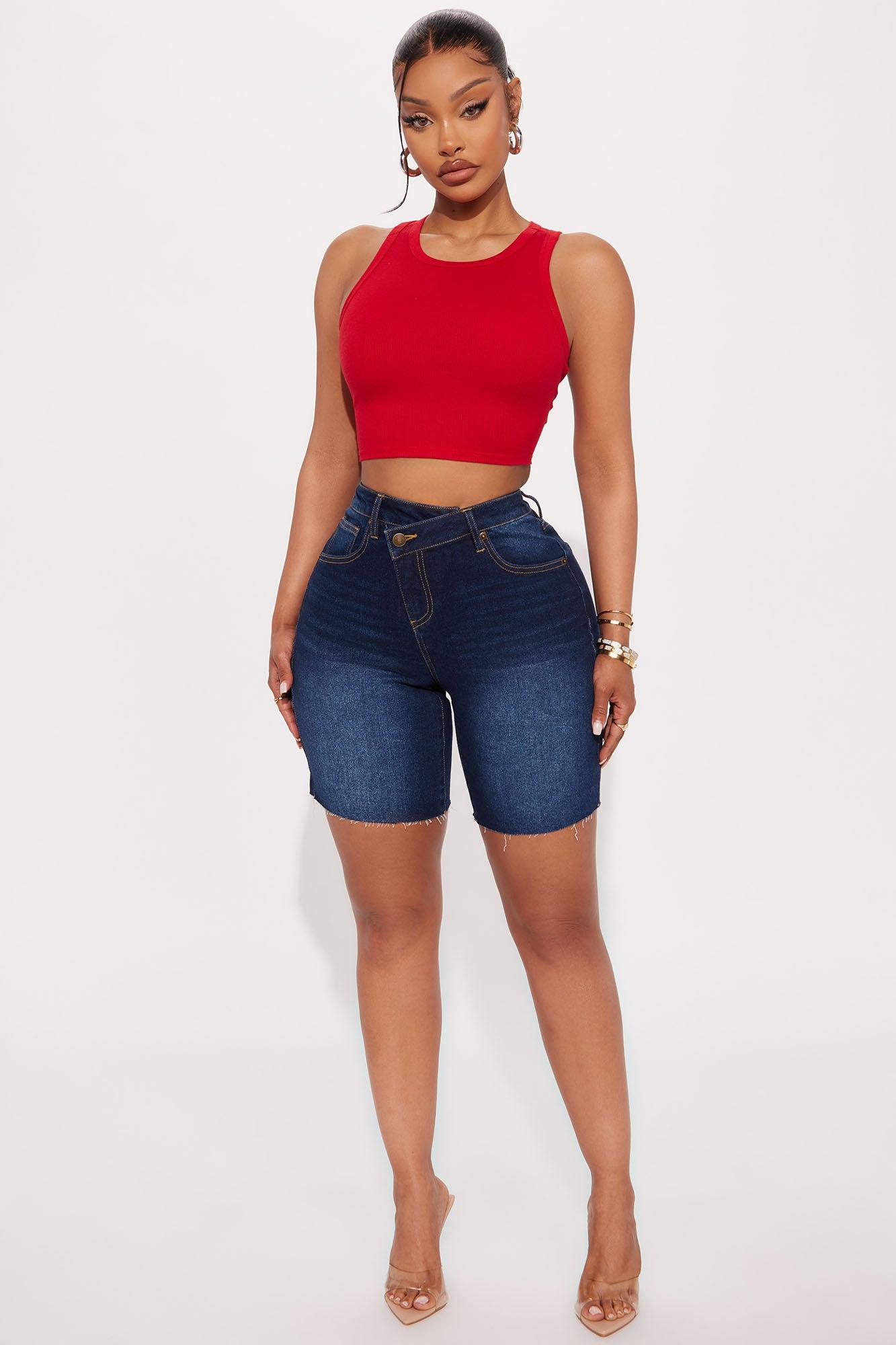 Available In Red, Heather Grey, Navy, And Off White. Tank Top Crew Neck Sleeveless Ribbed Cropped Stretch 60% Cotton 35% Polyester 5% Spandex Imported