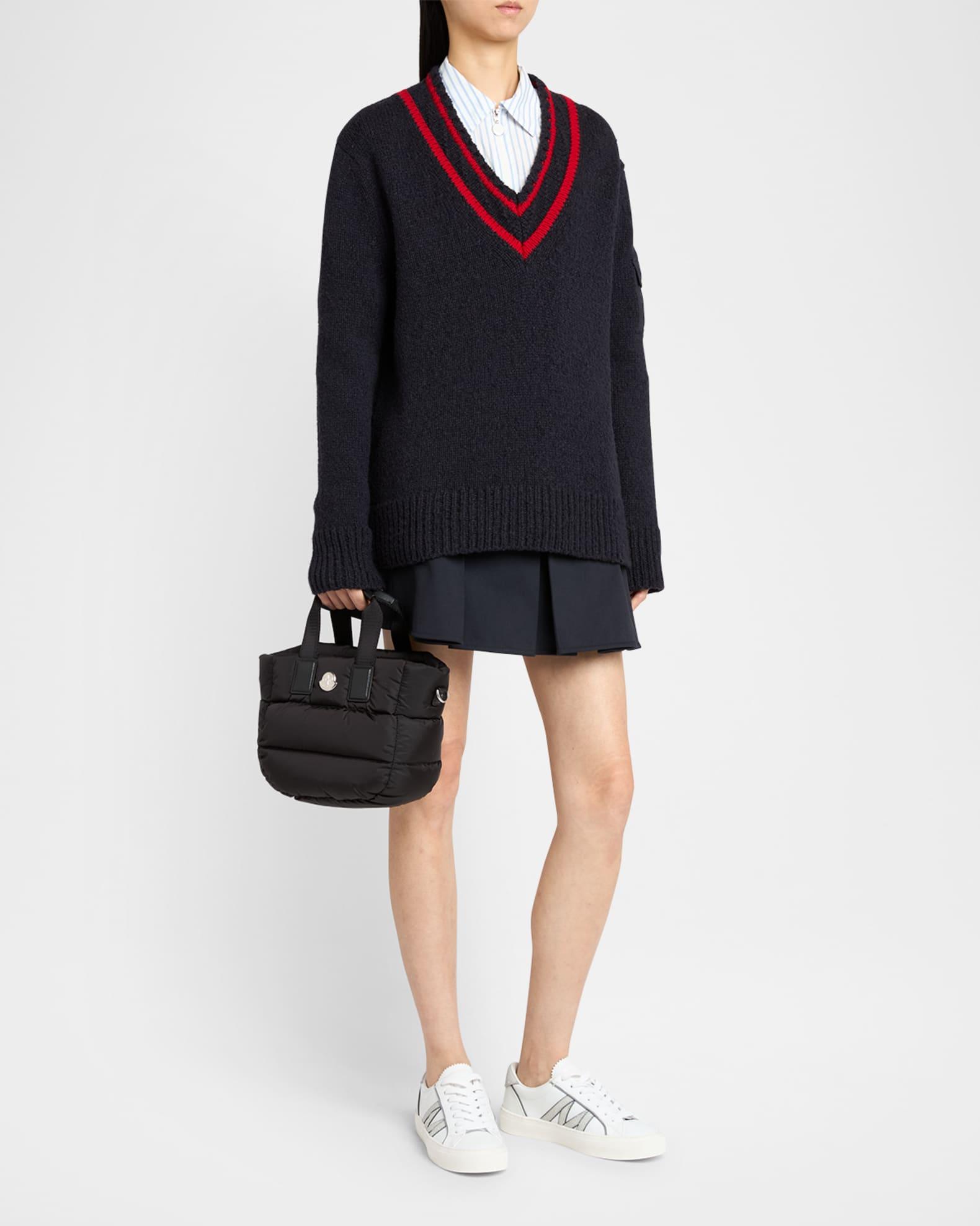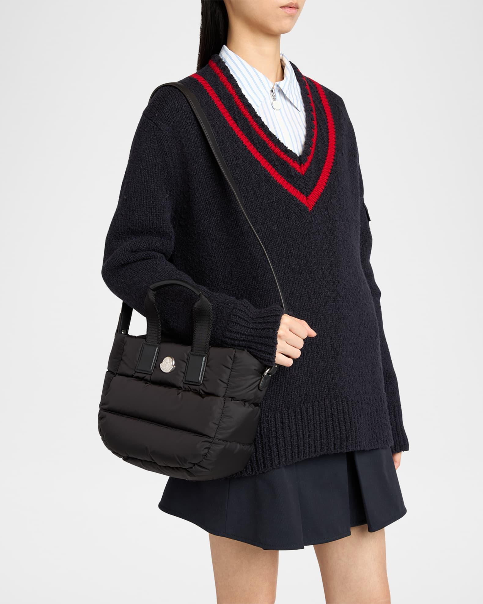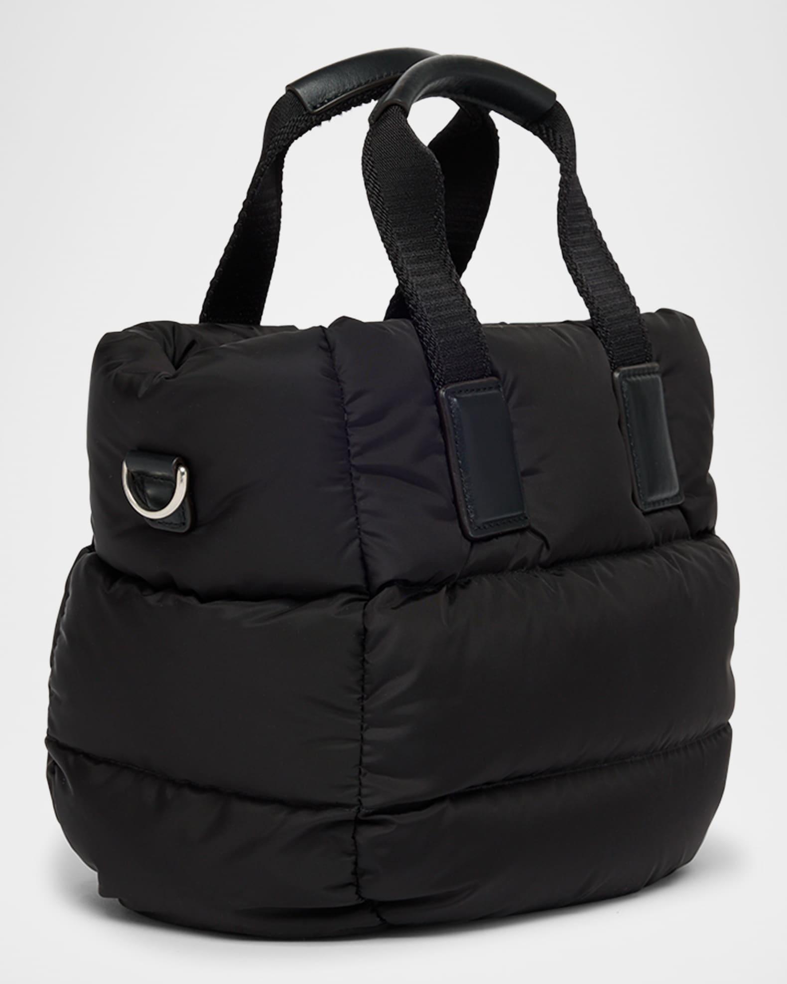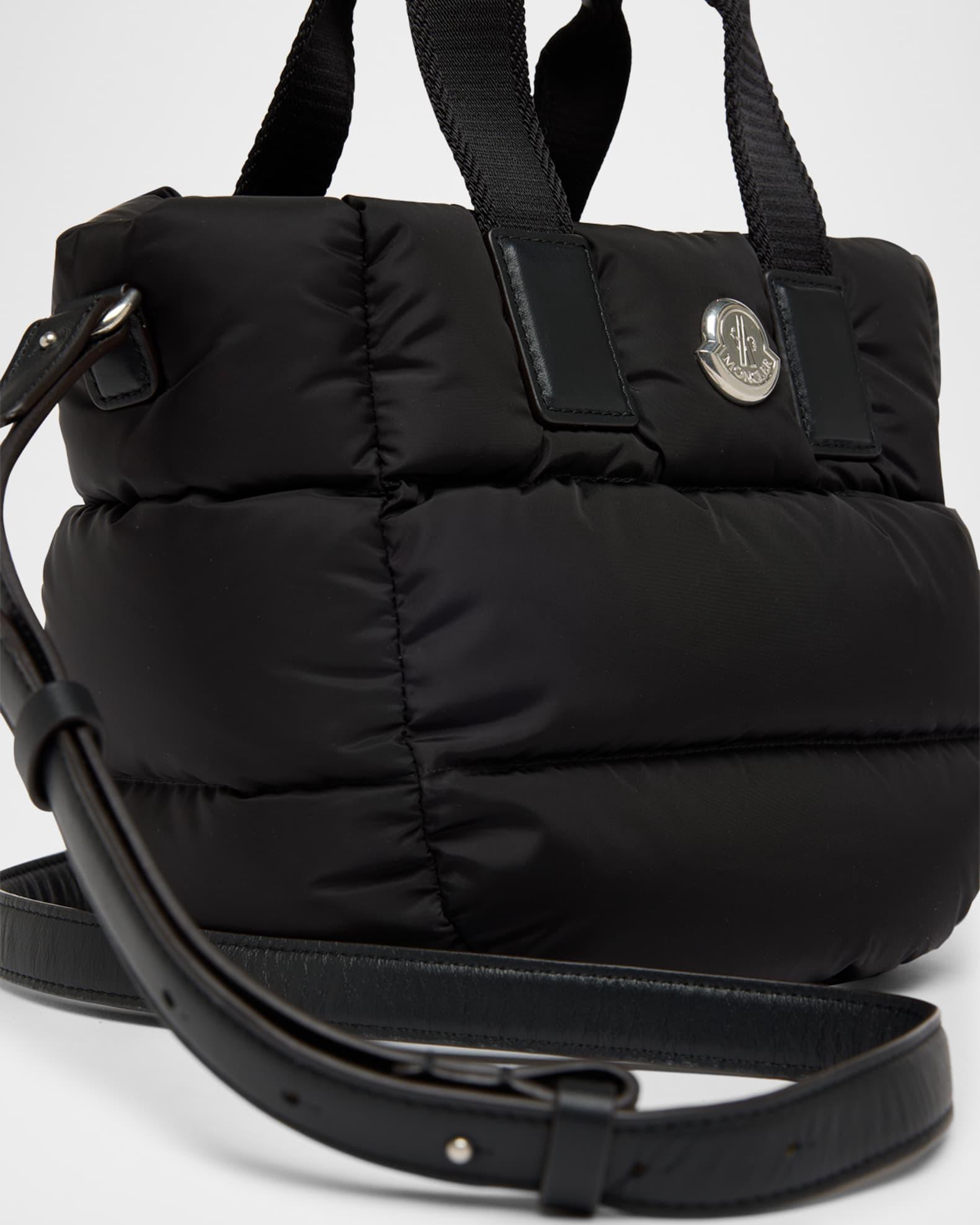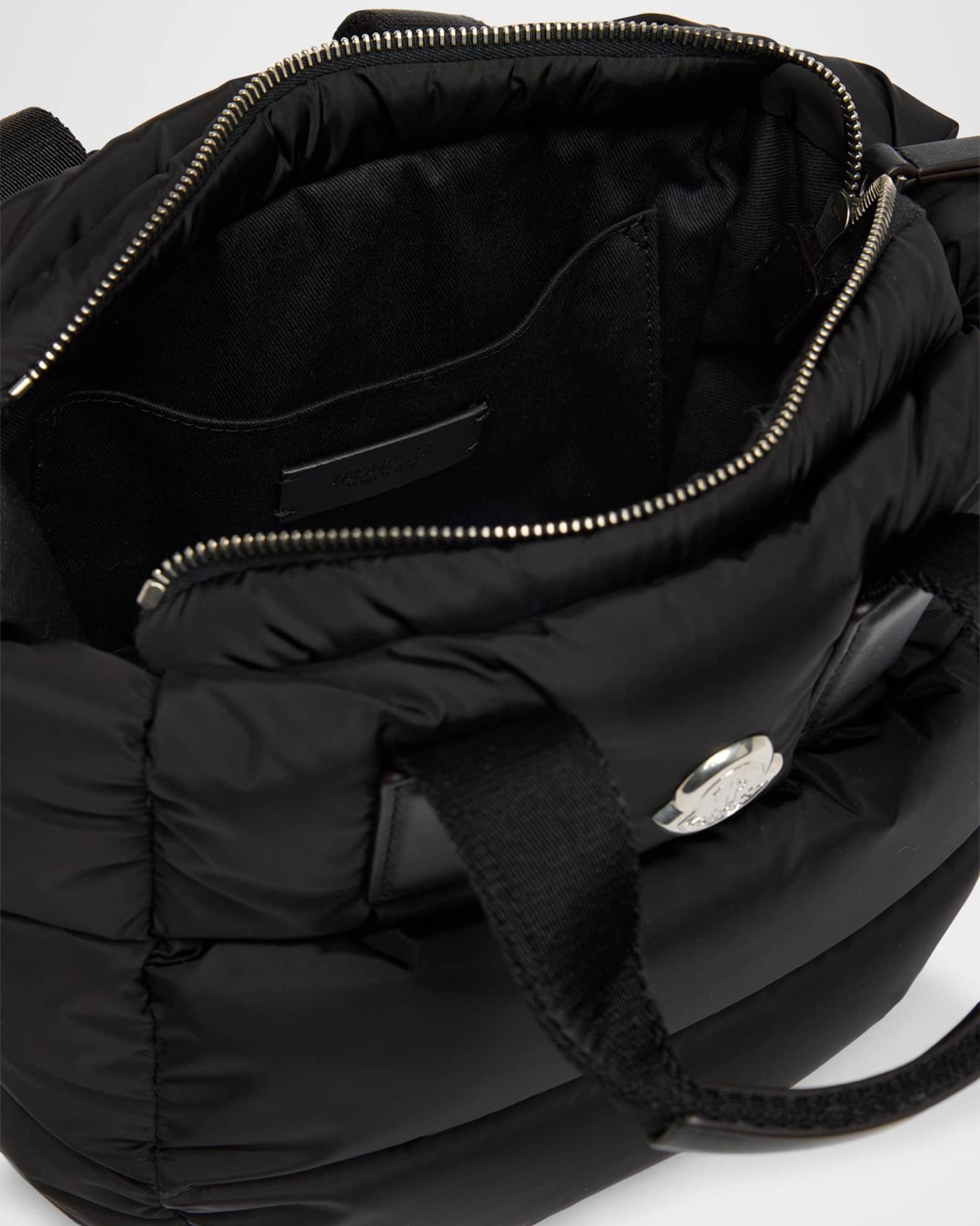Inspired by the iconic Moncler down jacket, the Caradoc bag is crafted from recycled nylon. Boasting an architectural, trapezoid shape, the mini tote fits your daily work or shopping essentials. Moncler "Caradoc" quilted micro tote bag in recycled nylon and leather Flat top handles with leather grip Adjustable and detachable crossbody strap Front metal logo plaque Interior, one slip pocket Zip top closure Approx. 6.5"L x 5.1"H x 3.1"D Fill: Down/feather Lining: Acrylic/cotton Professional cleaning recommended Made in Italy