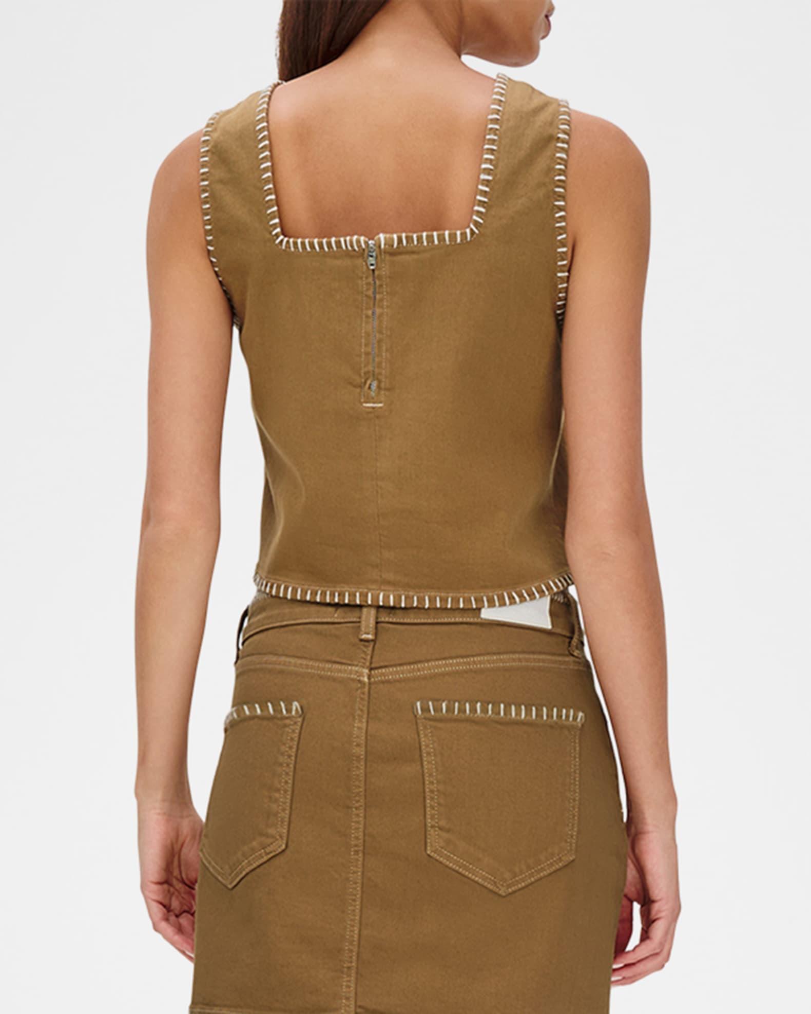 Rails "Carbon" colored stretch denim top with contrasting whipstitch trim Approx. 18.5"L from shoulder to hem Square neckline Sleeveless Relaxed fit Slightly cropped hem Back zip closure Cotton/elastane Unlined Machine wash cold, tumble dry, wash inside out, warm iron, do not dry clean Imported