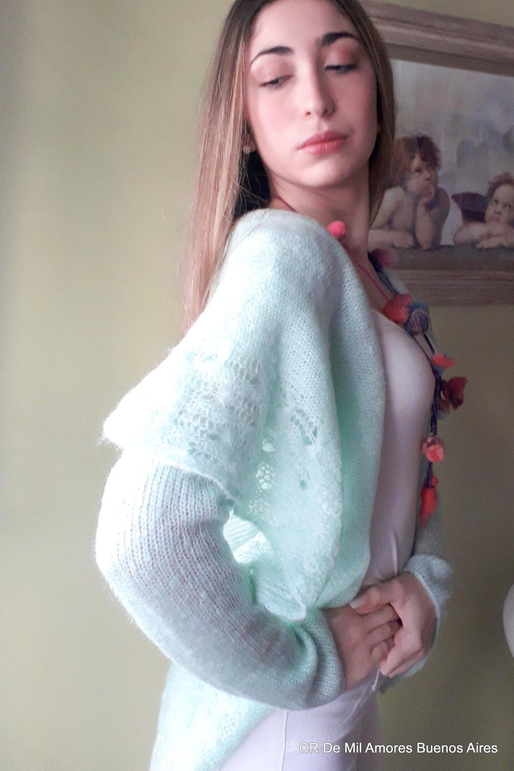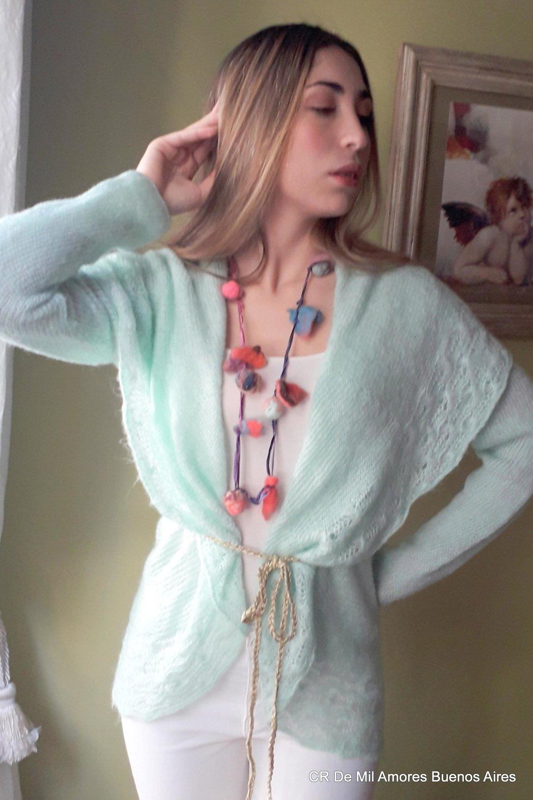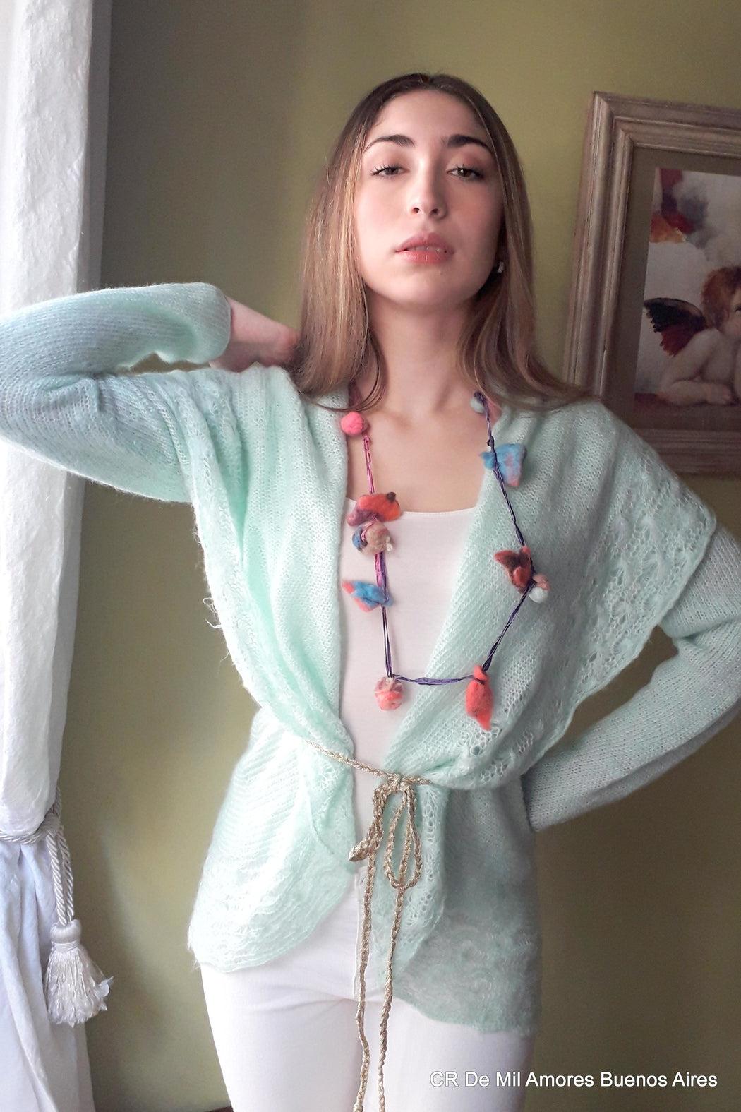 cardigan made in soft mohair close wirth belt and finished with embroidery details. romantic style size medium large color pastel green light