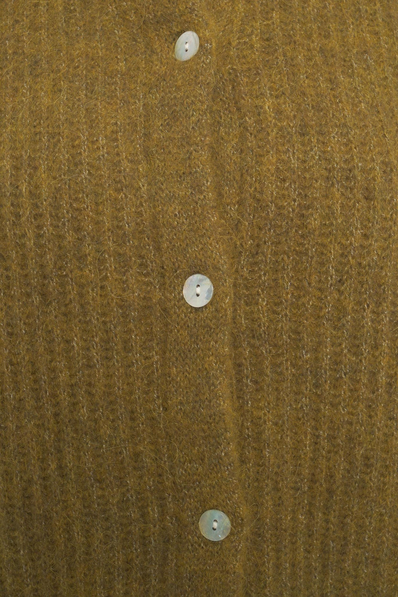This cardigan, made from soft knitted fabric, features an elegant stand-up collar and a full button closure. The long sleeves and hem are finished with ribbed cuffs, ensuring a comfortable fit. A versatile garment that is ideal for combining for various occasions.American VintageCardiganKnitted fabricHigh collarButton closureRibbed cuffs and hemLong sleeves