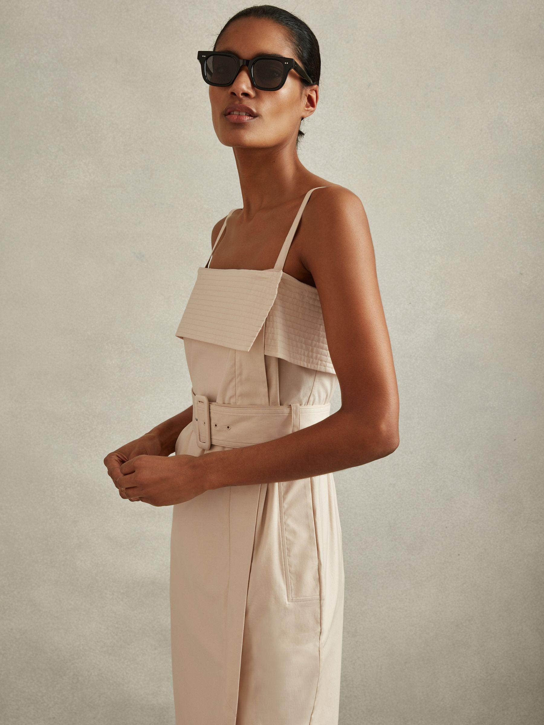 The Dhalia is crafted from a structured cargo-style cotton blend and arranged into a pencil shape with added volume at the hips. This wrap-style dress features a fold-over bust element and an adjustable waist belt. Fold-over bust element. Top-stitch detailing. Adjustable shoulder straps. Adjustable waist belt. Side pockets. Wrap-style. Side split. Zip-closure to side. Midi length. The model is wearing a size 8. Measurements of model: Height 5 10" / 177.8cm.