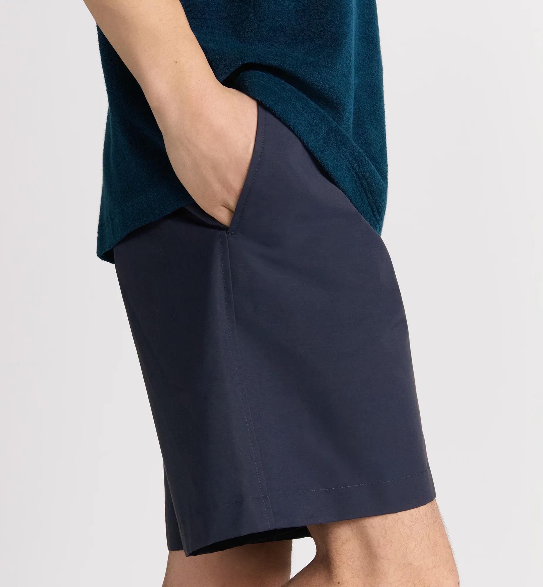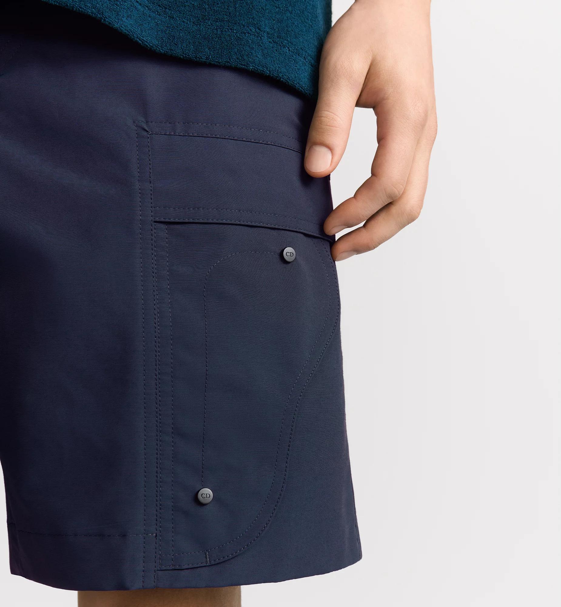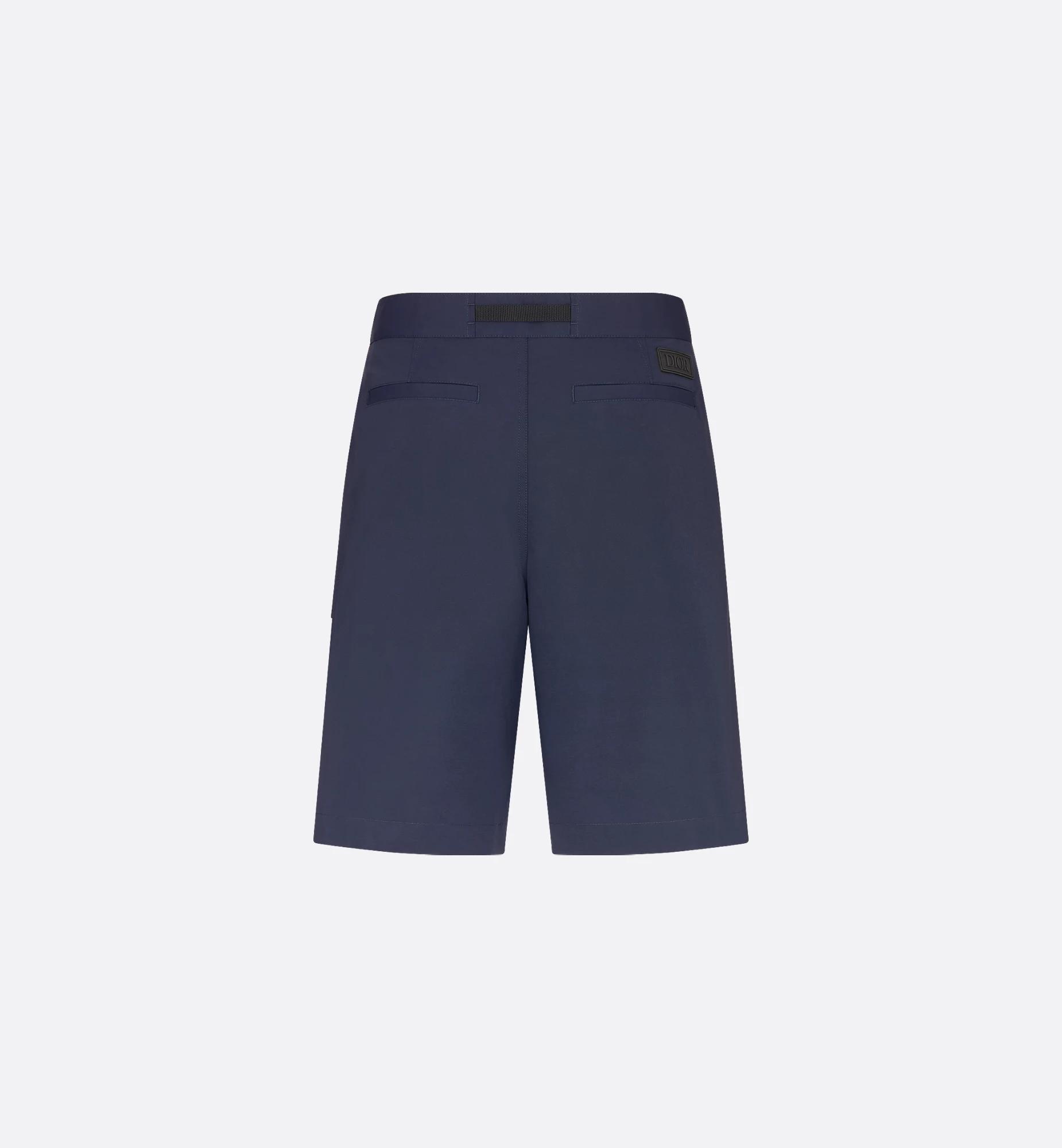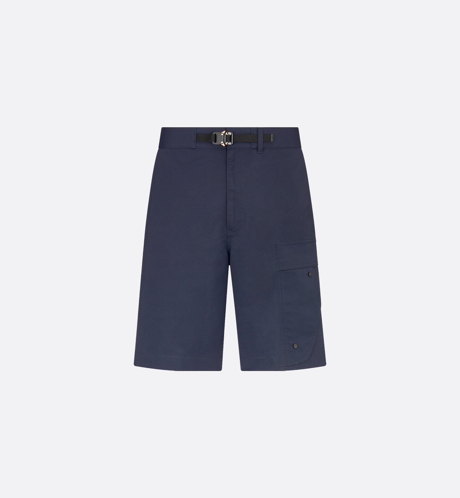 The cargo shorts have a contemporary aesthetic. Made in navy blue cotton-blend ottoman, they are adorned with a Saddle flap pocket on the thigh and a belt with a Christian Dior buckle. A Dior rubber patch lends a hallmark touch to the piece. Featuring a satin finish, the modern cargo shorts can accompany a short-sleeved T-shirt to complete a laid-back look. Dior rubber patch. Belt with Christian Dior buckle. Zipper and hook-and-bar fastening. Saddle pocket. Side slit pockets and rear piped pockets. 57% cotton, 43% polyamide. Made in Italy