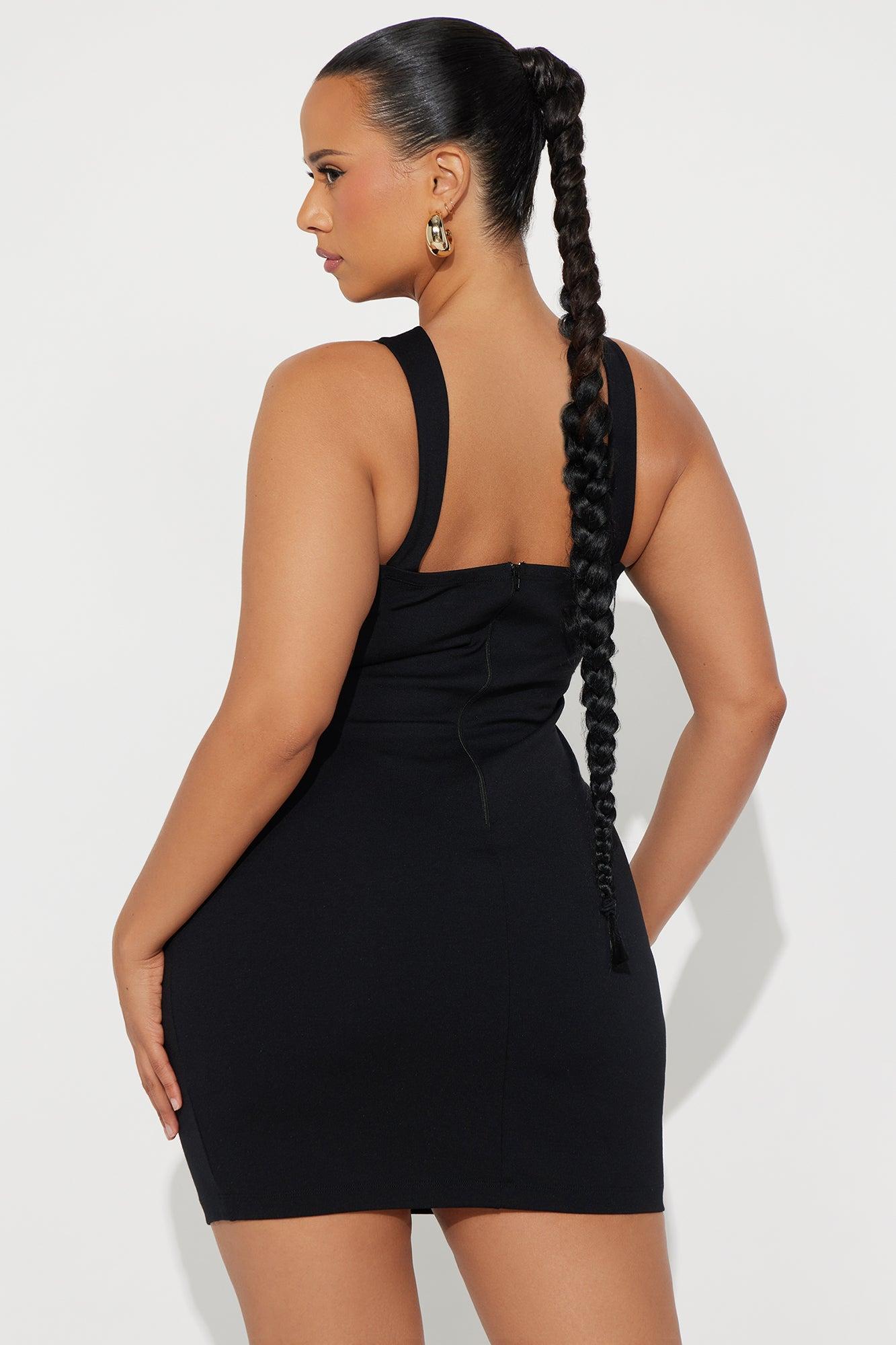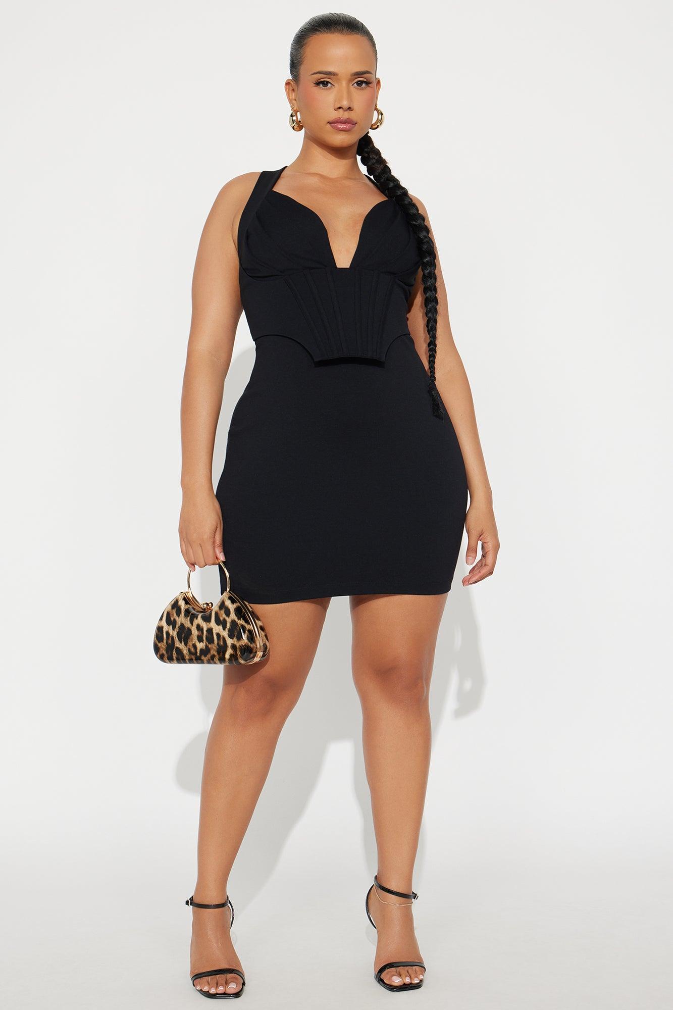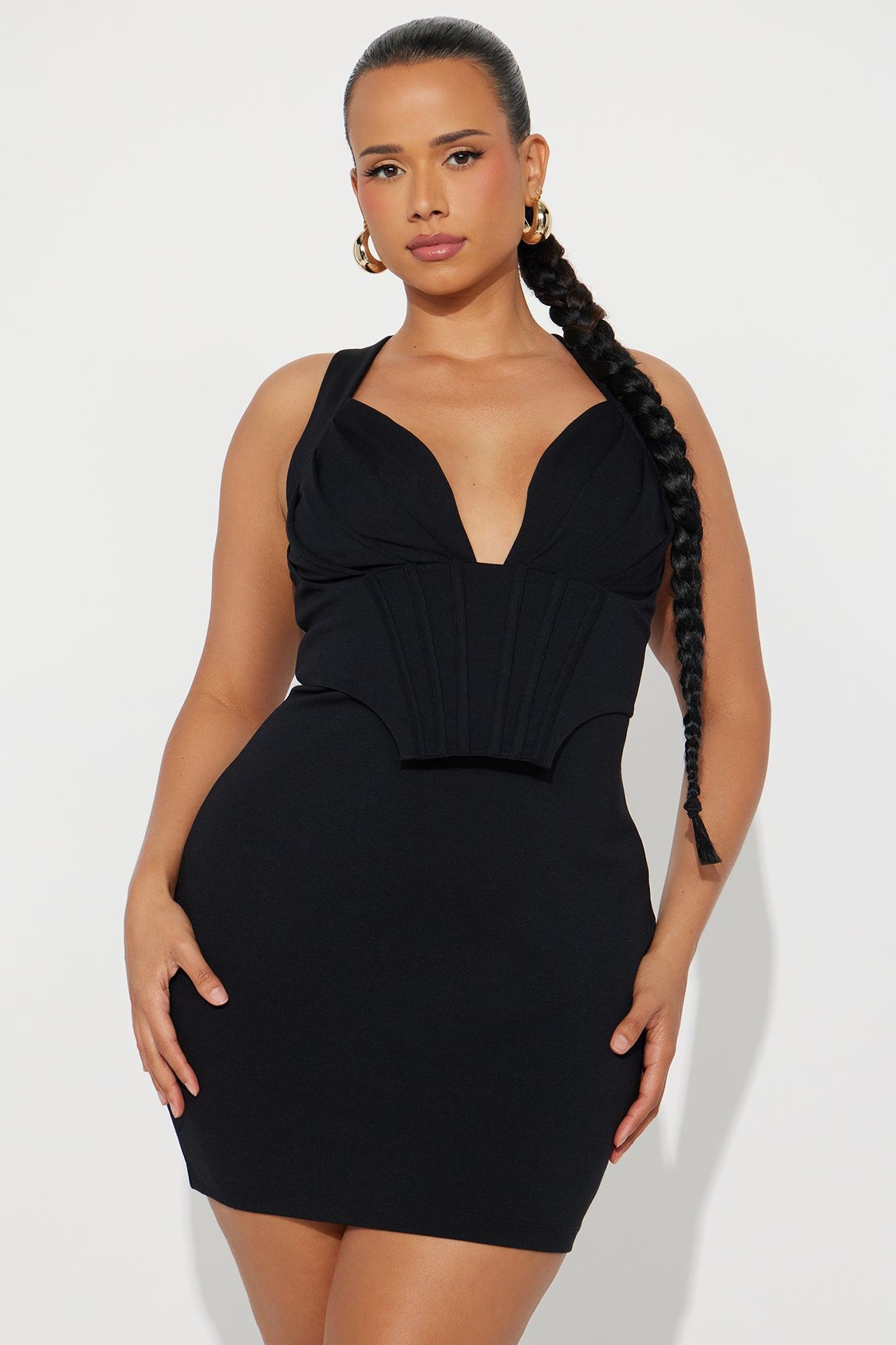 Available In Black. Corset Mini Dress Deep V-Neckline Sleeveless Corset Waist Boning Open Back Back Zipper Stretch Length Measured Flat = 32" Self: 62% Viscose 33% Nylon 5% Spandex Lining : 100% Polyester Imported California Proposition 65WARNING: Cancer and Reproductive Harm - www.P65Warnings.ca.gov.