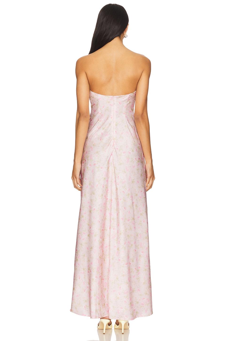 Self: 100% polyesterLining: 90% polyester, 10% spandex. Dry clean only. Fully lined. Hidden back zip closure. Built-in shelf bra. Non-stick silicone grip trim at bust. Midweight floral satin fabric. Neckline to hem measures approx 57.5" in length. Made in China. Revolve Style No. FORL-WD1401. Manufacturer Style No. CD3425-SU25-PINK.