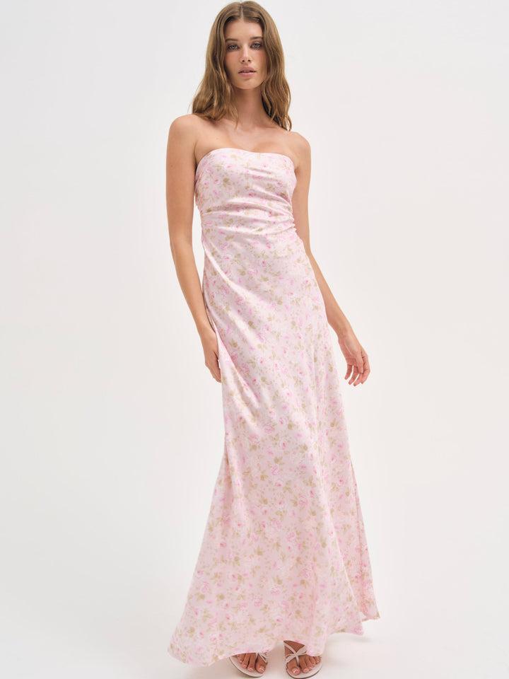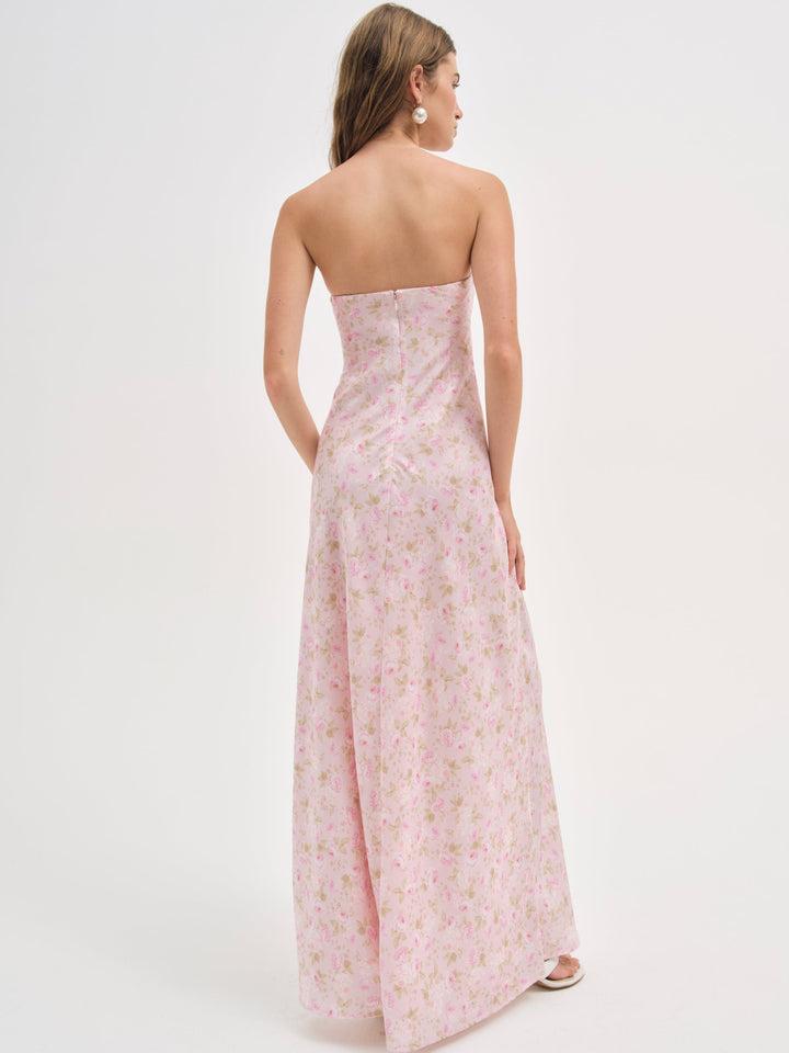Radiate summer elegance in the Carla strapless long dress, featured in an all-over floral print. This pink maxi dress skims and elongates the body with its flattering column silhouette, making it perfect for summer soireés.