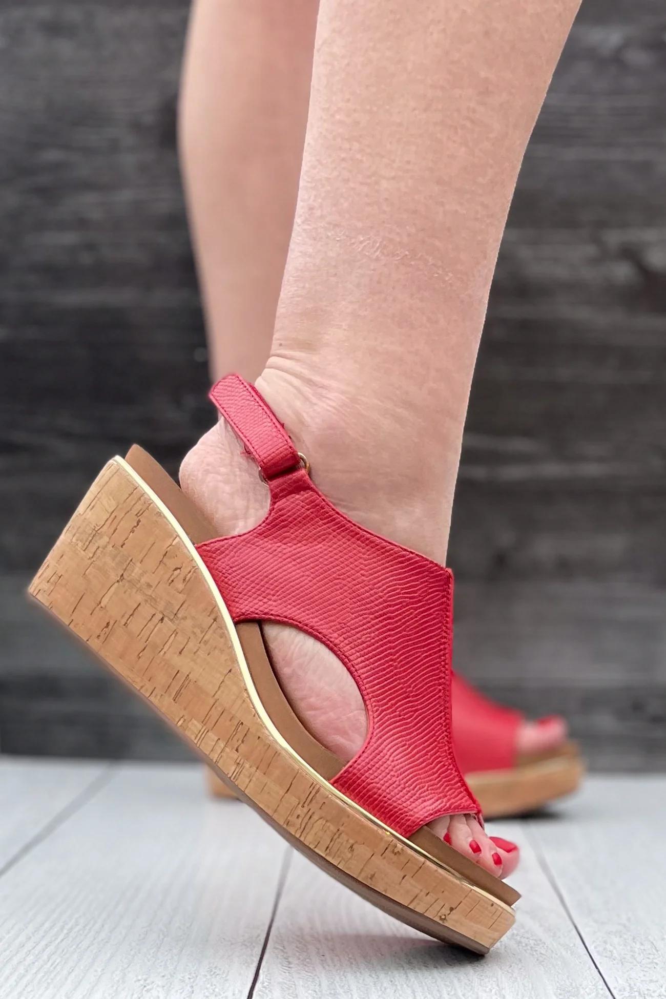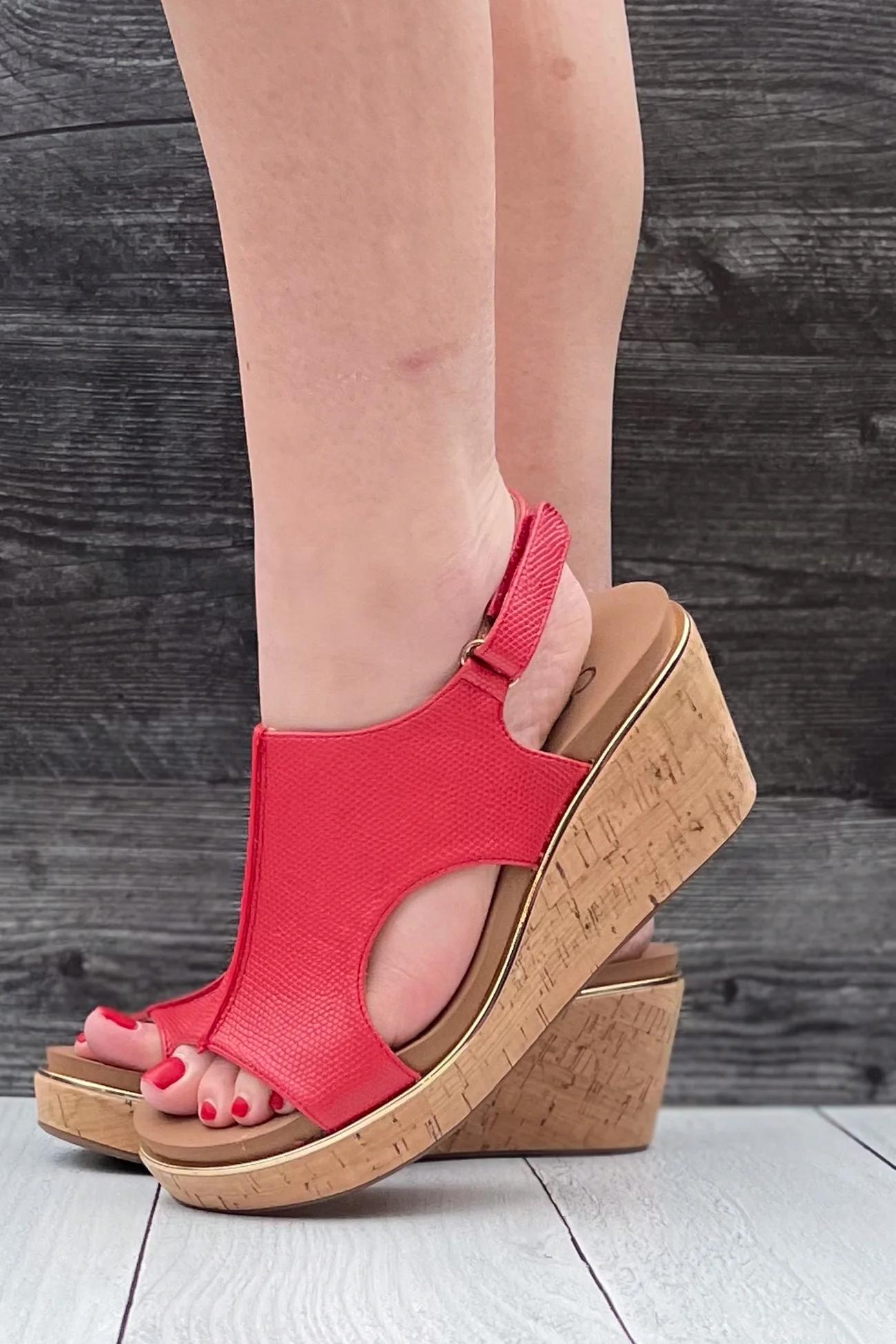 The Carley wedge gets glitzy with a faux leather lizard print upper and cork platform with metallic detail that shimmers with every step! With a comfy EVA footbed, lightweight cork platform, and easy hook-and-loop closure, this classic favorite is ready to shine all day (and night)!