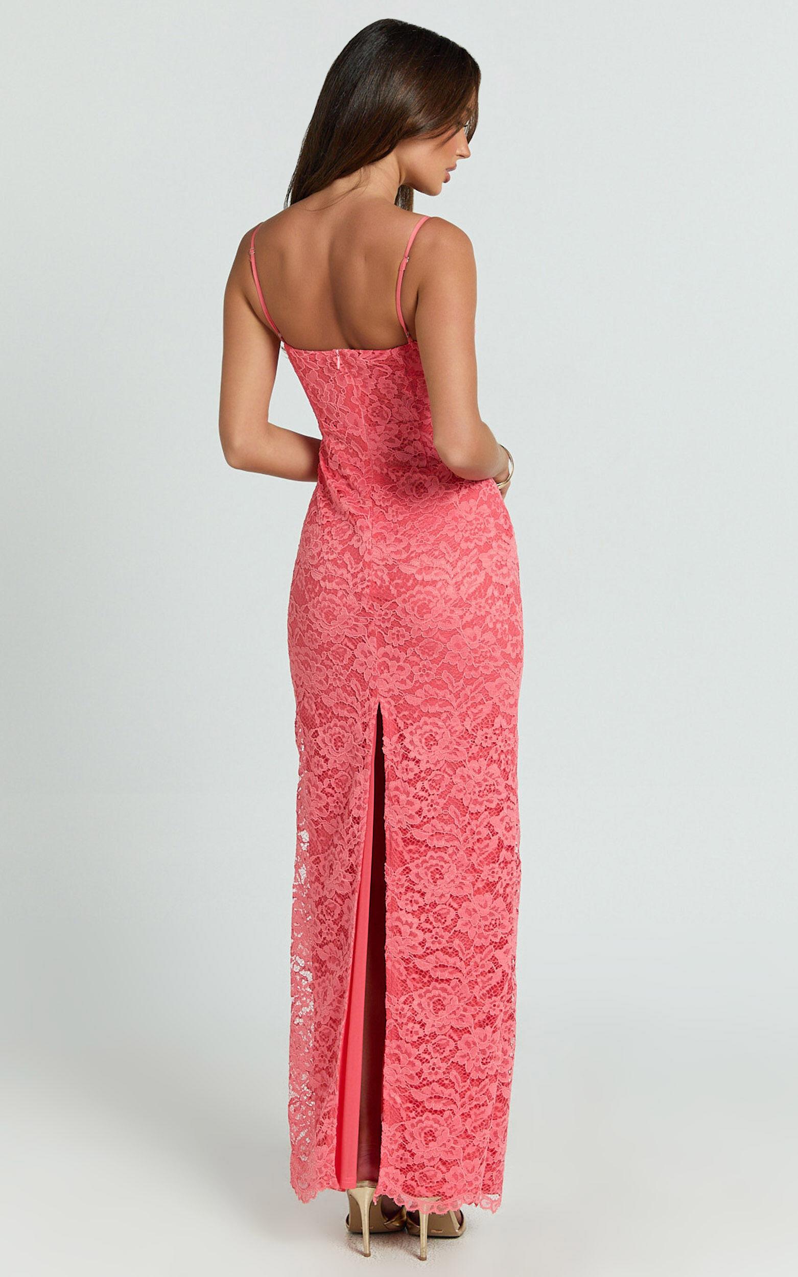 Carli Maxi Dress - Adjustable Strap Corset Bodycon Lace Dress in Watermelon