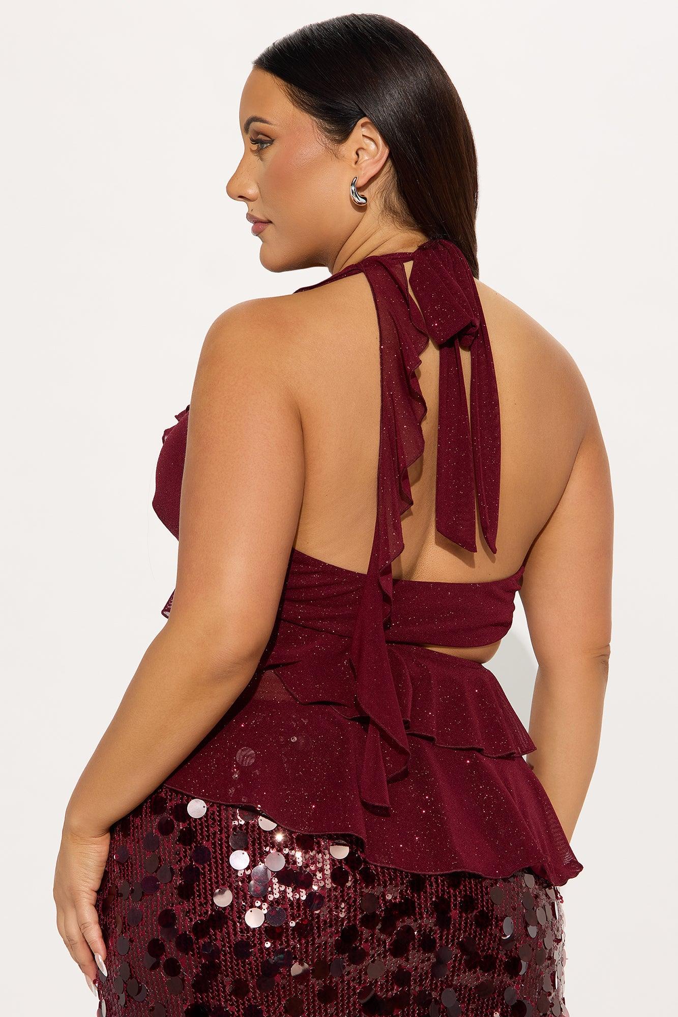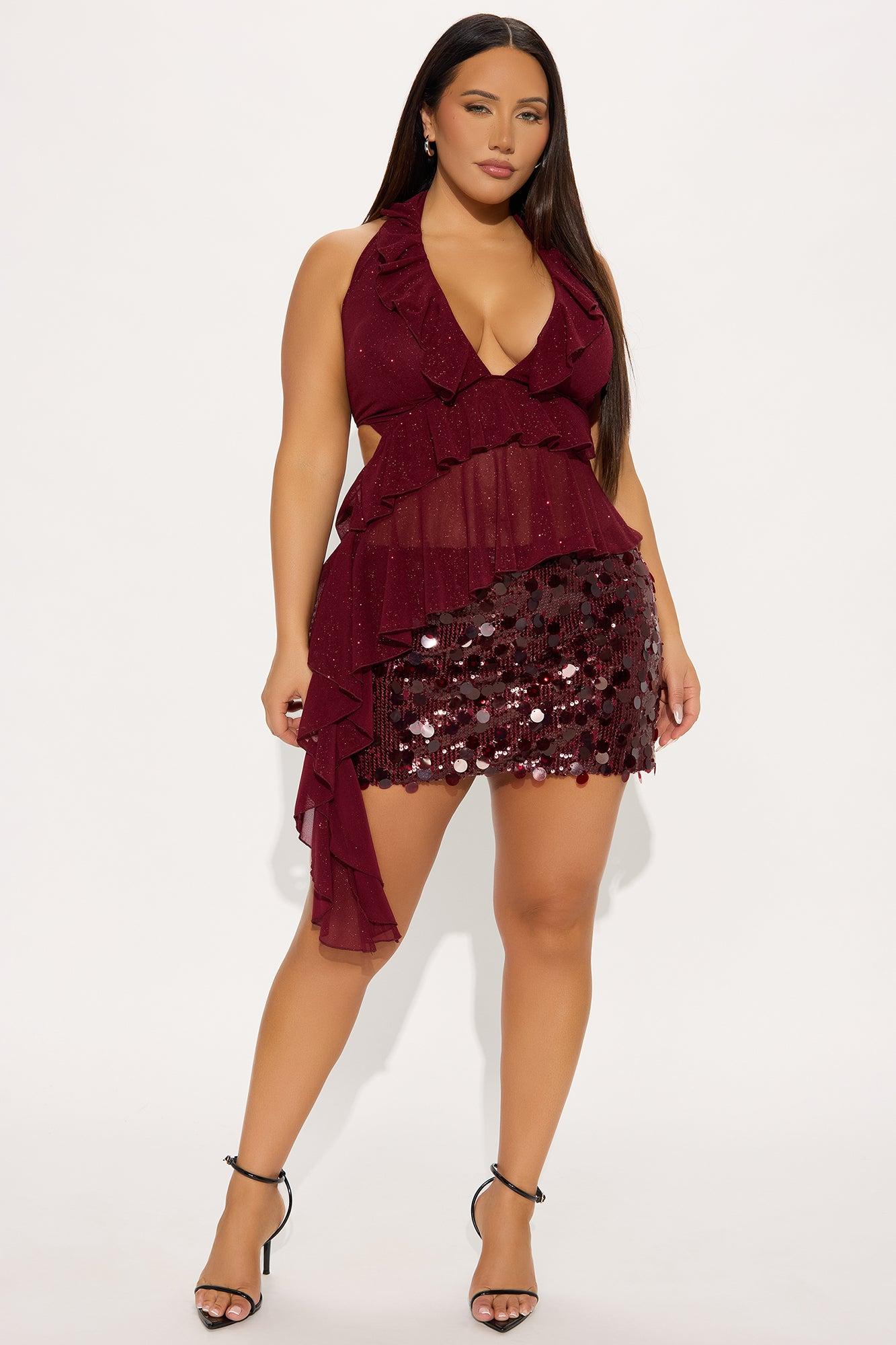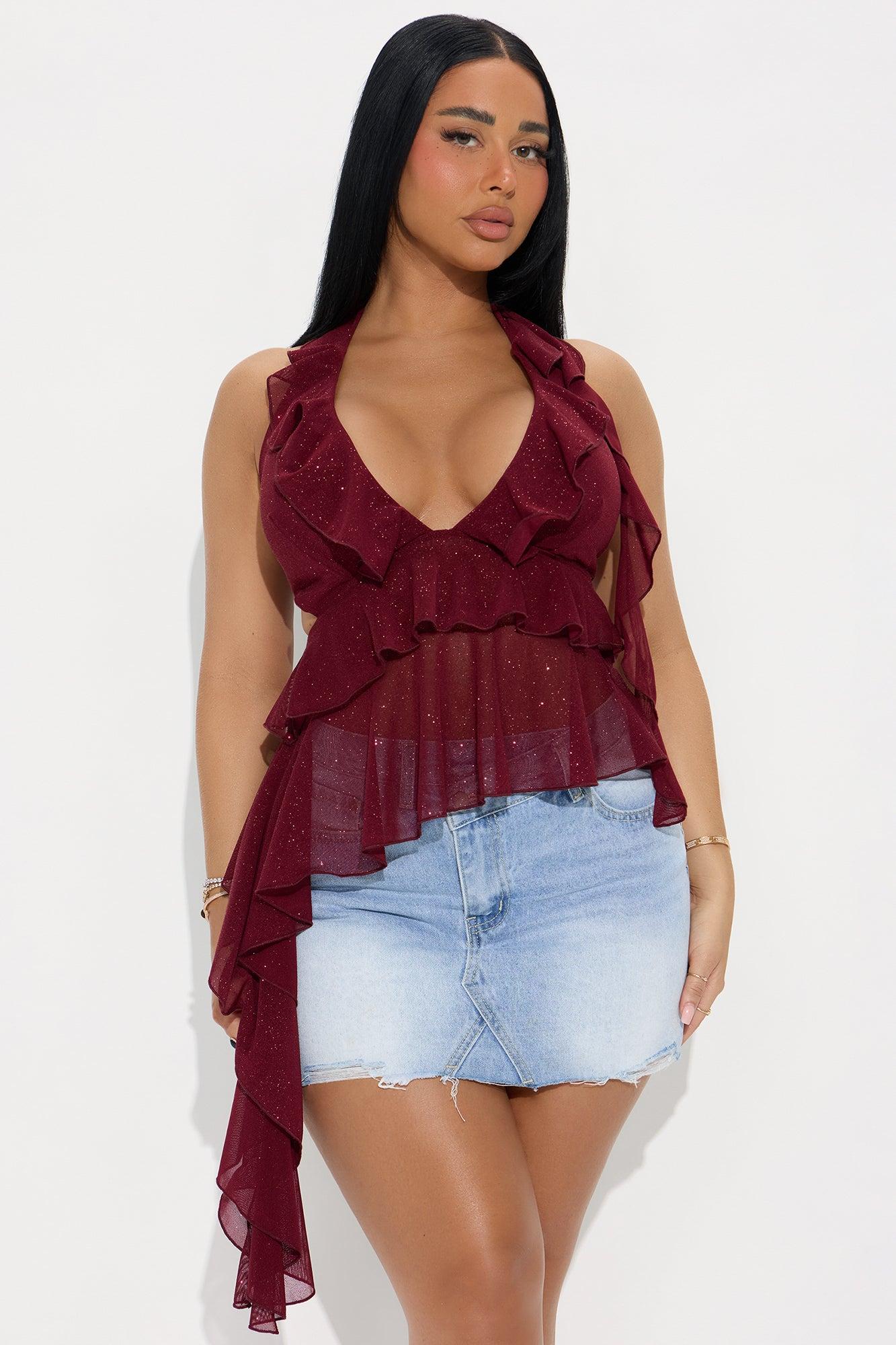 Available In Burgundy And Pink. Halter Top Deep Plunge Asymmetrical Ruffle Detail Glitter Detail Cutout Detail Mesh Stretch Self:95%Polyester 5%Spandex Contrast:100%Polyester Imported California Proposition 65WARNING: Cancer and Reproductive Harm - www.P65Warnings.ca.gov.