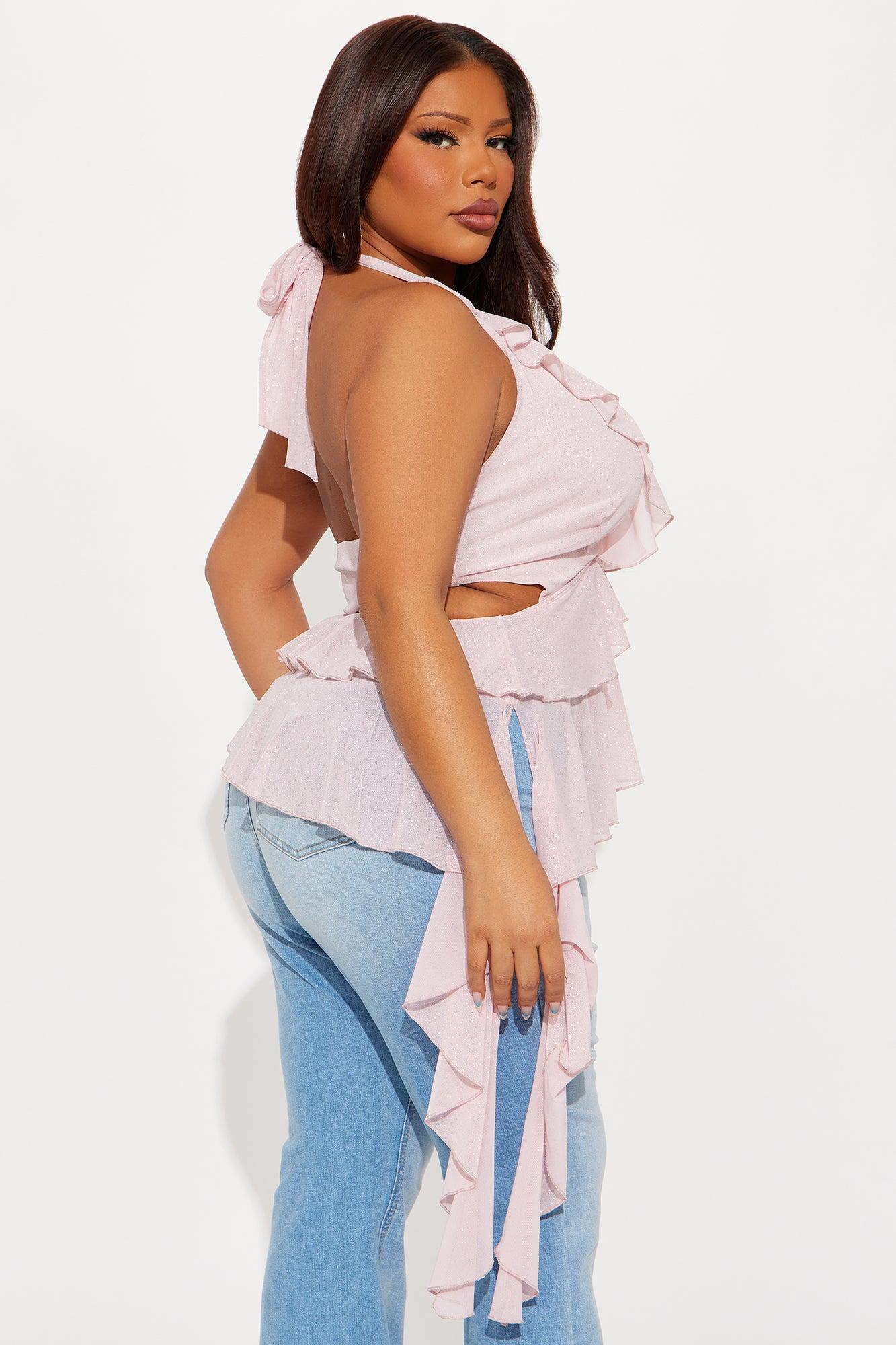Available In Burgundy And Pink. Halter Top Deep Plunge Asymmetrical Ruffle Detail Glitter Detail Cutout Detail Mesh Stretch Self:95%Polyester 5%Spandex Contrast:100%Polyester Imported California Proposition 65WARNING: Cancer and Reproductive Harm - www.P65Warnings.ca.gov.