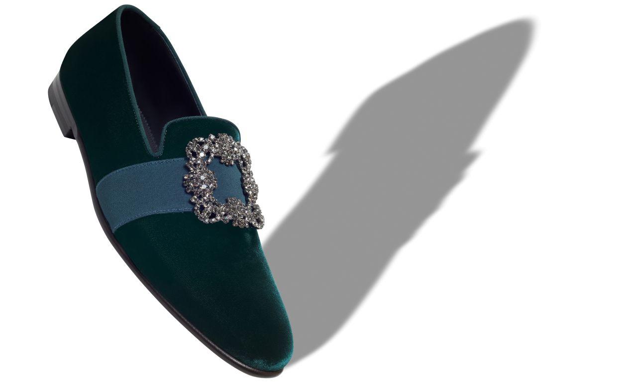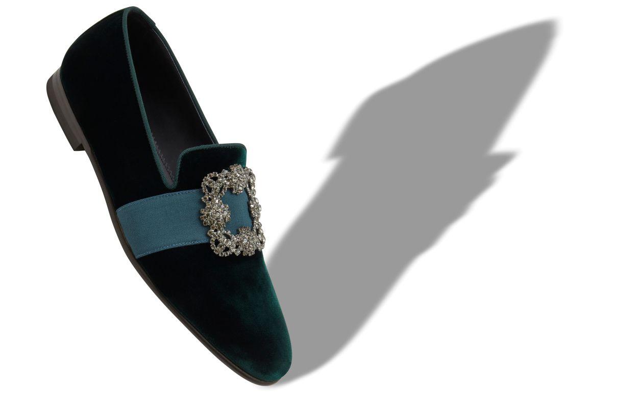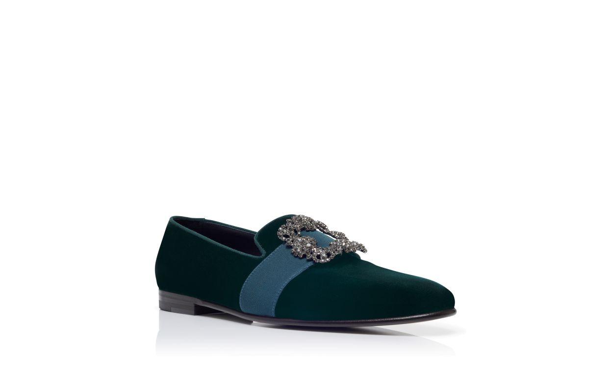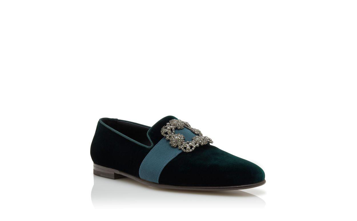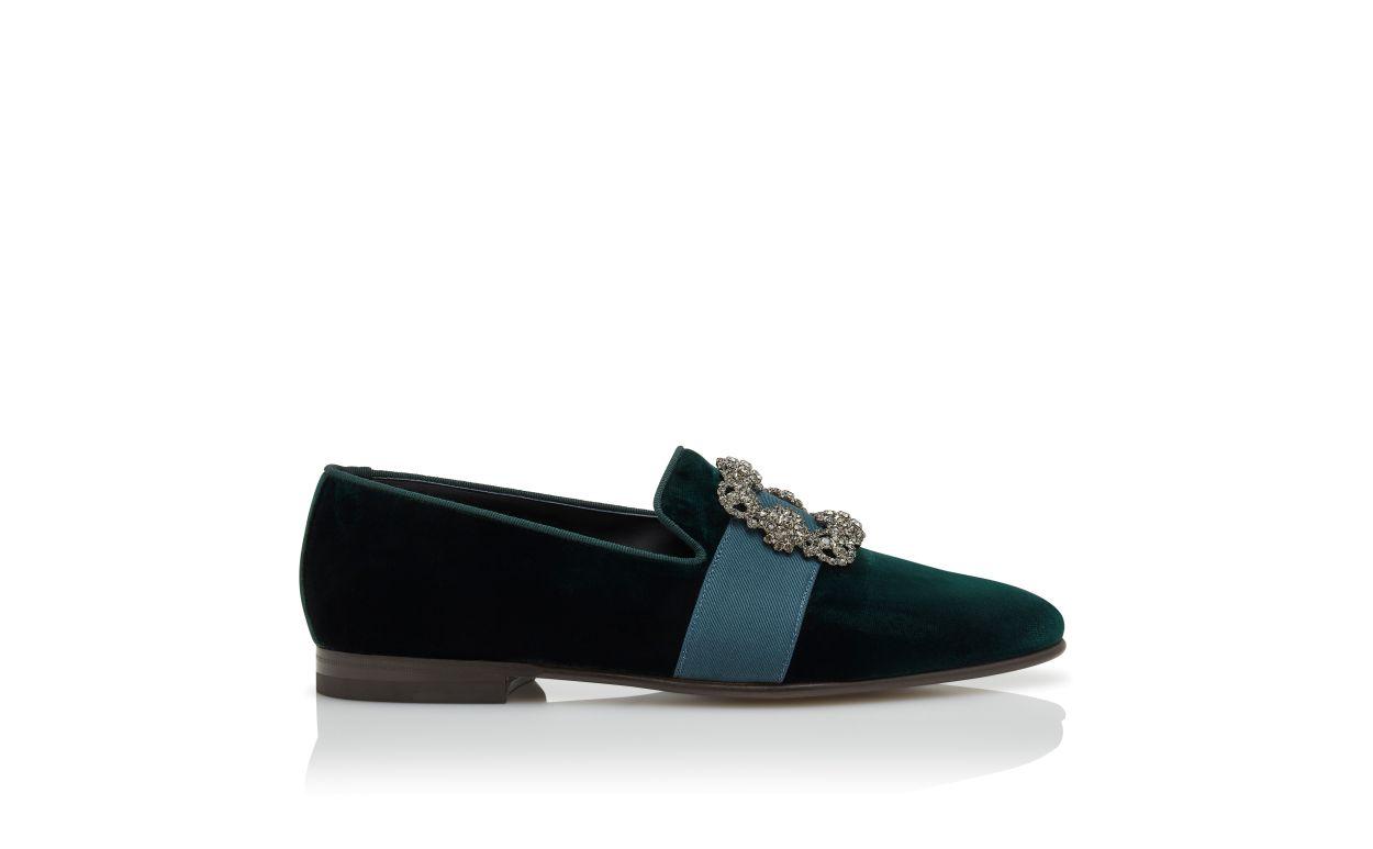 Green velvet loafers featuring grosgrain ribbon and square crystal buckle.