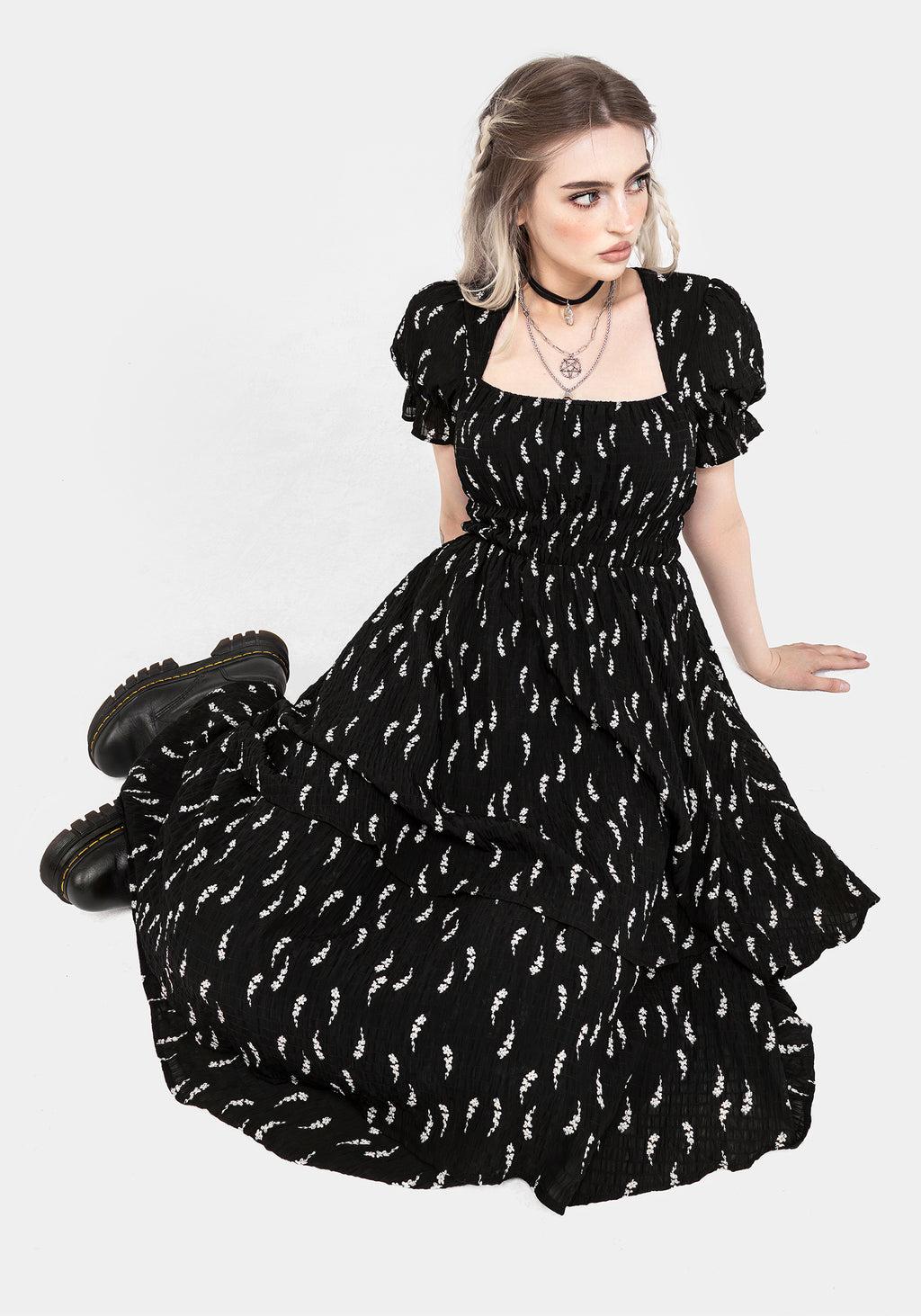Fancy a dark, floaty floral moment for your next summer occasion?- Black floral print layered midaxi dress - Flattering fit ‘n’ flare shape defines your figure - Trapeze neckline with elastication for interest & comfort - Short puff sleeves when with elasticated flared cuffs - Elasticated shirring at waistline cinches middle & adds romantic pleating to bust - Dramatic midaxi length skirt with a triple-layered construction for maximum movement - Silky textured non-stretch fabrication features a dainty white floral all-over print - Add blocky heels or comfy sandals & be the belle of the summer ball Main: 100% polyesterLining: 95% polyester, 5% elastaneTanya is 5'5" and wearing a UK8/ US4