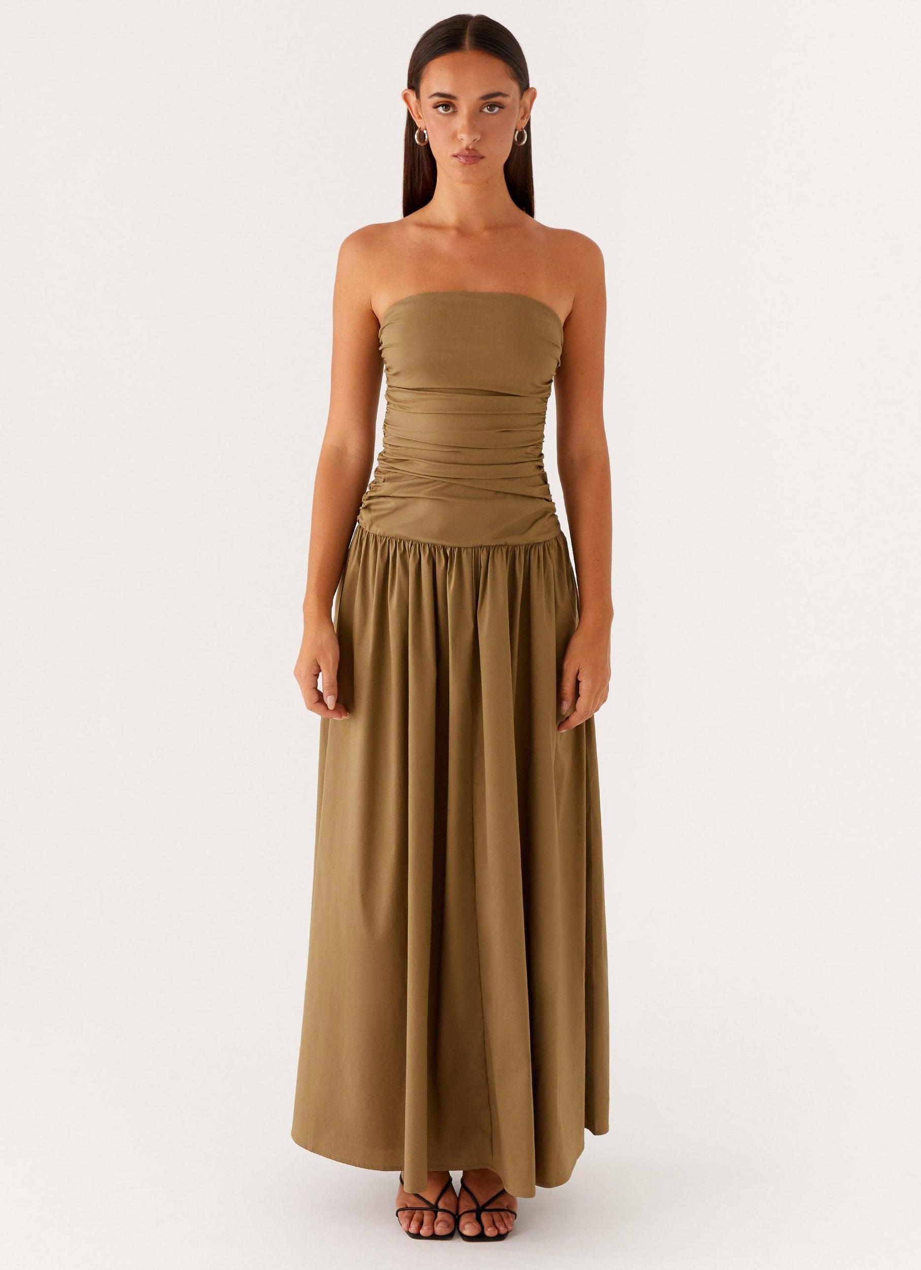 Peppermayo Exclusive The Carmel Maxi Dress is the ultimate in sultry elegance. With a figure-flattering maxi length, ruched sides, and a rope waist detail, it drapes effortlessly, perfect for golden skies and balmy, unforgettable nights. - Maxi length- Ruched sides- Drop waist- Silicone taping- Strapless neckline- Side hook and eye, invisible zipper- Flare skirt- Fabric composition: 65% cotton, 32% nylon, 3% spandex; Lining: 88% polyester, 12% spandex Size AU 8 / US 4 garment measurements: Bust: 74 cm / 29.13 inWaist: 66 cm / 25.98 inHip: 84 cm / 33.07 inHem: 258 cm / 101.57 inLength: 131 cm / 51.57 in Roberta is 177cm and wears size AU 6 / size US 2