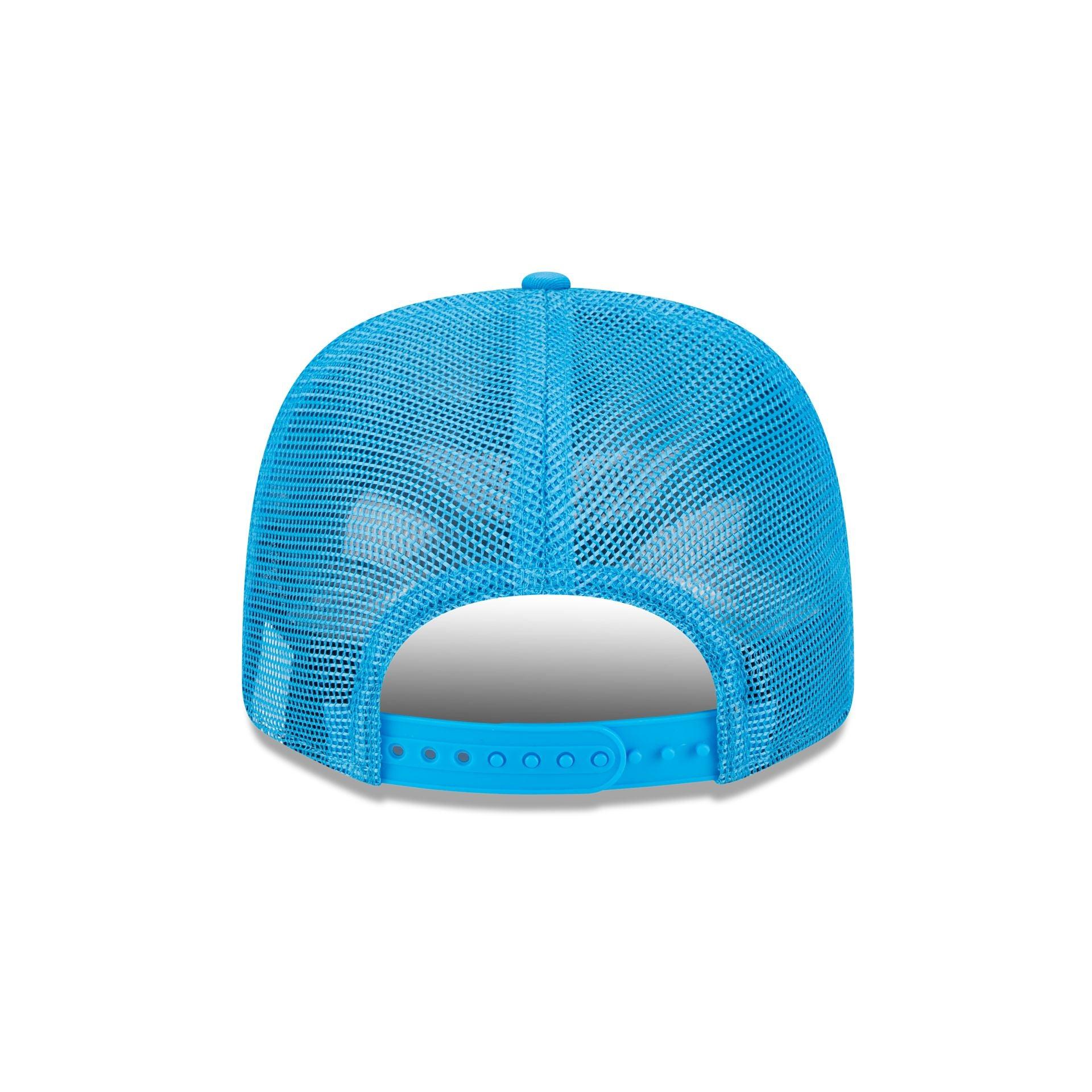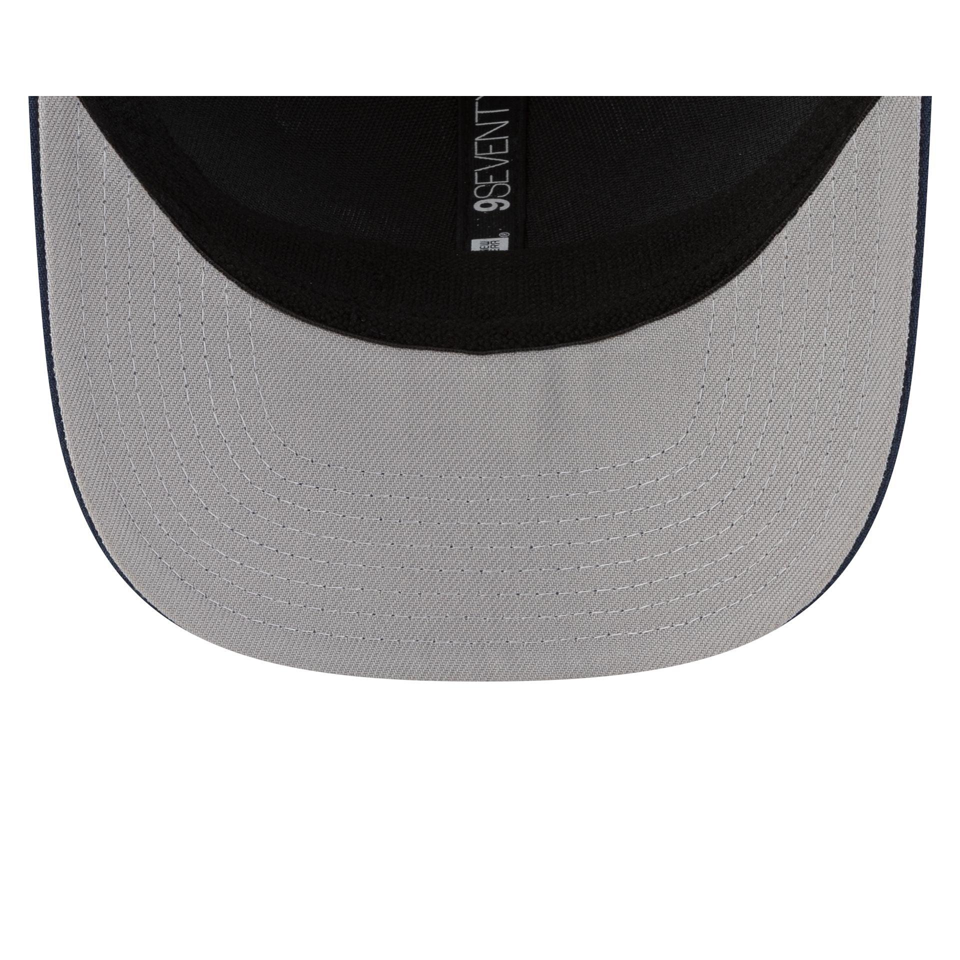 The Carolina Panthers Labeled 9SEVENTY Stretch-Snap Cap features an embroidered Panthers Inaugural Year patch at the front panels with a matching New Era Flag at the left-wear side. Additional details include a gray undervisor and a snapback closure at the rear.