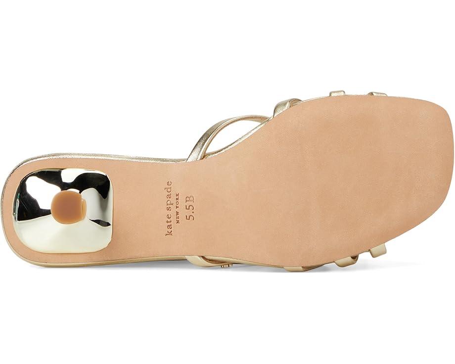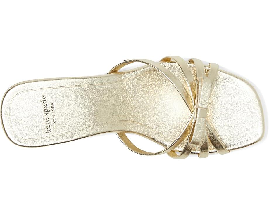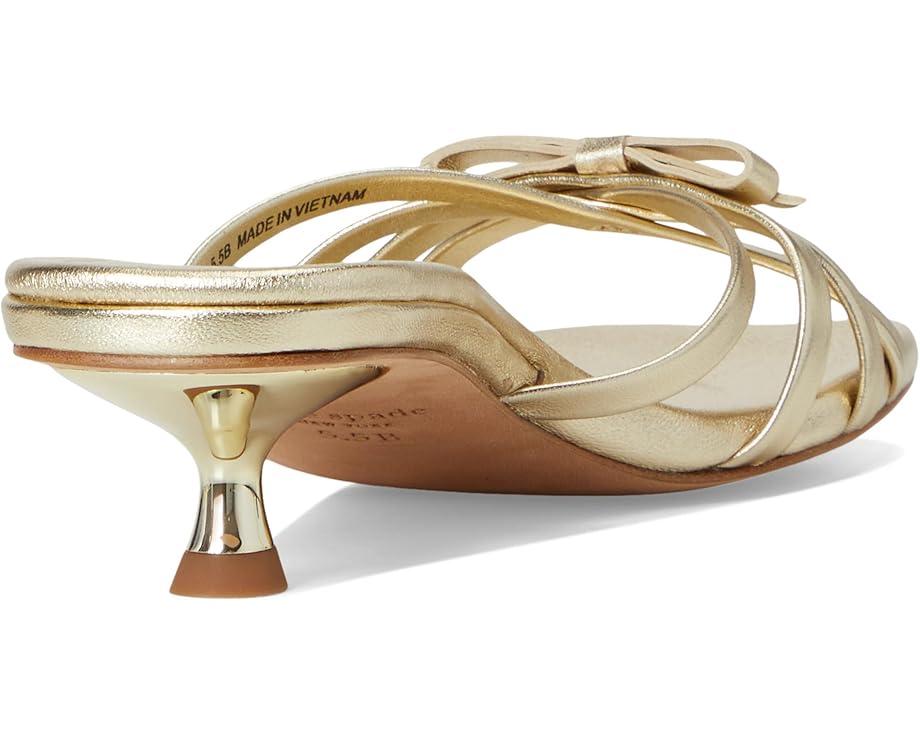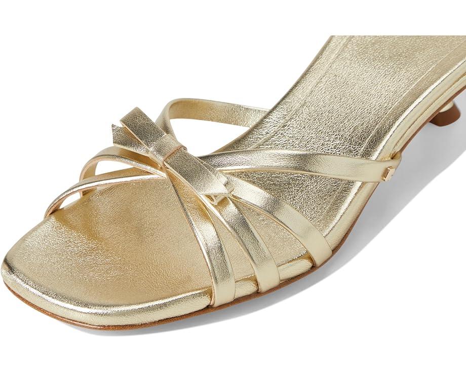 Styled with a bow detail, the Kate Spade New York® Carolina Metallic Leather Kitten Heel Sandals are perfect to pair with your party gowns and dresses. These heeled sandals are made of a leather upper, insole, and lining. Comfortable and stylish, these slip-on heels make a great addition to your footwear collection.