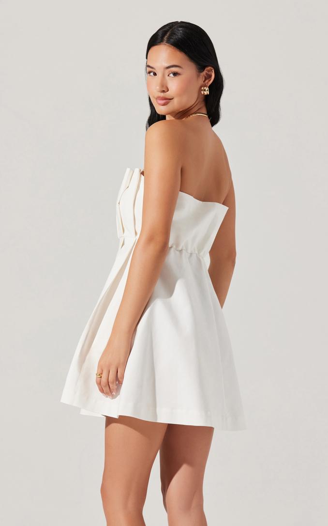 This chic strapless dress features a structured bodice with elegant pleating, creating a modern and sophisticated silhouette. The crisp white fabric adds a fresh touch, making it perfect for summer gatherings, parties, or any special occasion.