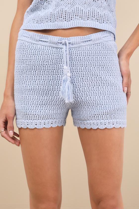 These adorable, pierced crochet knit shorts by Jacquie the Label are easy, breezy to wear and style all season long. The mid-rise silhouette features long tassel ties that thread through the elasticized waistband, atop a figure-skimming fit with scalloped trim along the hems.