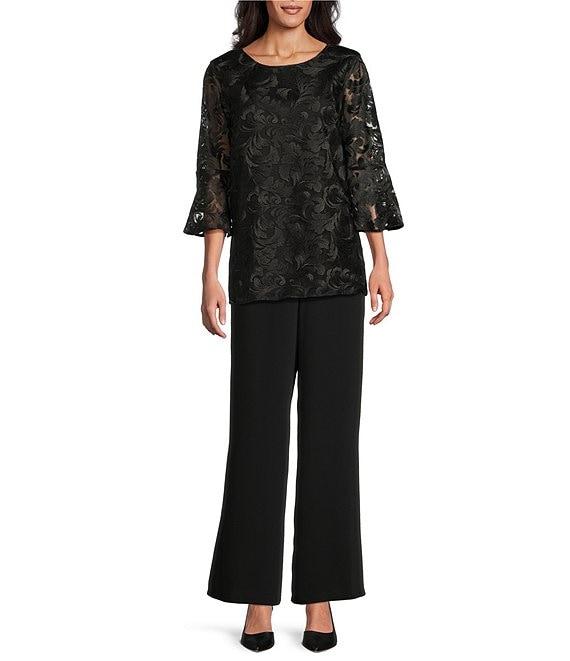 From Caroline Rose, this dress features: Embroidered mesh lace with subtle sheen fabrication Tunic silhouette Scoop neckline 3/4 bell sleeves Easy fit Bodice lined Straight hemline Pullover construction Approx. 30" length Polyester/nylon; lining: polyester/spandex Dry clean or hand wash Made in the USA.