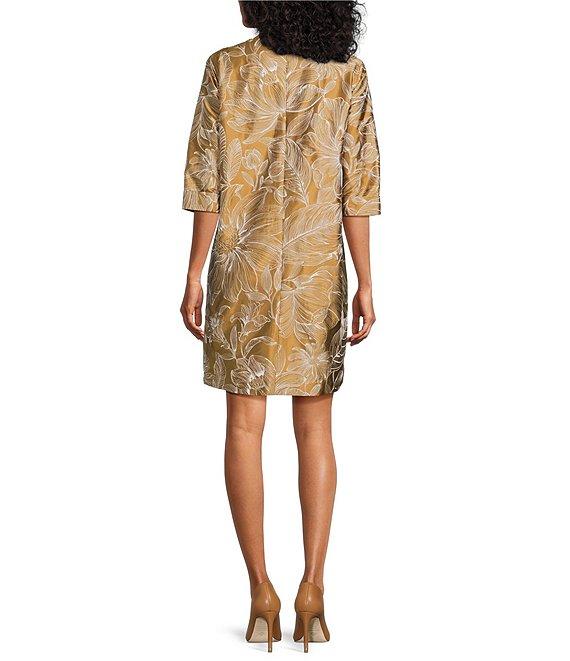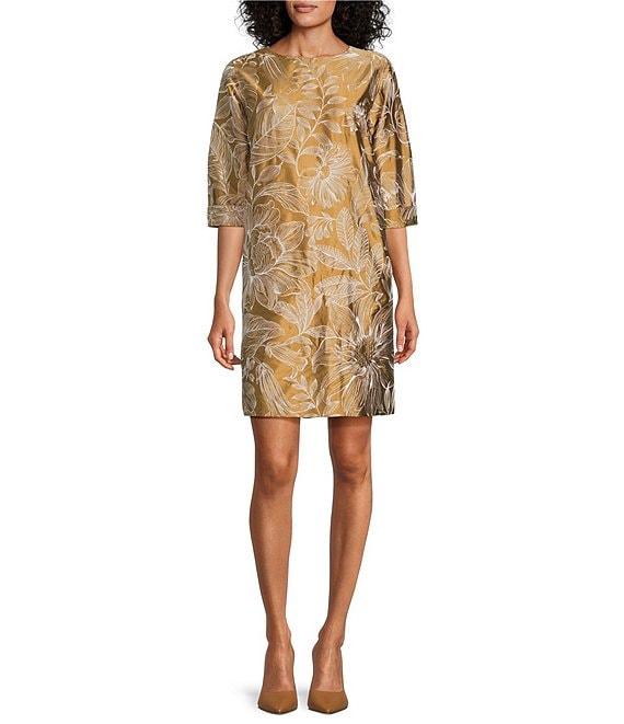 From Caroline Rose, this dress features: Exotic embroidery floral jacquard woven fabrication Shift silhouette Scoop neckline 3/4 cuffed sleeves Bust dartsSide seam pocketsStraight hemLinedHidden back zip closure Approx. 37" length Polyester; lining: polyesterDry clean Made in the USA.