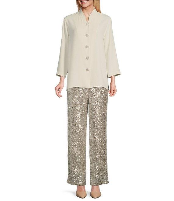 From Caroline Rose, this jacket features: Crepe matte fabrication Mandarin collar neckline 3/4 sleeves Easy fitting Unlined Straight hemline Black pave rhinestone buttons with loop closure Approx. 27" length Polyester Dry clean Made in the USA.