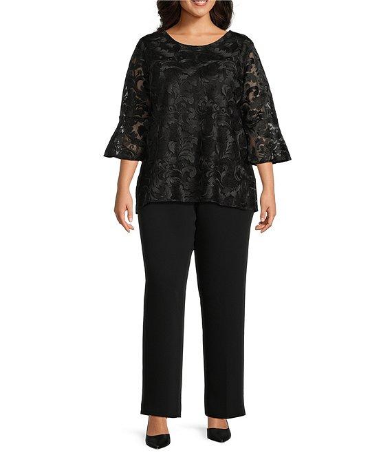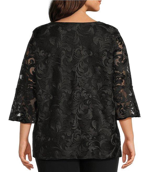 From Caroline Rose Plus, this tunic features: Embroidered mesh lace with subtle sheen fabrication Tunic silhouette Scoop neckline 3/4 bell sleeves Easy fit Bodice lined Straight hemline Pullover construction Approx. 33" length Polyester/nylon; lining: polyester/spandex Dry clean or hand wash Made in the USA.