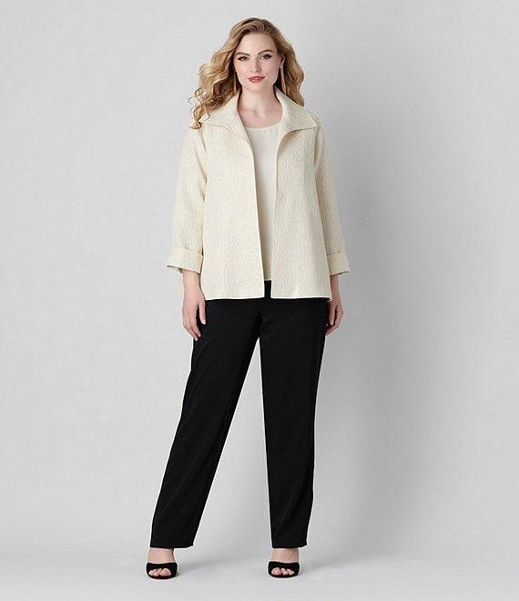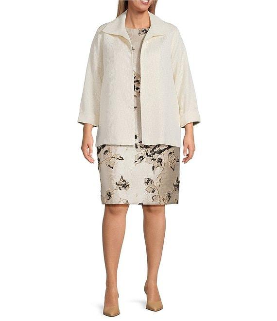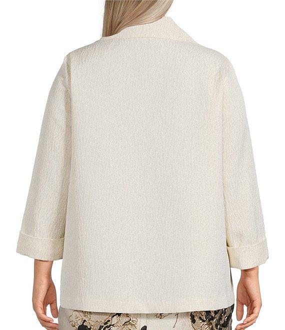 From Caroline Rose Plus, this jacket features: Textured shimmer jacquard woven fabrication Spread collar neckline Bracelet sleeves with cuffs Side seam pockets Straight hem Lined Open-front; no closure Approx. 29" length Polyester/cotton/metallic; lining: polyester Dry clean Made in the USA.