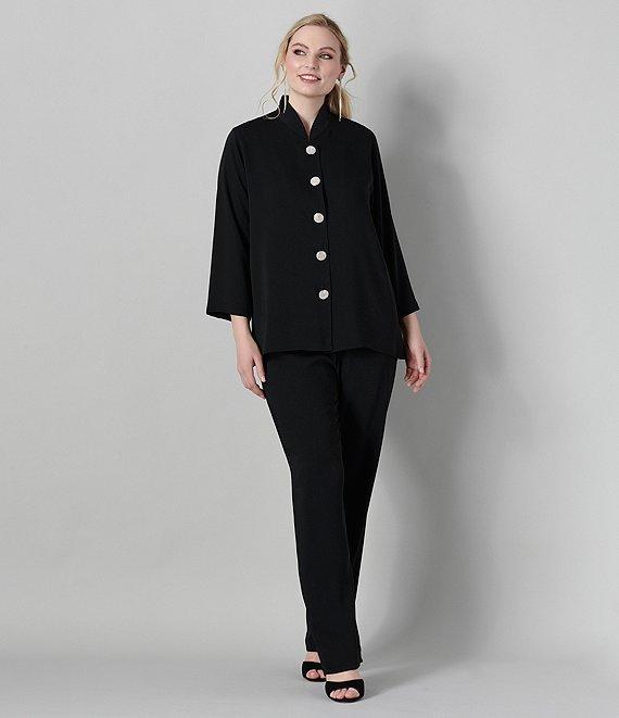 From Caroline Rose Plus, this jacket features: Crepe matte fabrication Mandarin collar neckline 3/4 sleeves Easy fitting Unlined Straight hemline Black pave rhinestone buttons with loop closure Approx. 28" length Polyester Dry clean Made in USA.