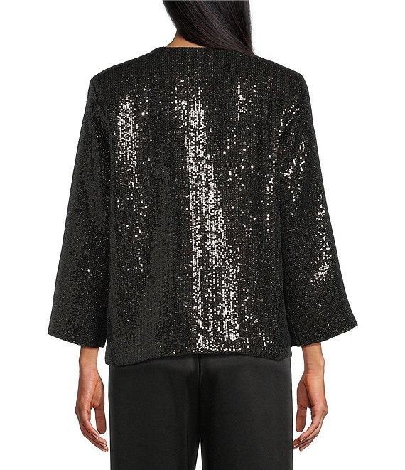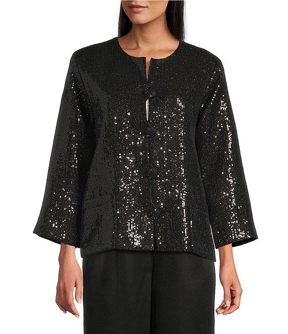 From Caroline Rose, this jacket features: Sequin sparkle woven fabrication Easy fitting boxy silhouette Round neckline 3/4 sleeves Front patch pockets Straight hem Lined Beaded buttons with loop over button front closure Approx. 24" in length Polyester/cotton/wool/rayon/metallic Lining: polyester Dry clean Made in the USA.