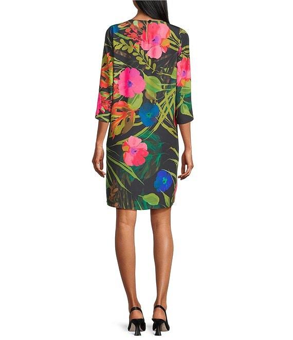 From Caroline Rose, this dress features: Woven fabrication Tropical sunset floral print Easy shift silhouetteScoop neckline 3/4 sleeves Darts at bustline Side seam pocketsStraight hemline Keyhole back button closure Approx. 37" length Polyester Hand wash/line dry or dry clean Made in the USA.