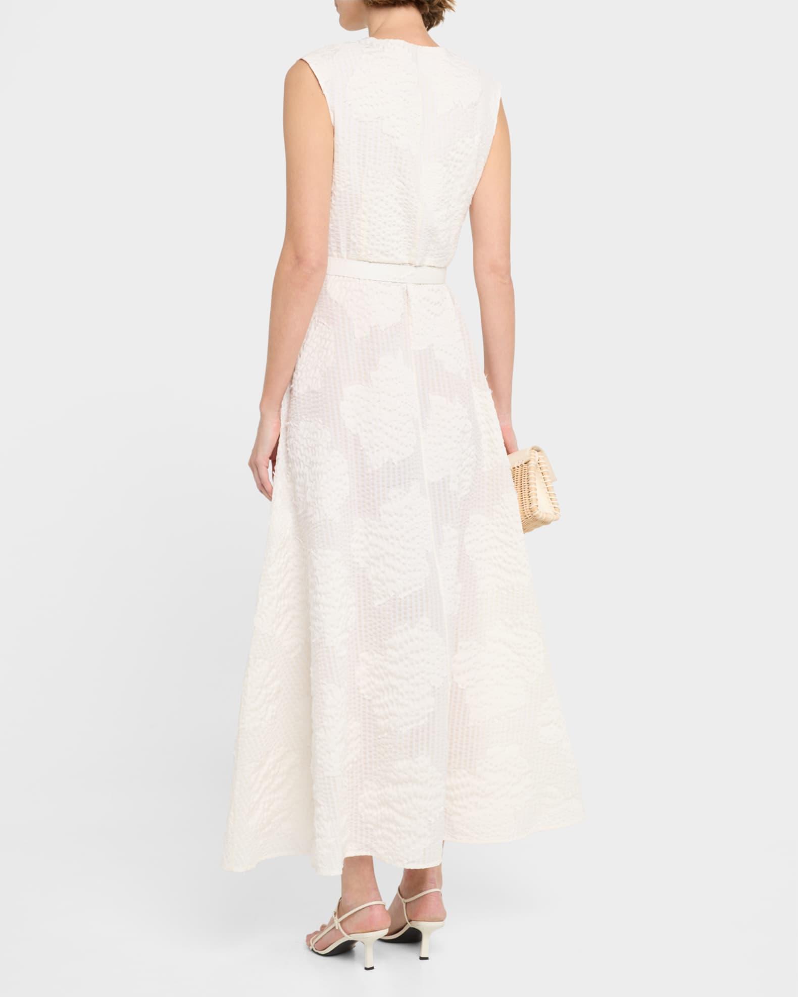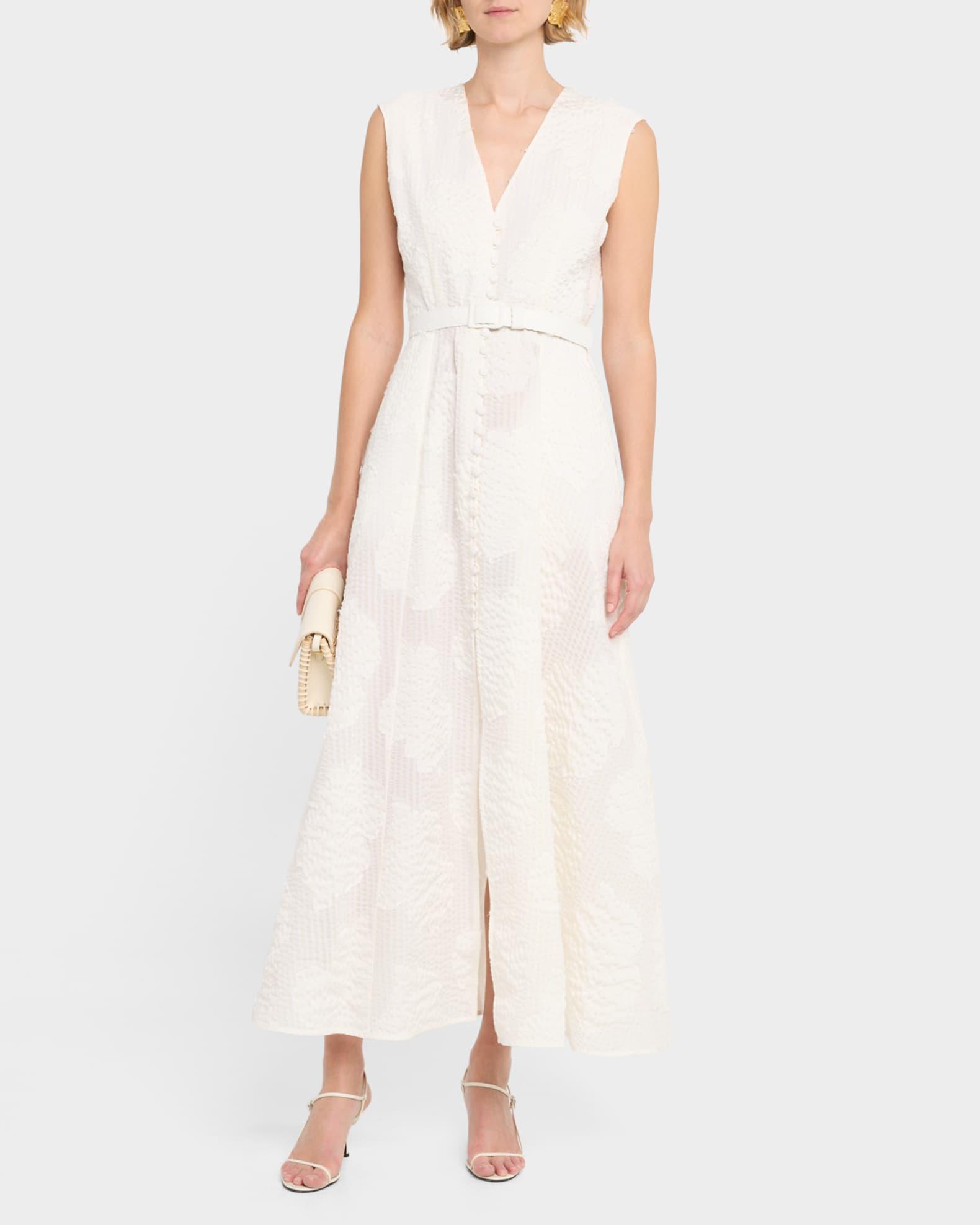 Evi Grintela "Caroline" maxi shirtdress crafted in seersucker fil coupé poplin V neckline; button front Sleeveless Belted waist On-seam pockets Front slit hem Ankle length A-line silhouette Cotton/polyester/nylon/polyamide Machine wash cold Made in Greece