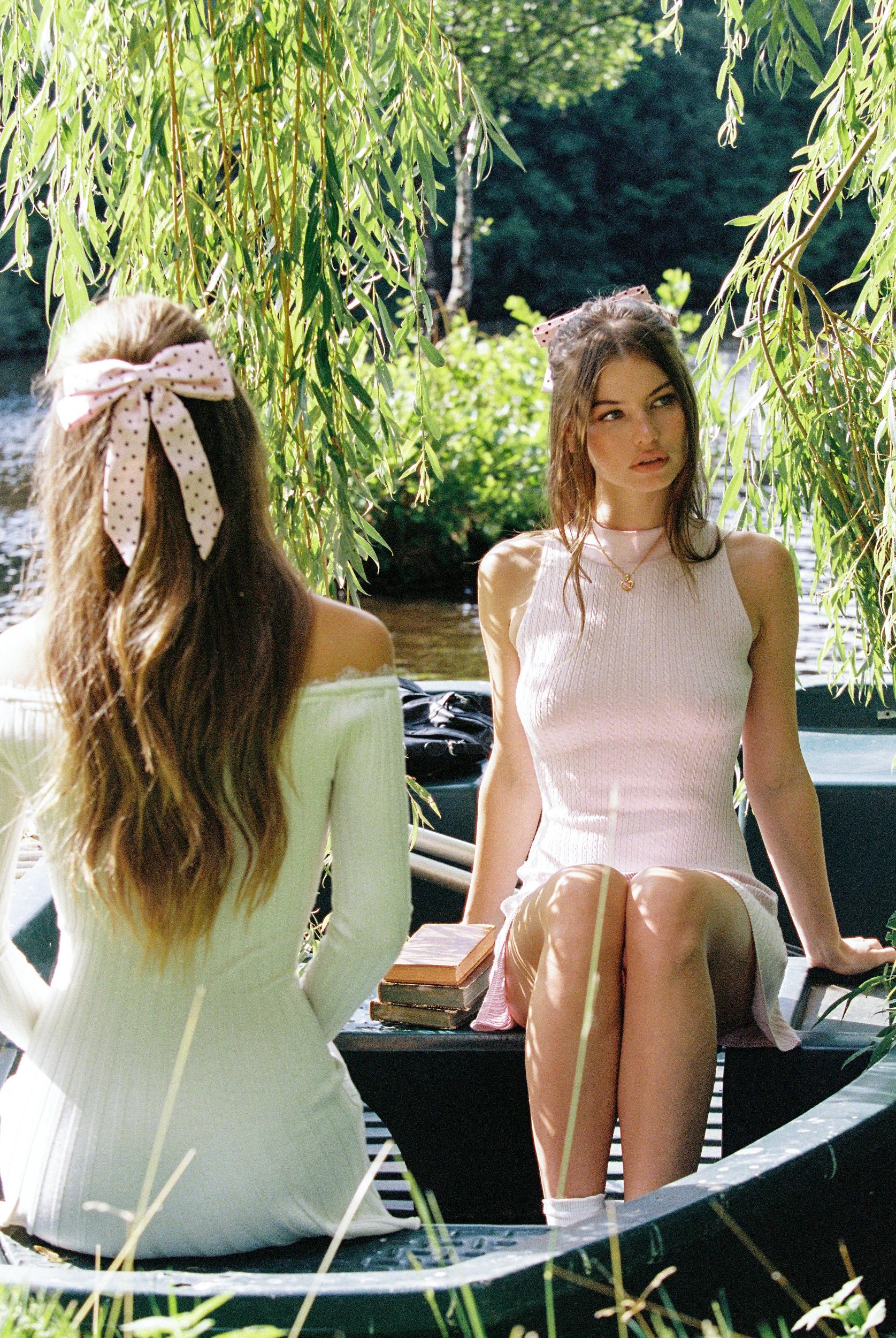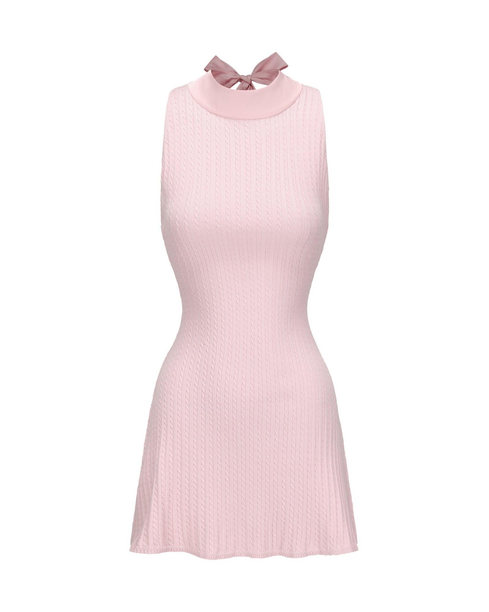 The Carrie Dress captures romantic sweetness in every detail. Made from high-twist core-spun yarn, this fitted knit dress flatters with a twisted rib texture and flared hem. A glossy satin ribbon wraps from front to back, tying into a delicate bow above a heart-shaped cutout back, making this backless knit dress a charming statement from every angle.