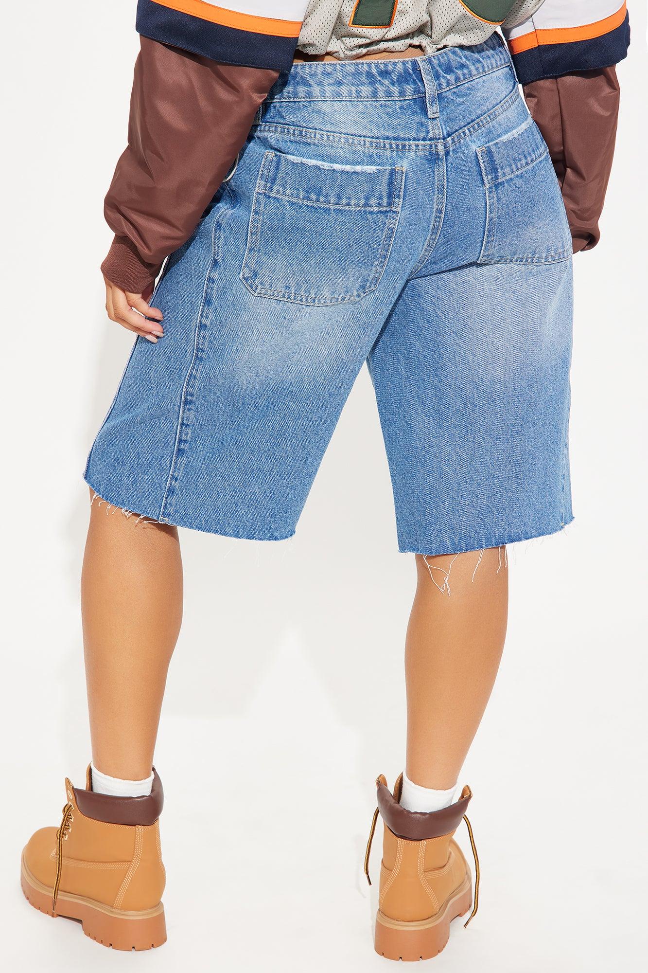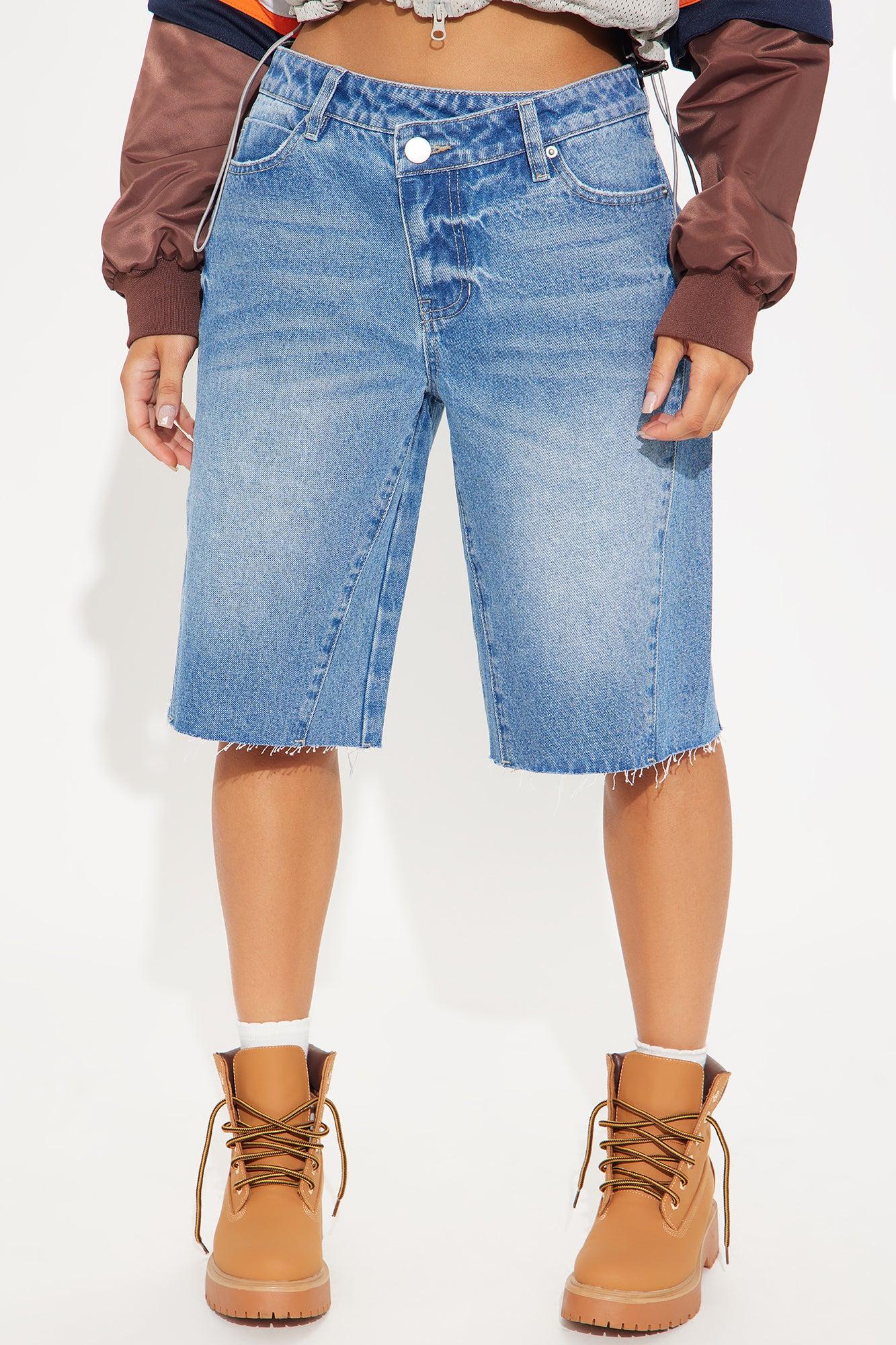 Available In Medium Wash. Denim Short 5 Pocket Waistband Crossover Raw Hem Seaming Detail 10.5" High Rise 12" Inseam Non-Stretch Denim Disclaimer: Due To The Specialized Wash, Each Garment Is Unique. 100% Cotton Imported California Proposition 65WARNING: Cancer and Reproductive Harm - www.P65Warnings.ca.gov.