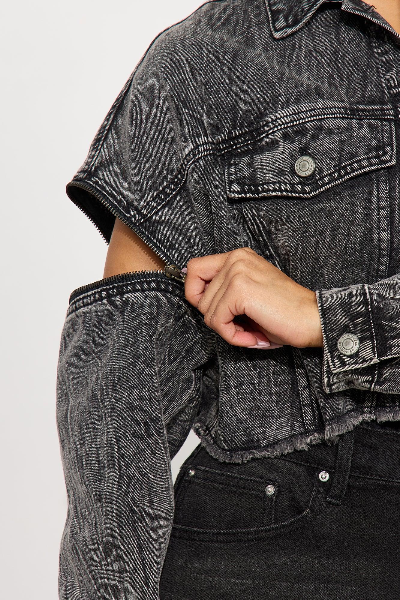 Available In Acid Wash Black And Clear. Denim Jacket Collar Front Chest Pockets Button Up Closure Cut Off Hem Convertible Zip Off Sleeves Shell : 100% Cotton Non Stretch Imported