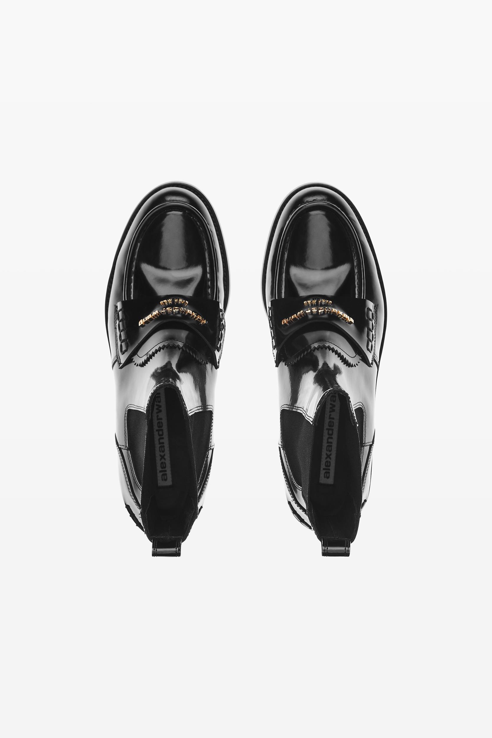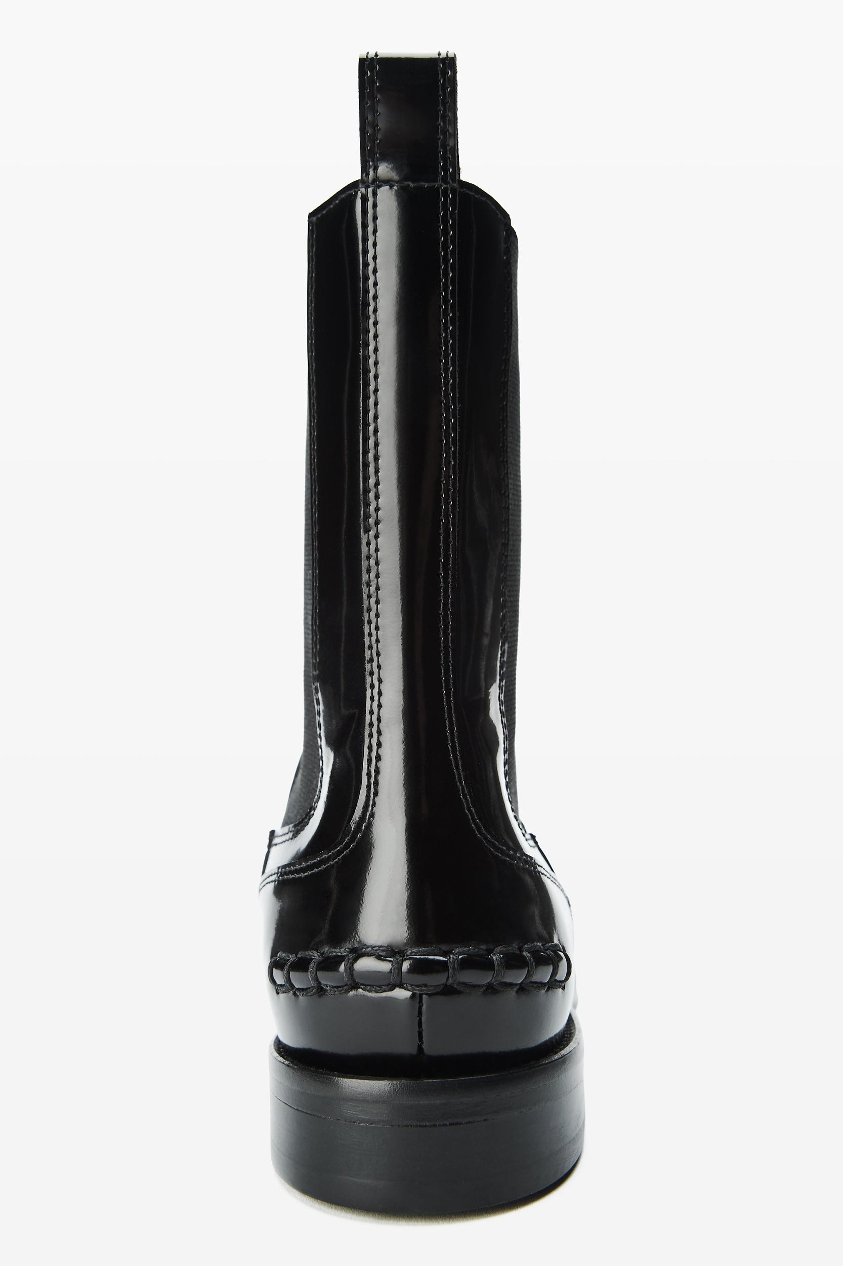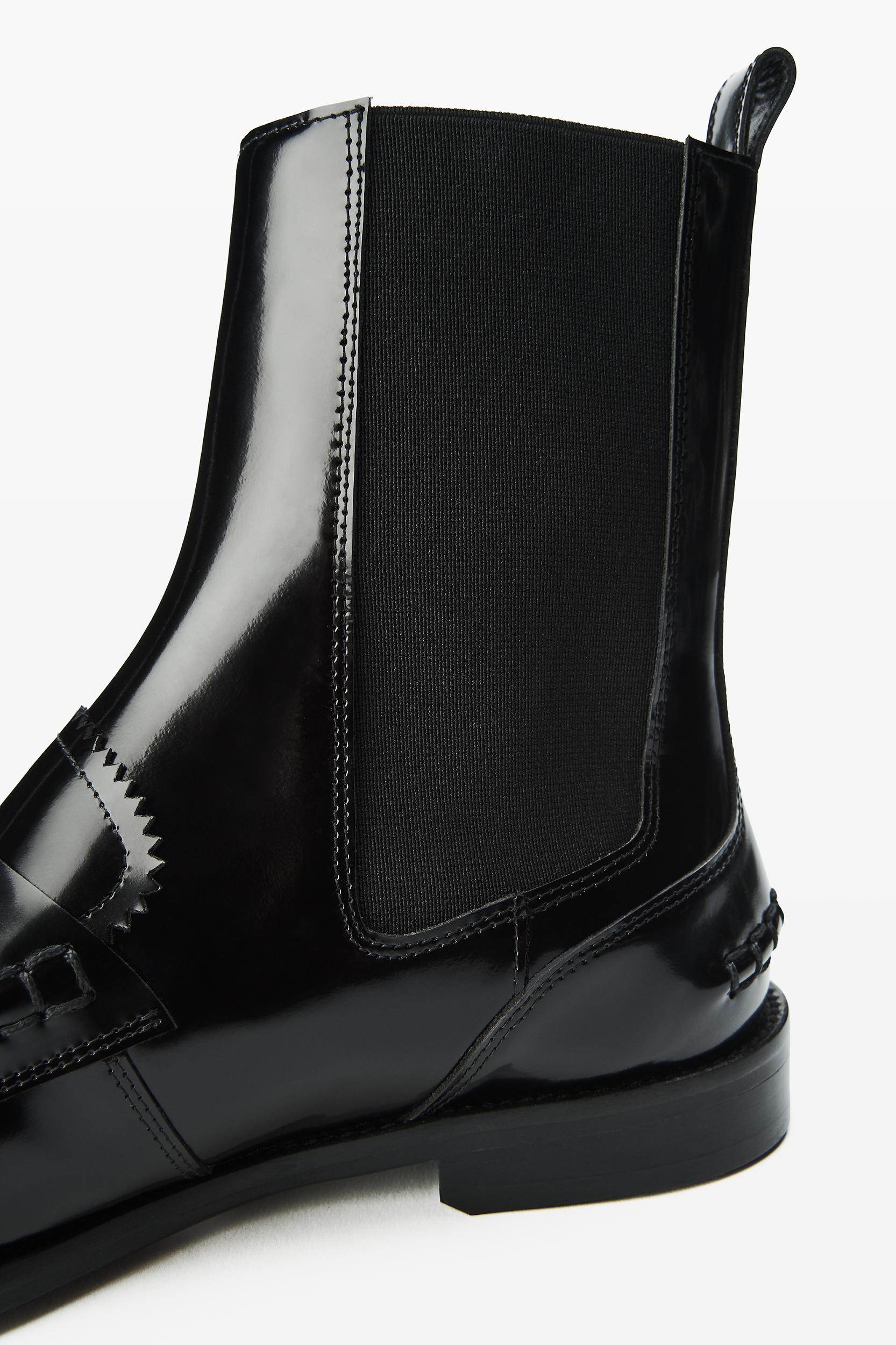 Black spazzolato leather ankle boot crafted with genuine Blake welted construction. Detailed with a metal logo keeper, heat-creased finishing, and a smooth calf leather lining set on a leather outsole.