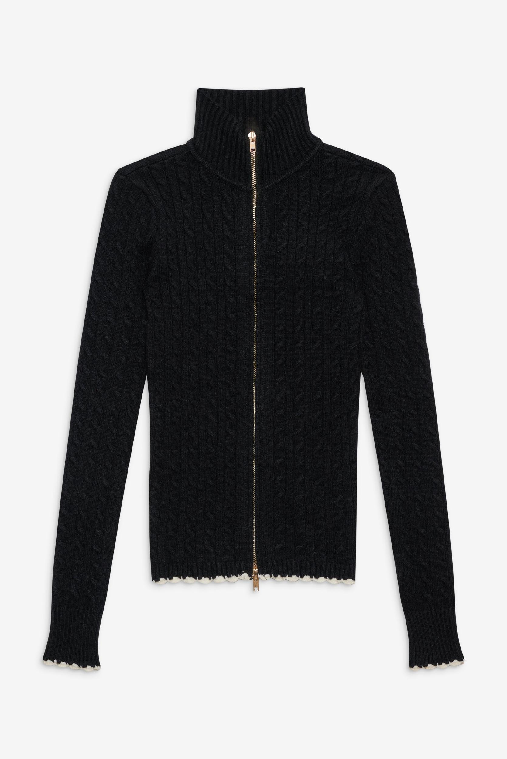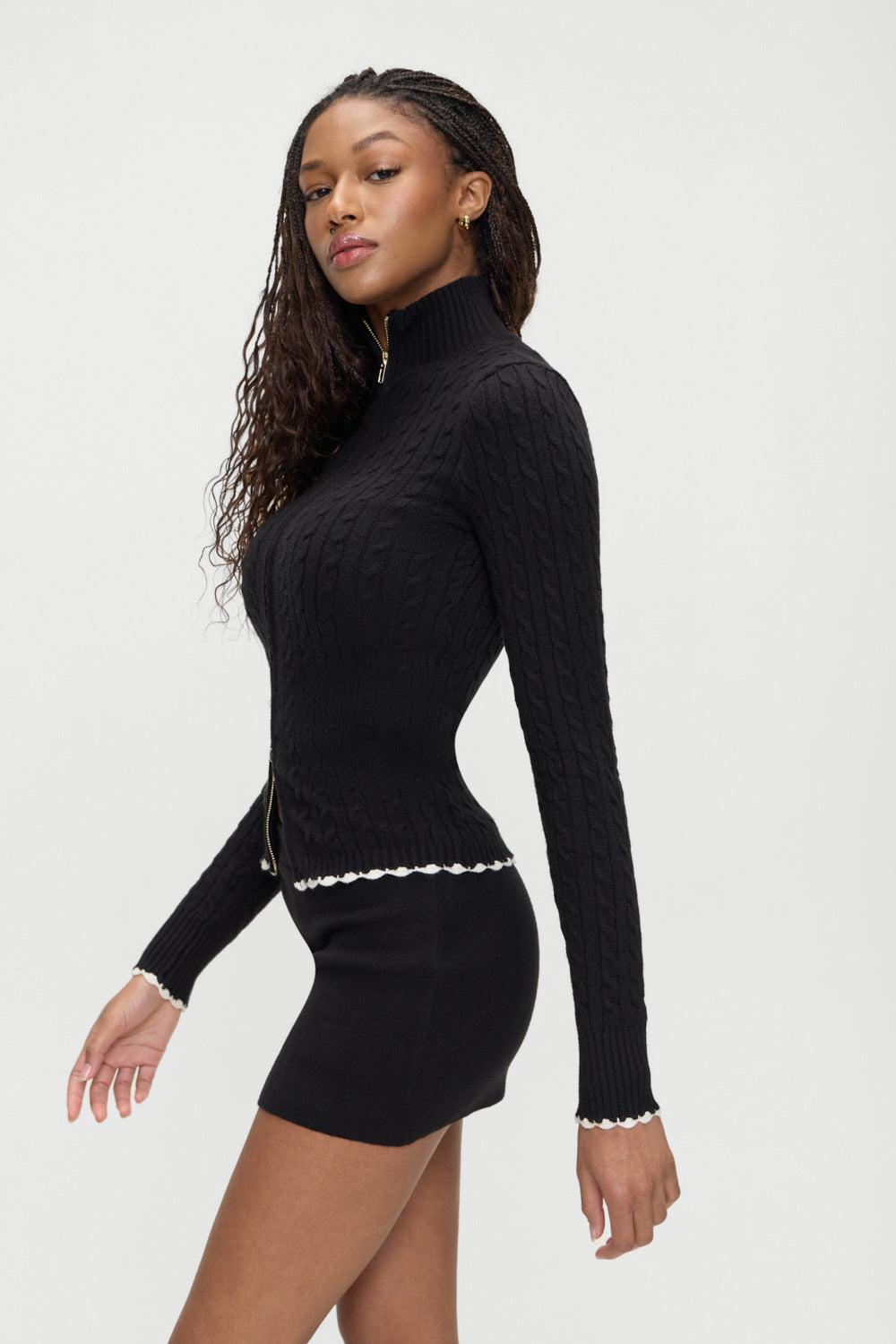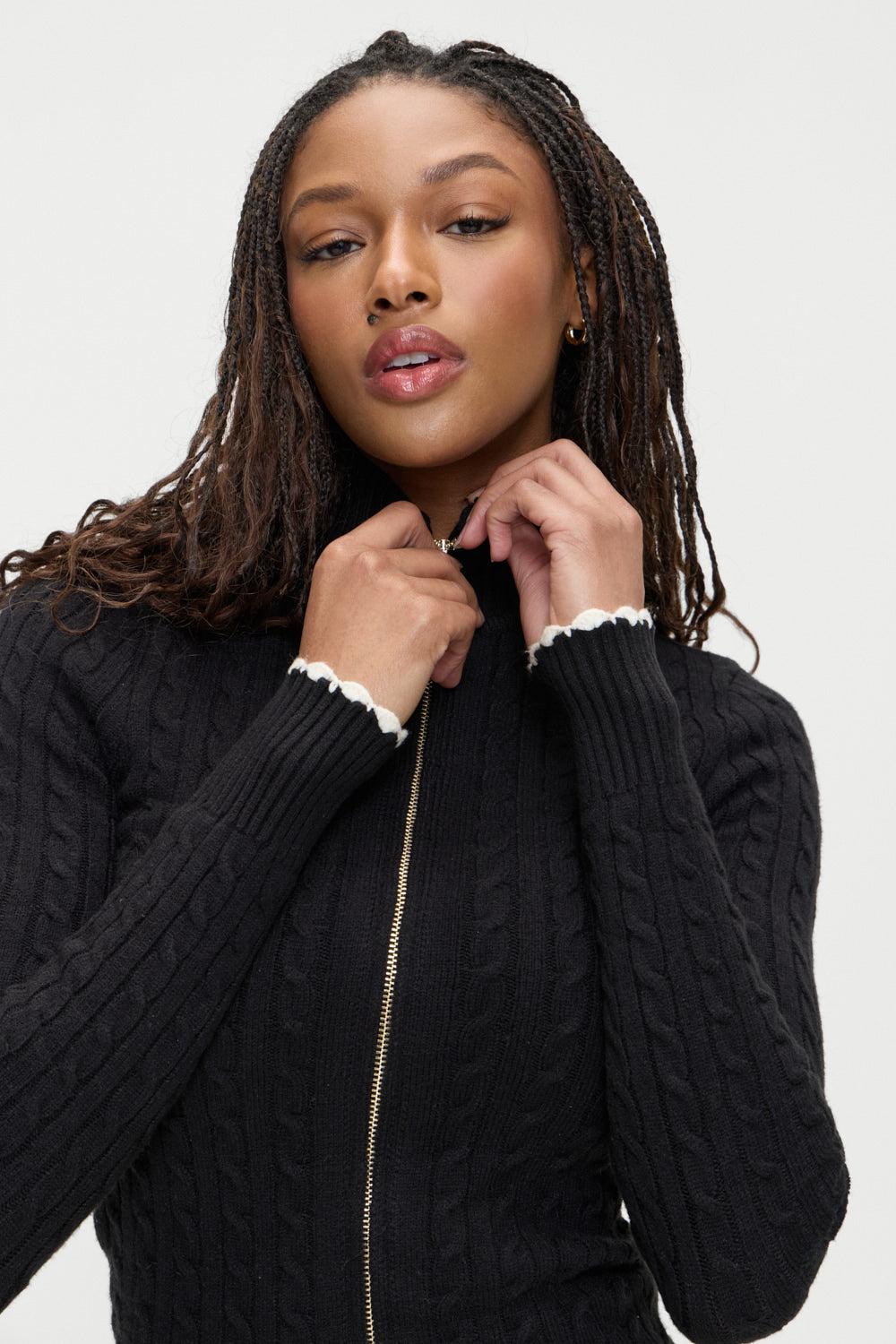 The Carter sweater is a timeless piece designed to be mixed, matched, and cherished forever. With its figure-defining silhouette and longer length, this Black Friday Exclusive sweater will carry you through the cooler seasons year after year. Details Cable knit design Two-way zipper for versatile styling Mock neck Ribbed detailing on neck and cuffs Designed in our signature Cloud Knit fabric Fabric 30% Anti-Pilling Acrylic + 29% Polyester + 21% Modal + 20% Nylon Model Size & Fit This style runs true to size Angela is wearing a size Small Height 5' 11" (180cm) Bust 33" (84), Waist 22” (56.5cm), Hips 34” (86.5cm)