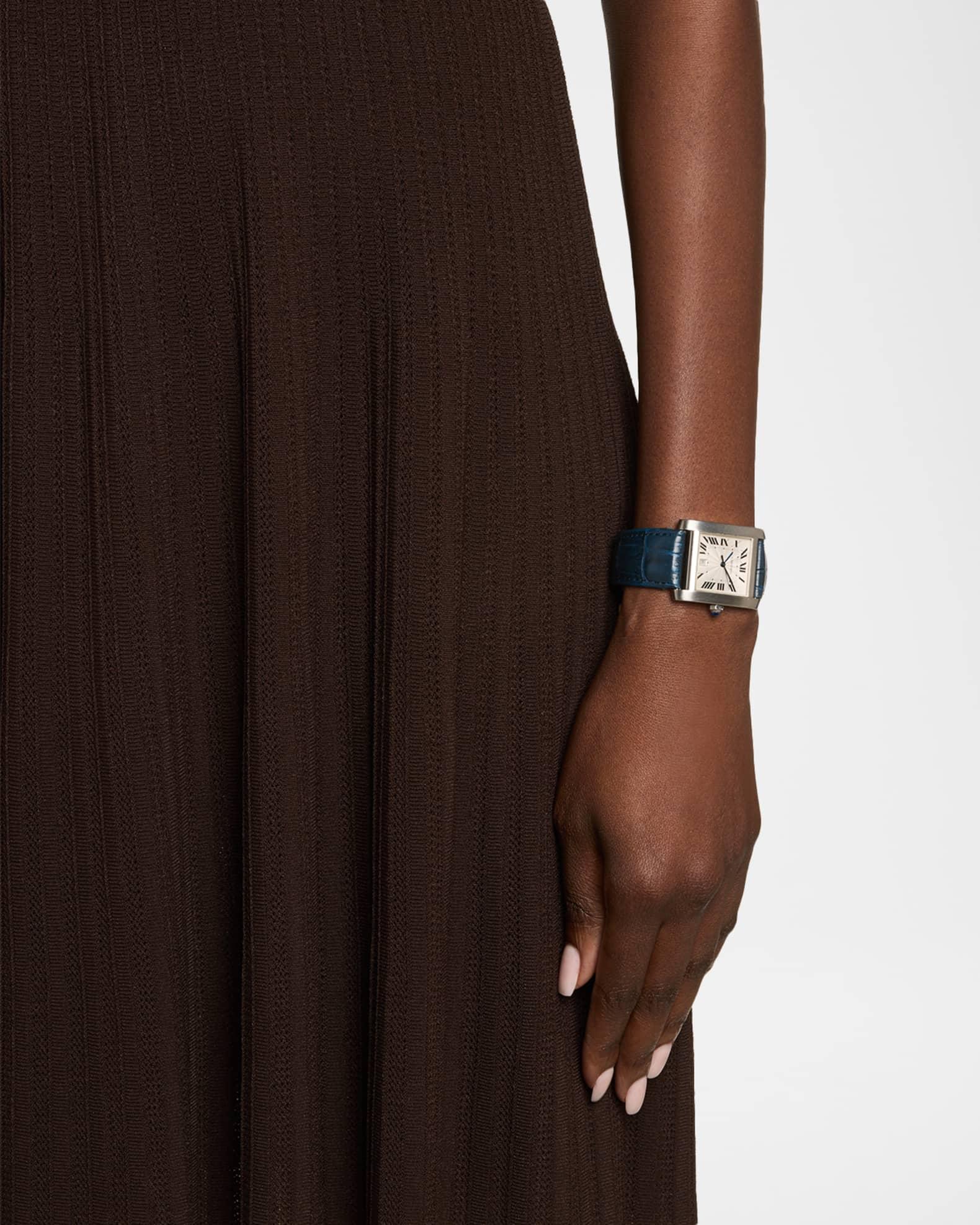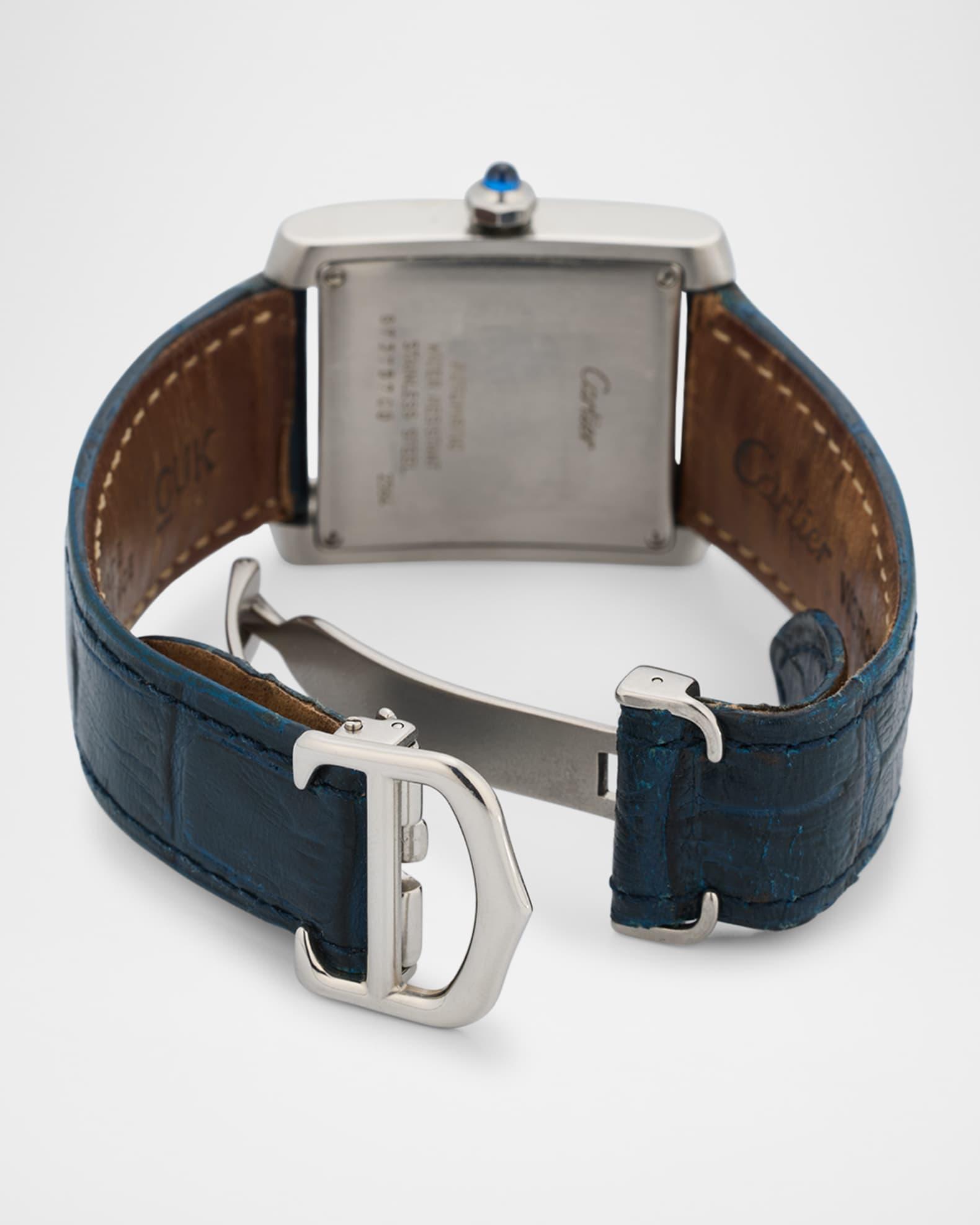 This Cartier Tank Française timepiece is one of many variations from the brand's signature watch collection. Approx. 30mm square screw-down case Stainless steel watch head and buckle Guilloché dial with Roman numerals Square date window at 6 o'clock Sword hands; sweep seconds Reference # 2564 Automatic movement Sapphire crystal window Cartier dark blue alligator strap with folding clasp Circa 1990s Each Vintage Watch purchase includes a Neiman Marcus watch box and a Neiman Marcus certificate of authenticity. Original boxes and papers are not offered in most instances and will be noted on the site when they are included. Made in Switzerland Please Note: All watches have a one-year warranty on parts and labor, excluding stem and crystal. A watch that has been dropped, abused, or overwound is not covered under the warrant. This watch is FINAL SALE.