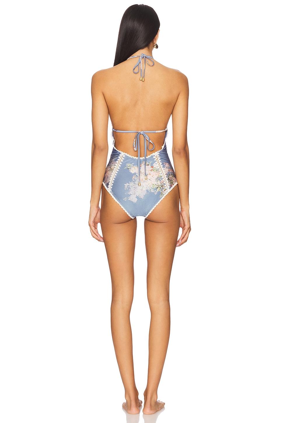 Self: 80% polyamide, 20% elastaneLining: 92% recycled polyamide, 8% elastaneContrast Fabric: 100% cotton. Hand wash cold. Unpadded cups. Halter and back zip closure. Keyhole accent. Midweight jersey swimwear fabric. Made in China. Revolve Style No. ZIMM-WX722. Manufacturer Style No. 4140WSS255.