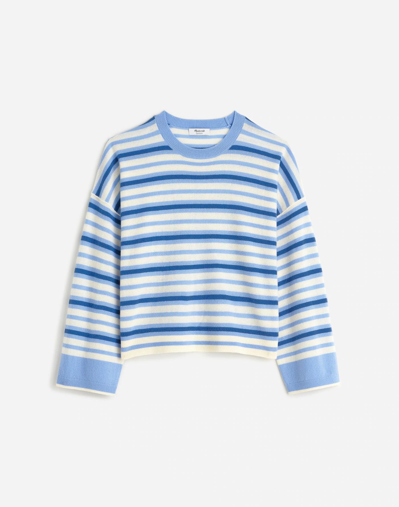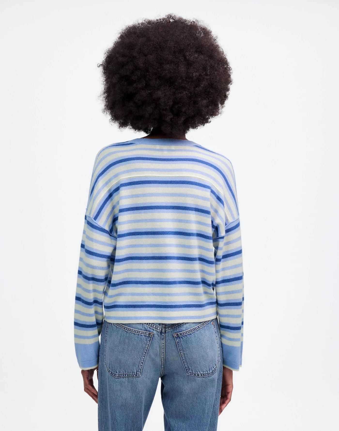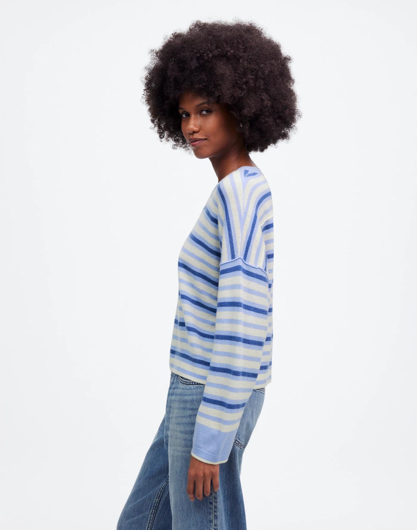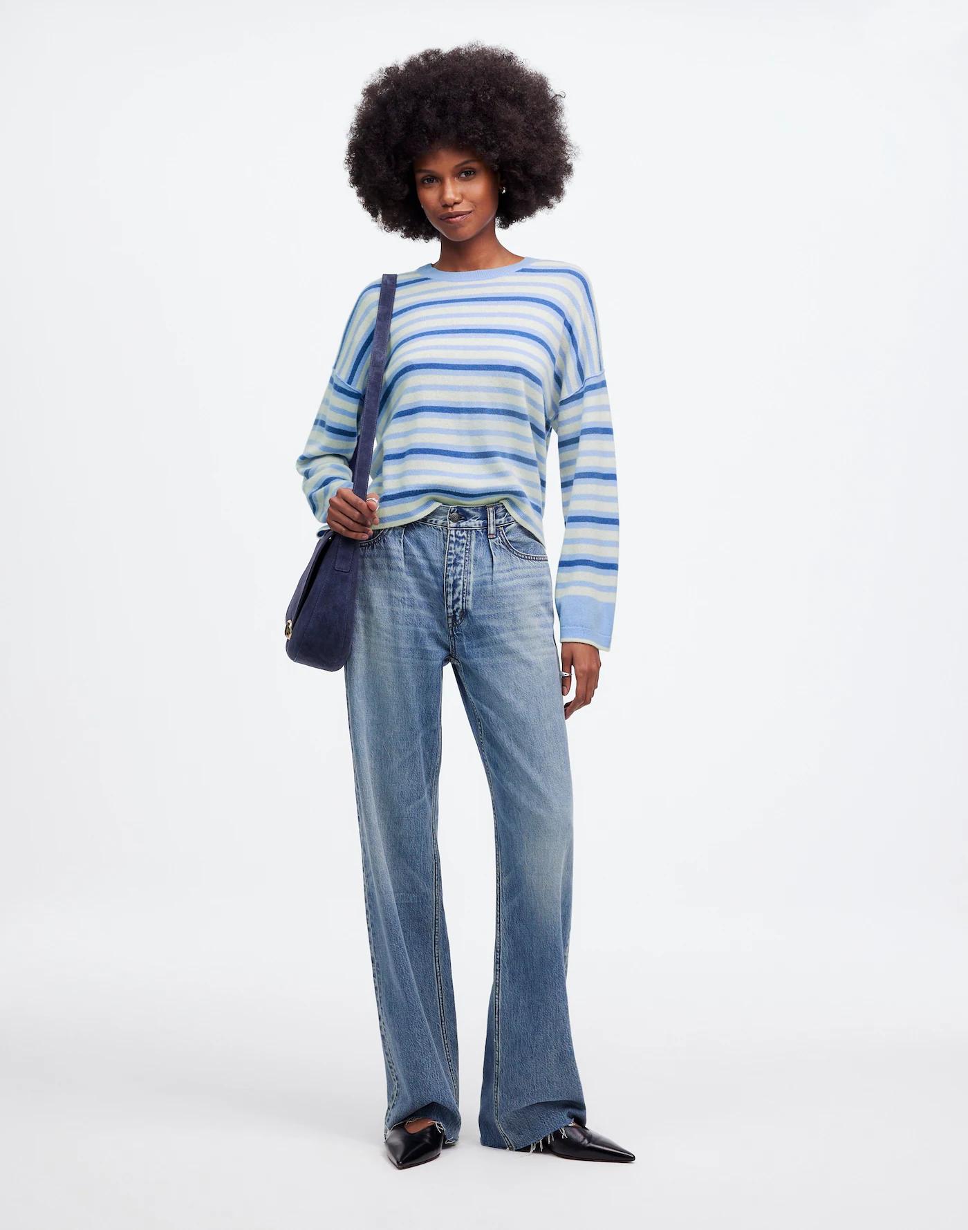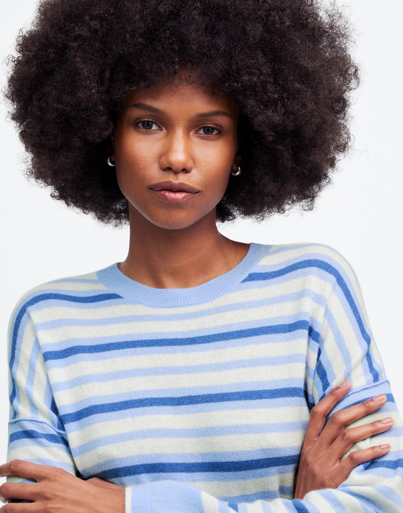 Made of luxe 100 percent cashmere, this striped crewneck sweater has a boxy, relaxed fit, drop shoulders and straight sleeves. It's perfect for pairing with everything from jeans to a leather skirt.