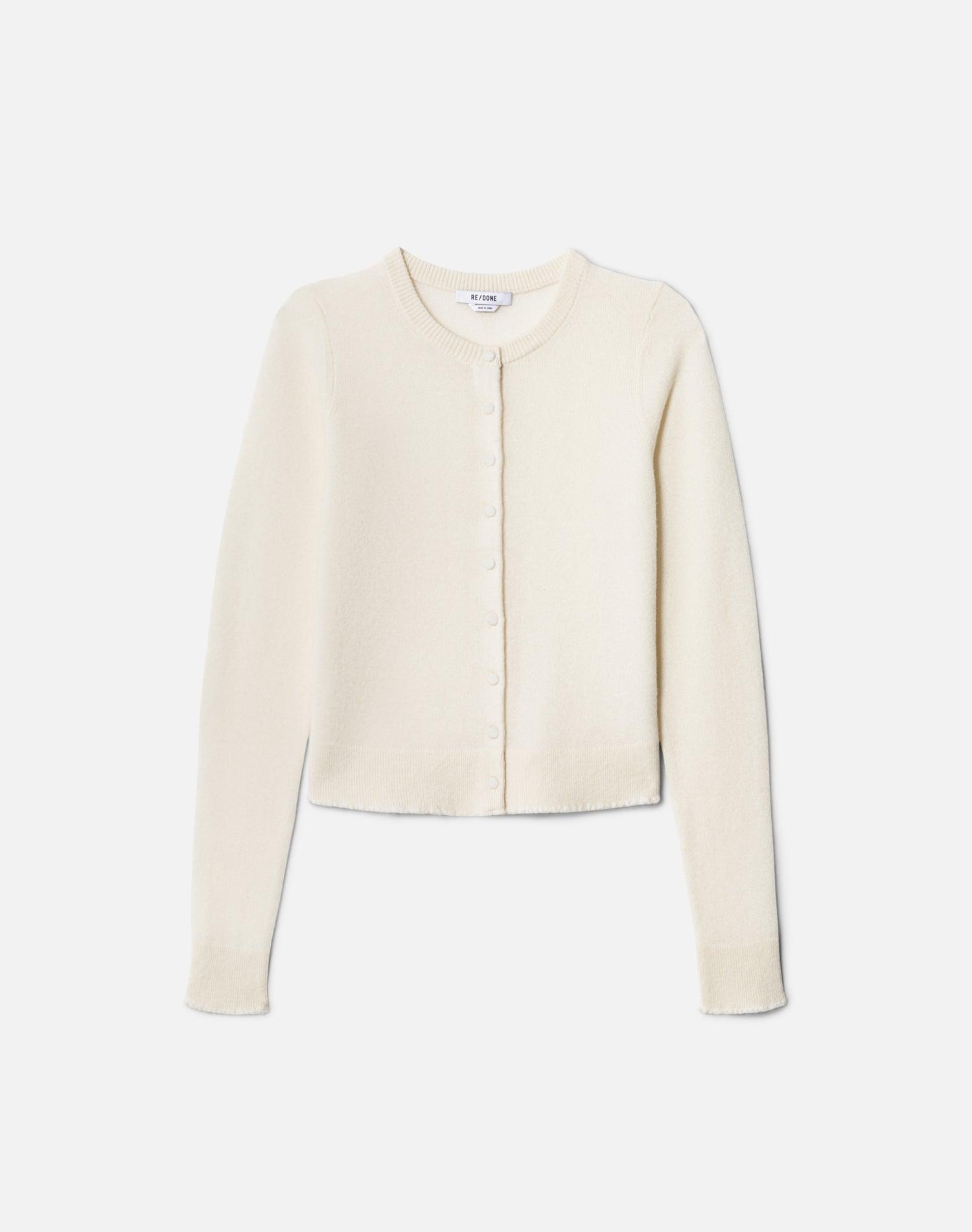 Part of our signature Lived-In Cashmere collection, this crewneck cardigan is a timeless essential with a worn-in feel. Knit from lightweight 100% cashmere, it features a slim, classic silhouette with subtle distressing at the hem and cuffs, tonal covered buttons, and RE/DONE’s signature center back seam. Designed to feel like a vintage favorite — luxurious, effortless, and forever in style.