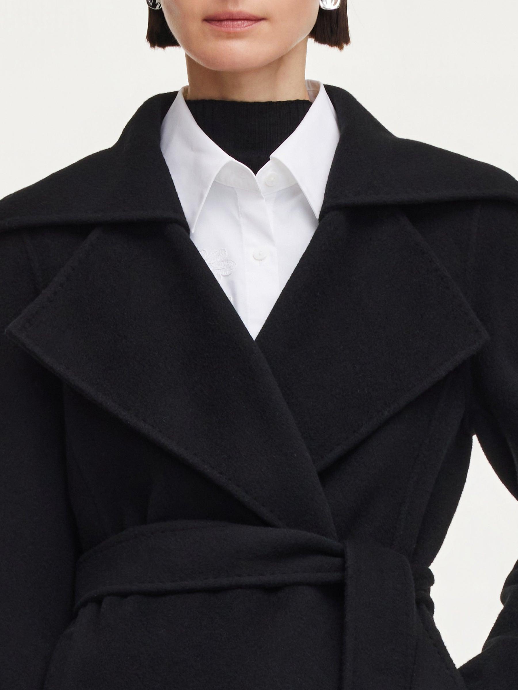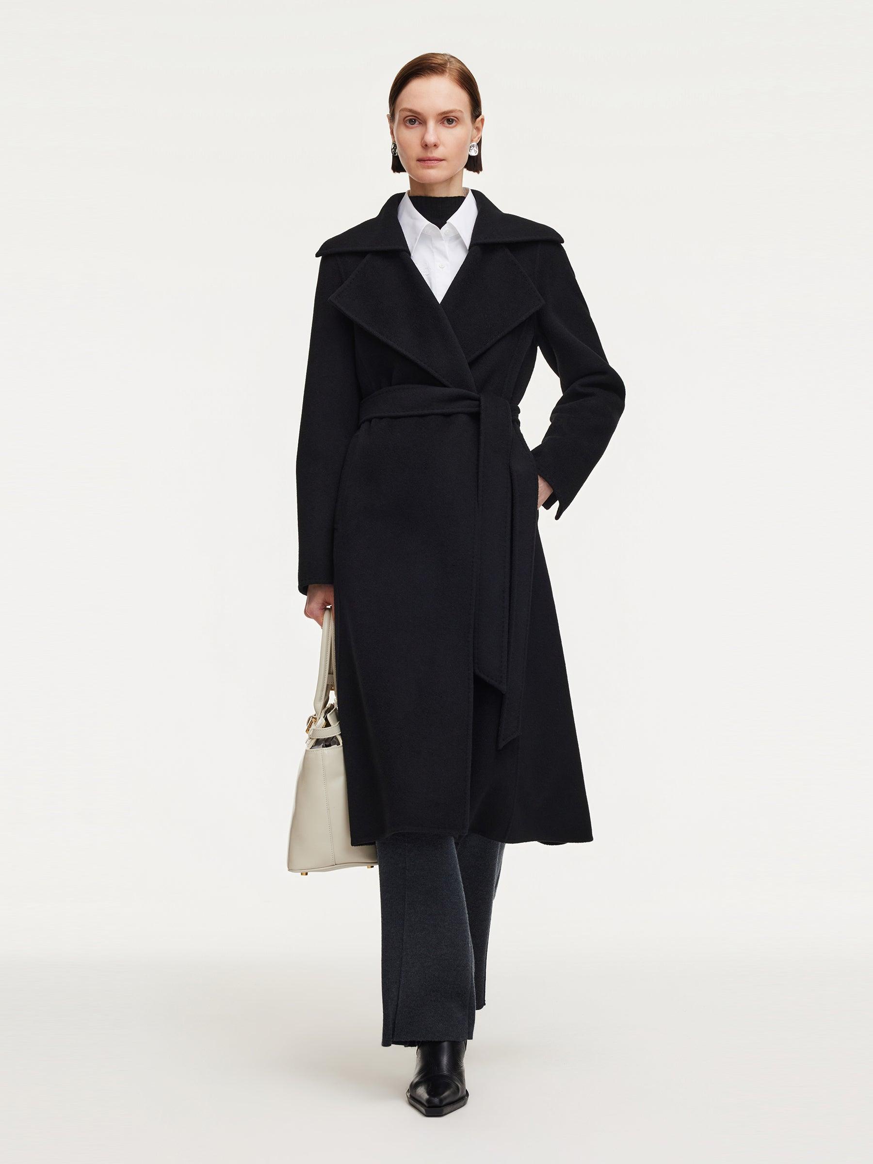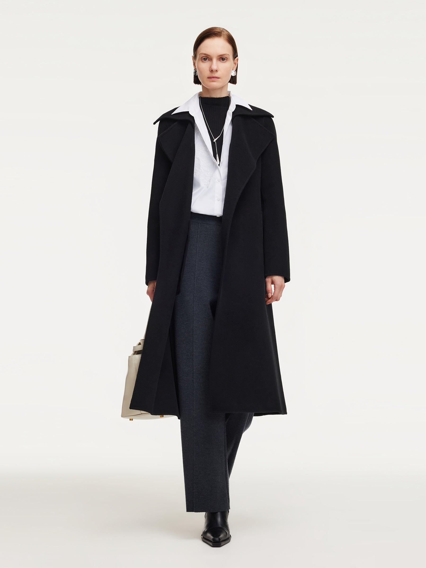 -Cashmere wool blend -With pockets -Long straight silhouette Crafted from a luxurious cashmere–wool blend, this overcoat offers exceptional warmth and a soft, refined touch. The straight silhouette with a subtle waistline elongates the figure for an elegant, slimming look. Featuring a wide lapel, self-tie belt, and sid