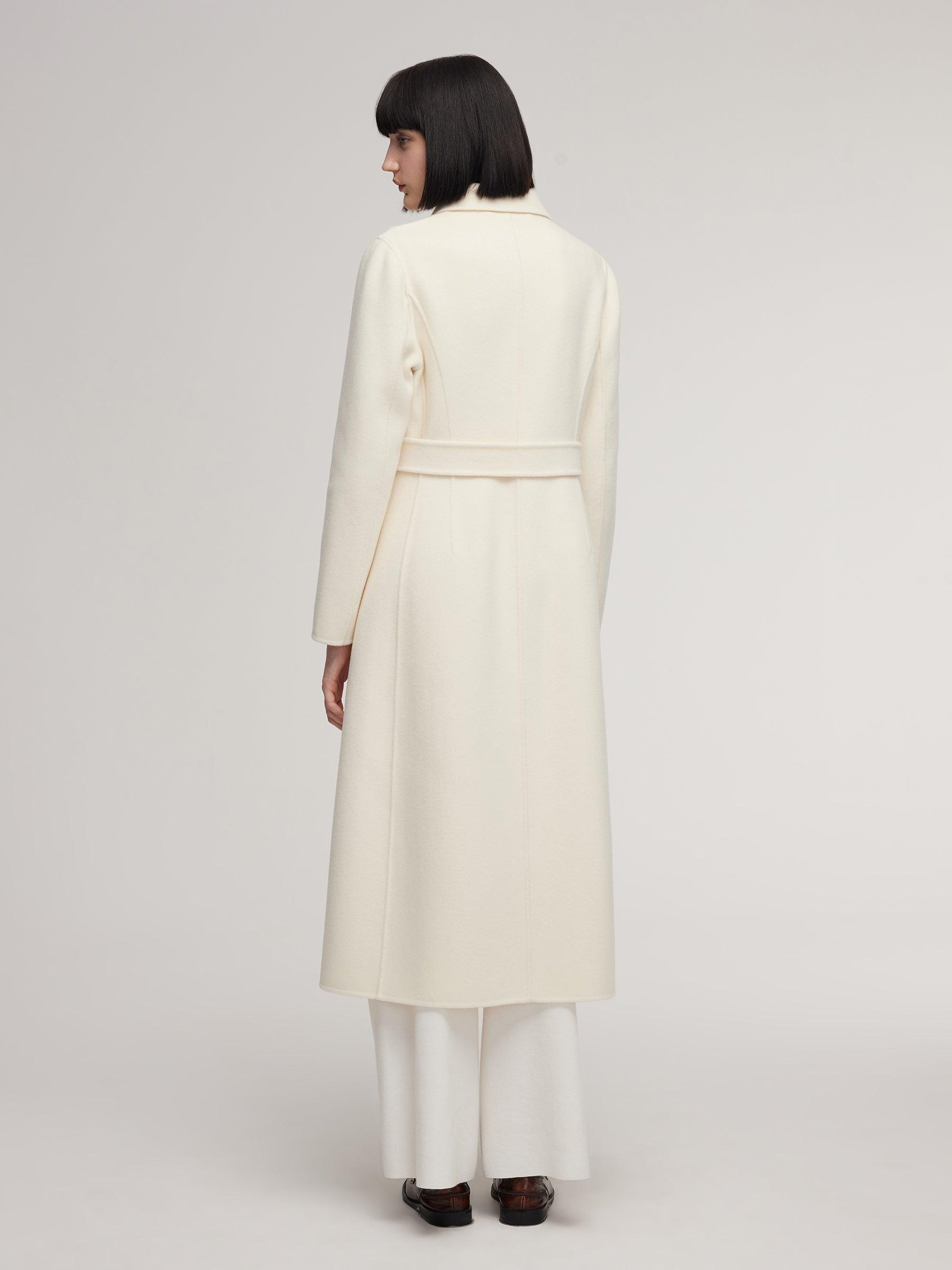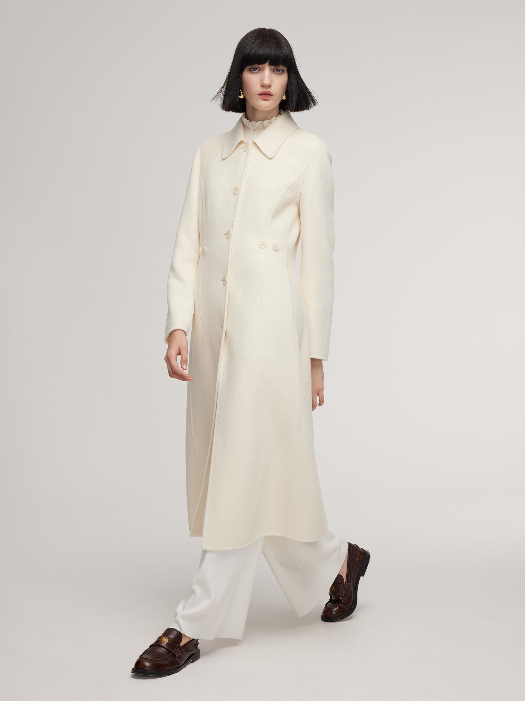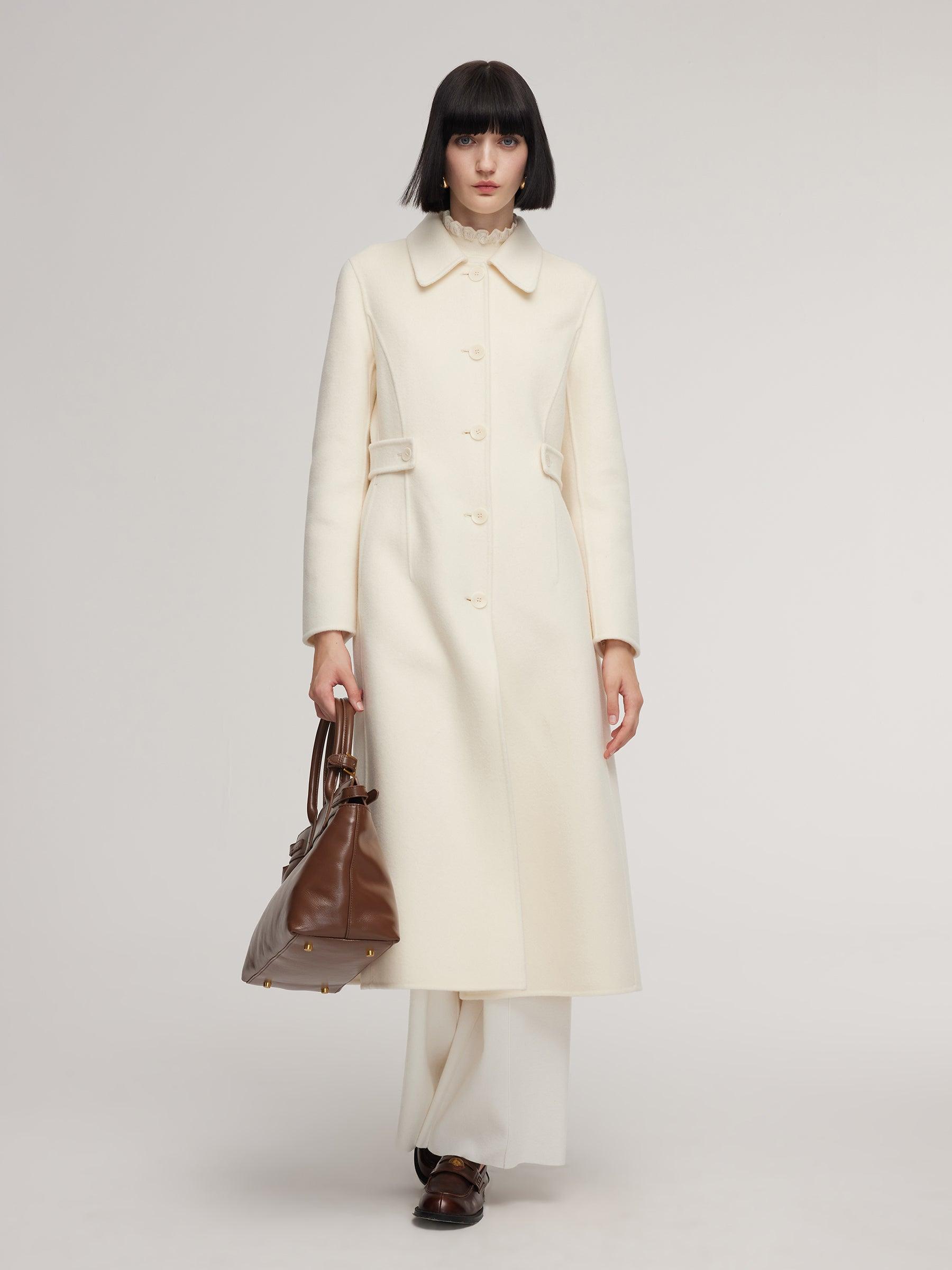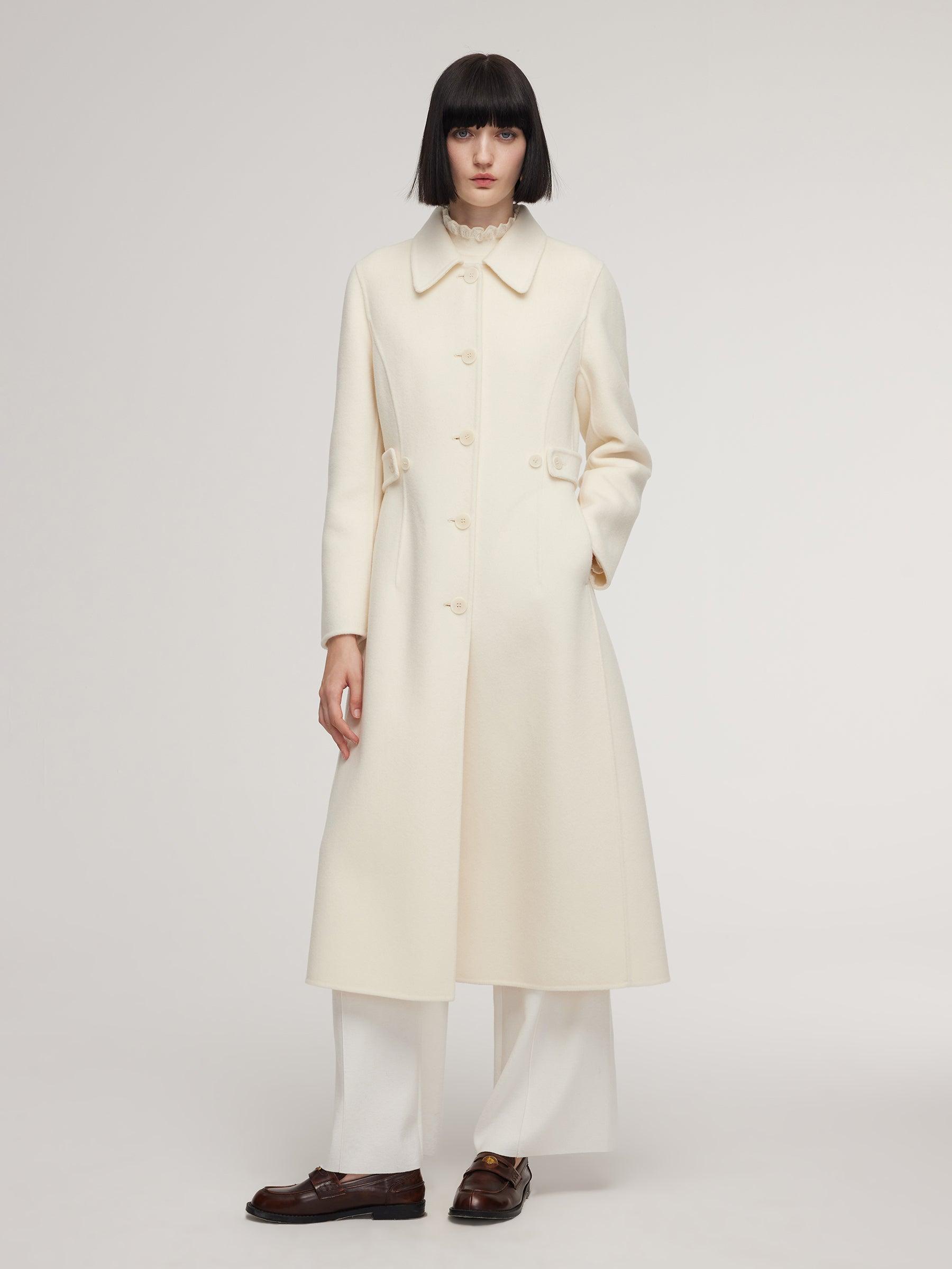 -Cashmere wool blend -With detachable waist tab -With pockets Crafted from a cashmere-wool blend, this overcoat feels soft, smooth, and structured for light, breathable warmth. Princess seams refine the silhouette, while the removable waist tab lets you switch between a defined waist and relaxed ease. The A-line shape