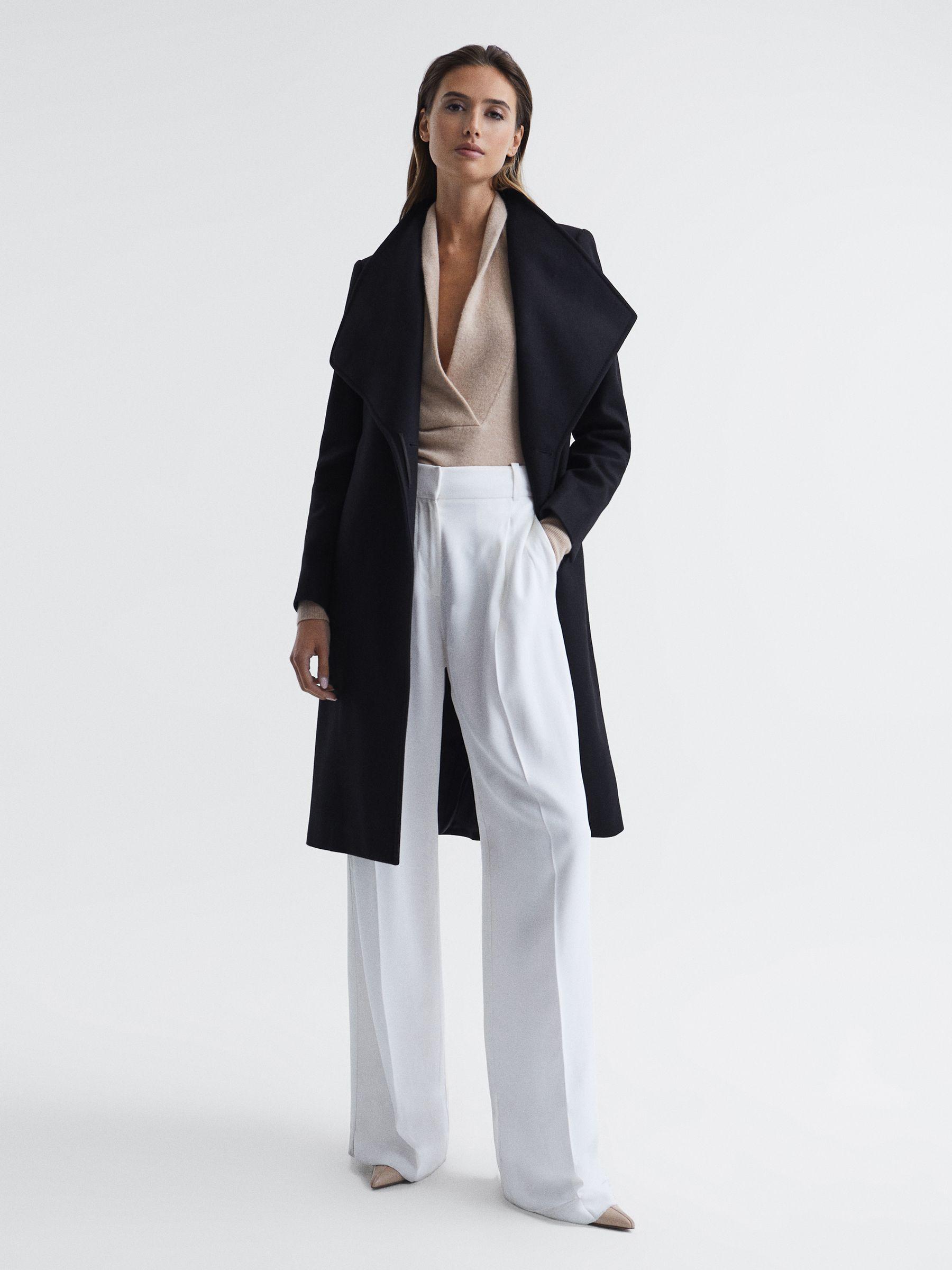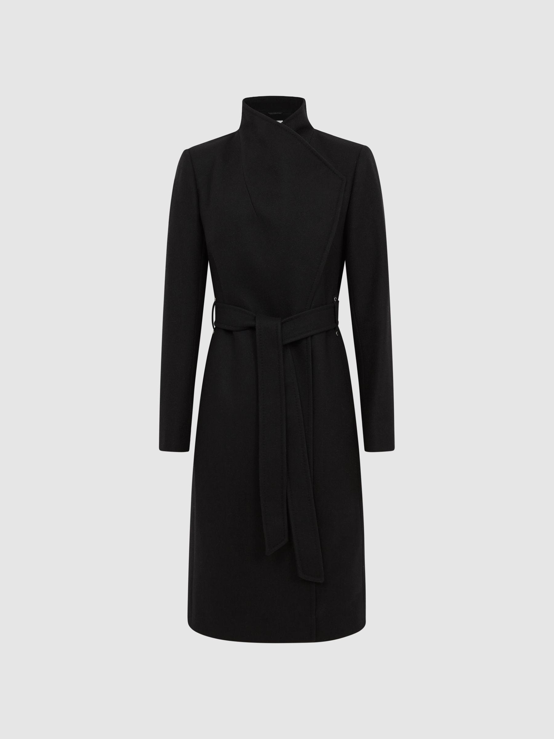 Opt for the Belle coat for a classic profile with a dramatic mood. It is constructed with a double-breasted wrap front that creates a snug feel, then ties at the waist via a self-fabric belt for a cinched silhouette. It's cut from a soft wool and cashmere blend and features concealed buttons, side slip pockets and a high neckline. Team it with light knitwear and trousers to embrace chic cool-weather layering. Magnetic wrap collar closure. Belted waist. Side slip pockets. Fully lined. The model is wearing a size 8. Measurements of model: Height 5ft 10" / 178cm.