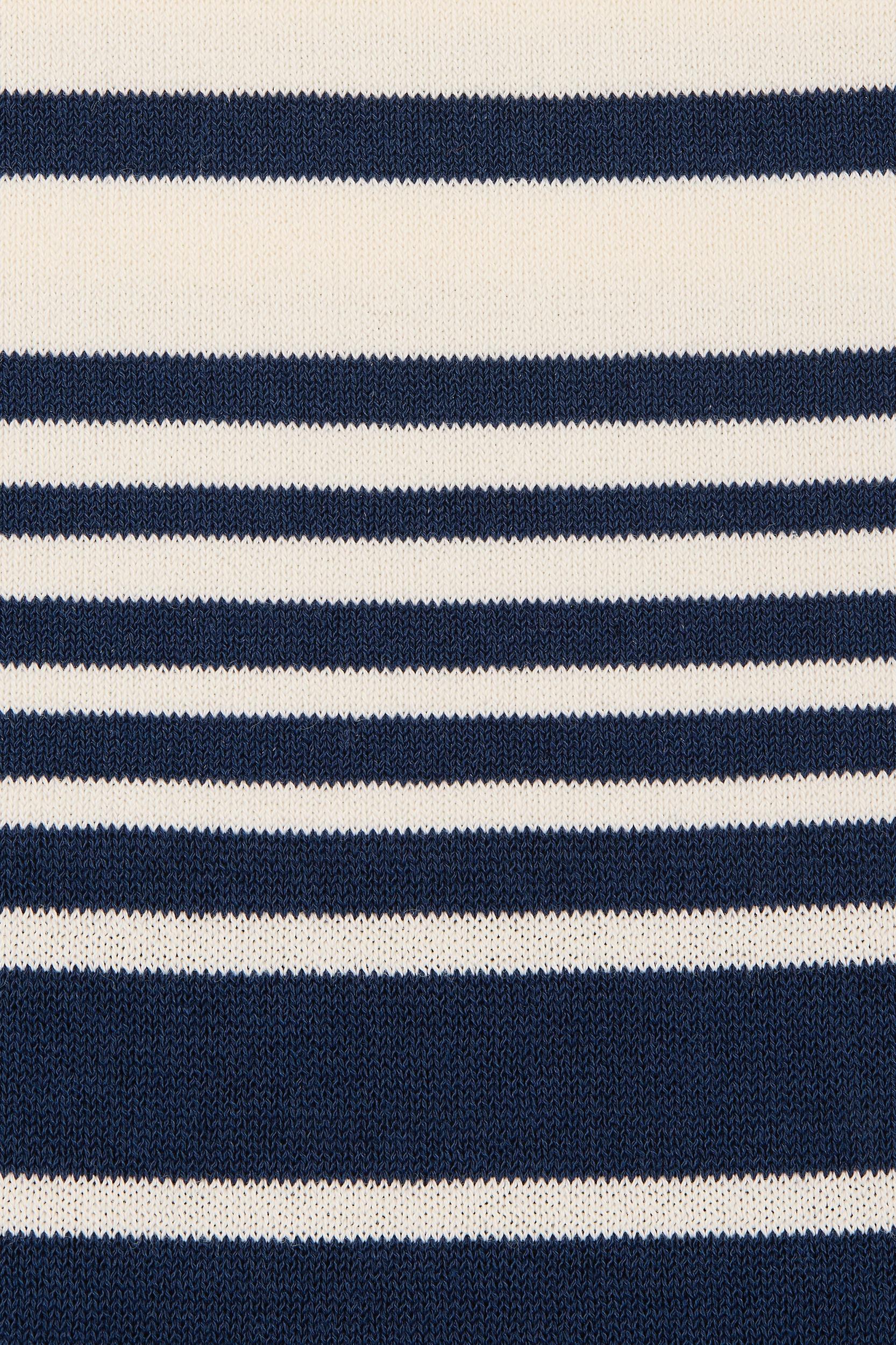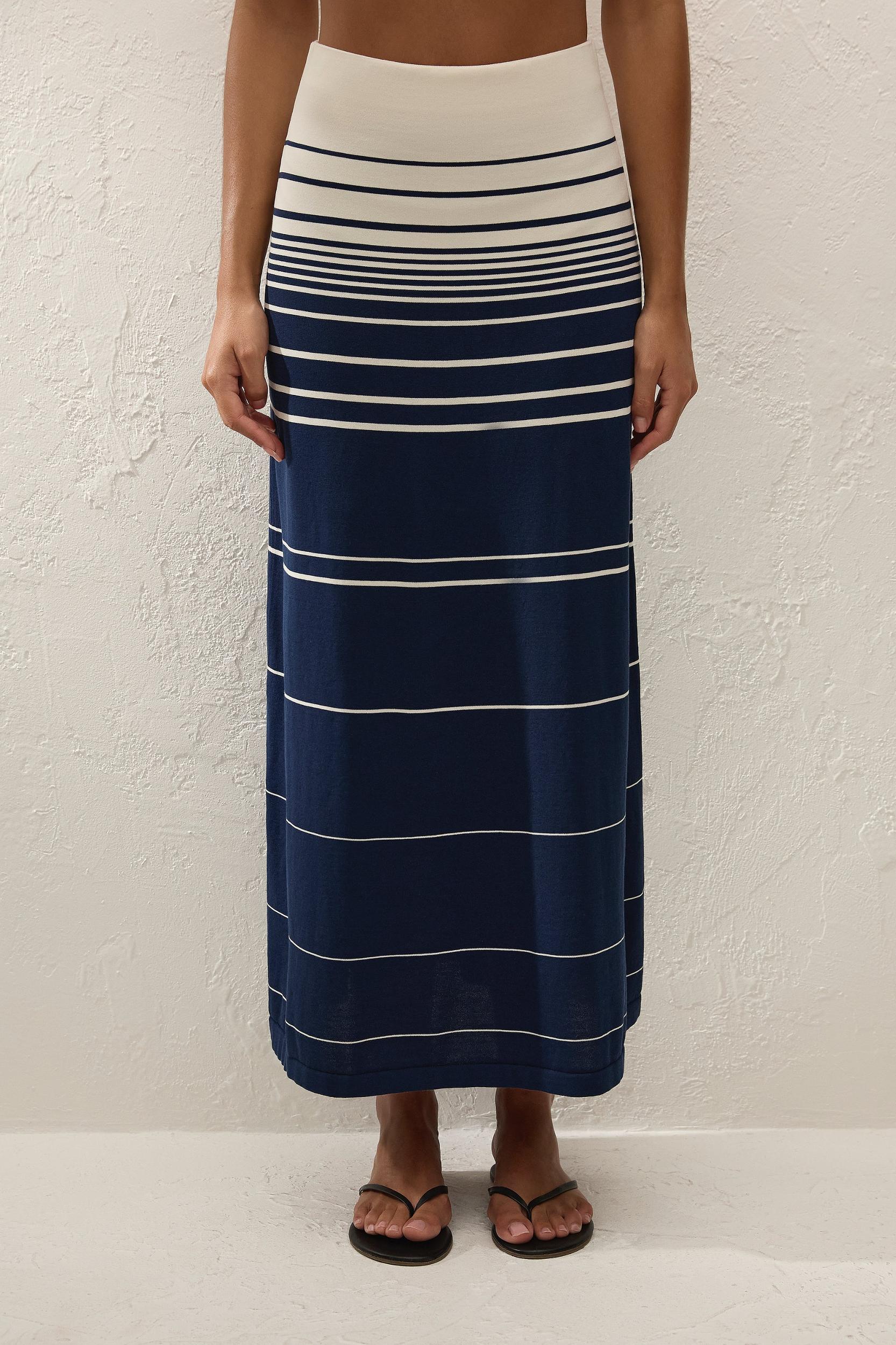 A mid-rise maxi skirt, designed from a signature true knitwear fabrication in a nautical-inspired navy white stripe. Elasticated at the waist, it is a slip-like silhoutte that falls into a relaxed A-line skirt, cropping around the ankles. Style with the matching Arlette Strapless Top for days by the ocean.This style is true to size. As there is elastane woven through the true knitwear fabrication, it offers some additional stretch.
