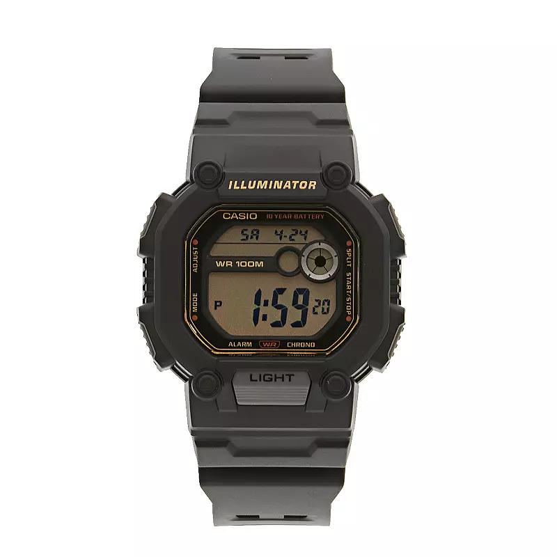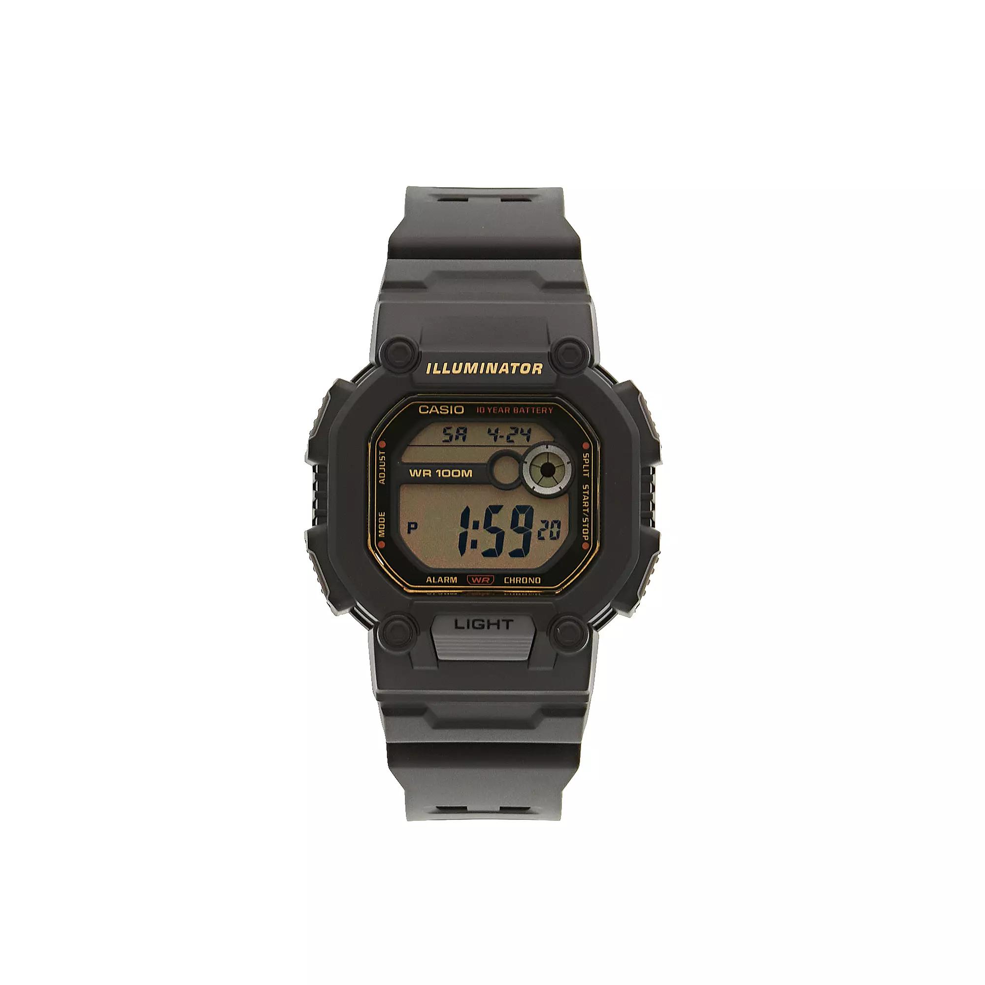 Featuring digital chronograph functionality, this men's Casio watch is sure to match your active lifestyle. Featuring digital chronograph functionality, this men's Casio watch is sure to match your active lifestyle. FEATURES 24-hour chronograph 10-year battery life 1/100-second stopwatch Day & date window Countdown timerDISPLAY Illumination: LED backlight Face cover material: mineral crystalCASE Case shape: square Case material: resin Diameter: 46 mm Screw-down casebackBAND Band type: resin strap Clasp: buckle Circumference: 145 mm - 235 mm Width: 18 mmDETAILS Movement: quartz Power: battery Water resistance: 100M Warranty: manufacturer's 1-year limited For warranty information please click here Model no. W737HX-1AV Size: Large. Color: Black. Gender: male. Age Group: adult.