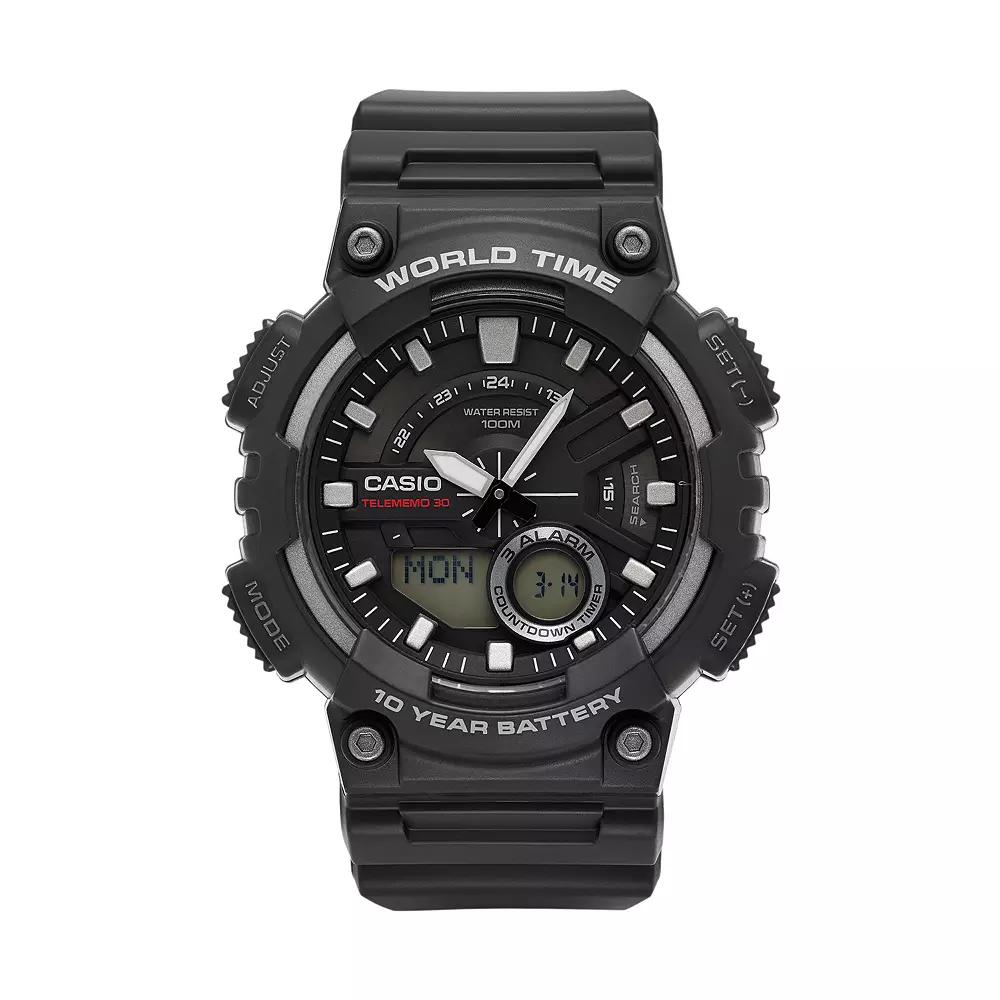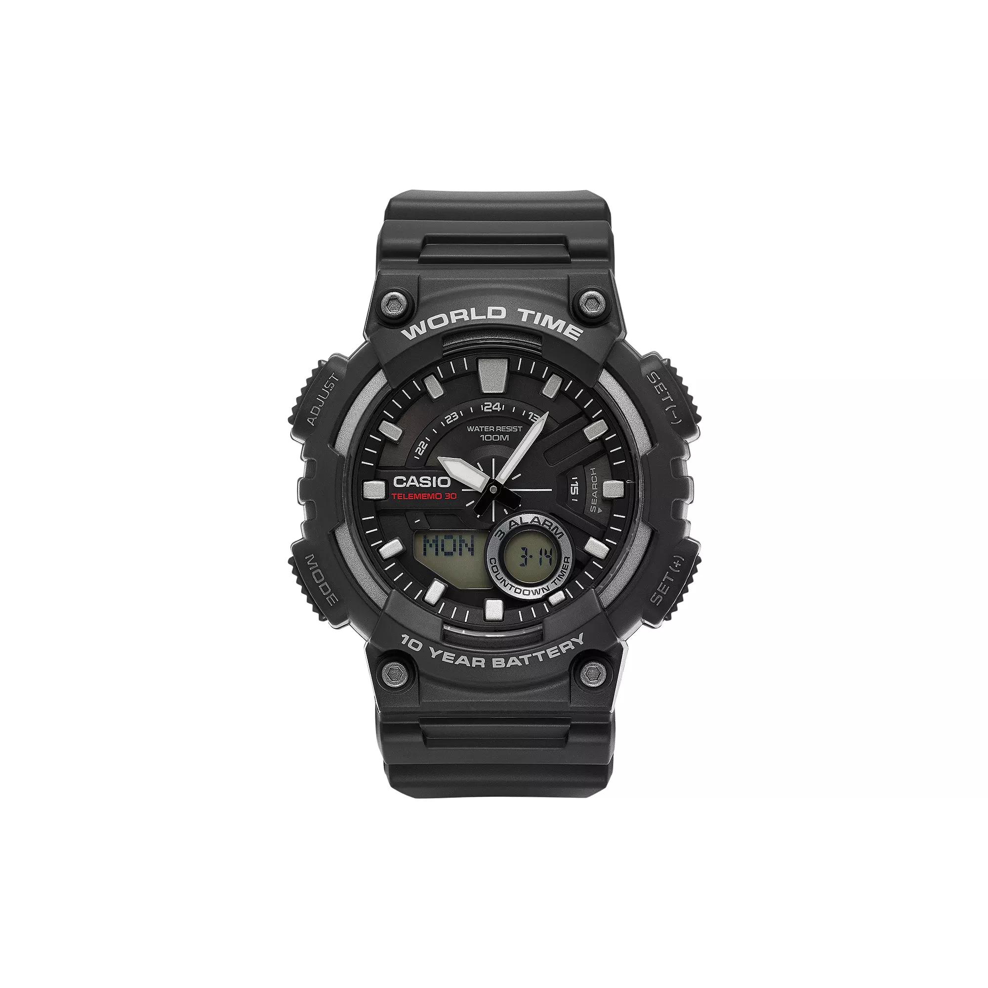 Featuring an extensive telememo databank, precise world time and a handy automatic calendar, this sporty mens analog and digital watch from Casio is designed to take the hassle out of traveling.FEATURES Automatic calendar: day & date; preprogrammed to 2099 3 daily alarms Hourly chime 12/24-hour formats World Time: 29 time zones (30 cities) Daylight saving on/off indicator Chronograph: elapsed, split & 1st-2nd place times; 1/100-second for up to 24 hours Countdown timer: 1 second to 24 hours Telememo capacity: up to 30 sets of data with 8-character name & 16-digit phone number; autosort function CASE & DISPLAY Digital display Black dial Luminous hands Face cover: mineral crystal Case: black resin Caseback: stainless steel 48-mm diameter BAND Black resin Buckle clasp 230-mm circumference 22-mm width DETAILS Quartz movement Battery power Water resistance: 100 meters Manufacturers 1-year limited warranty For warranty information please click here Model no. AEQ110W-1AVCF Size: One Size. Gender: male. Age Group: adult. Material: Plastic.
